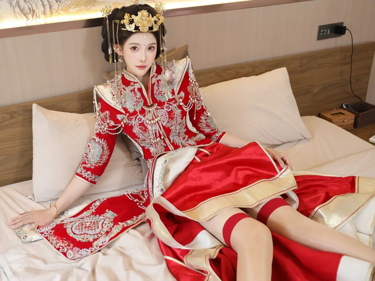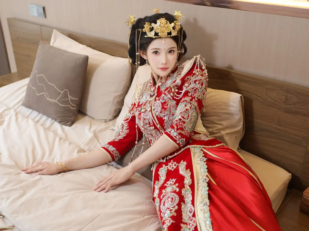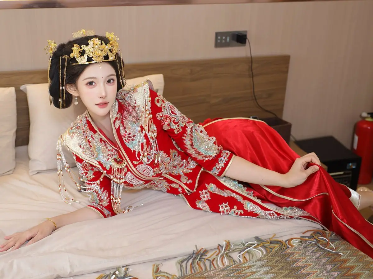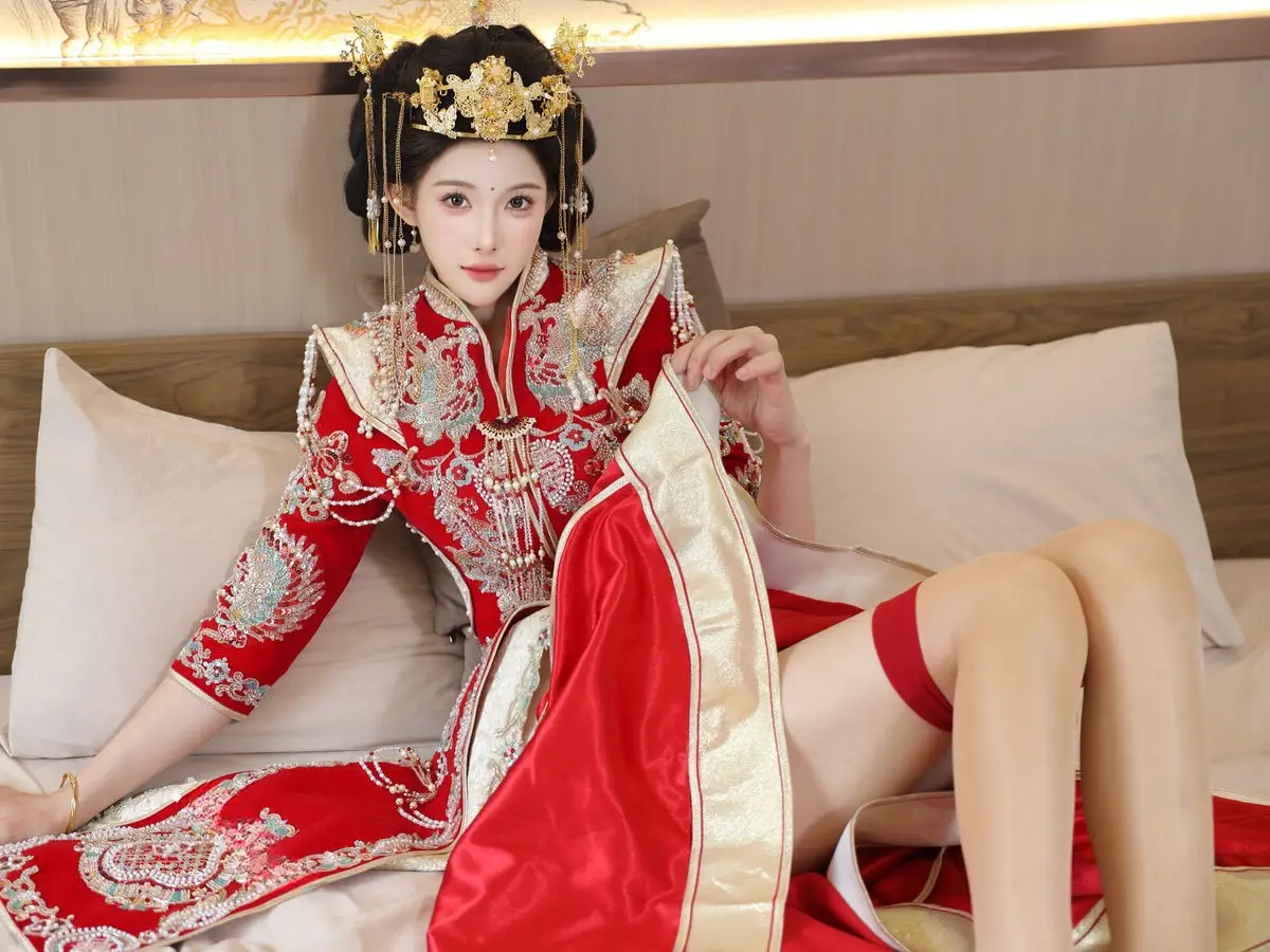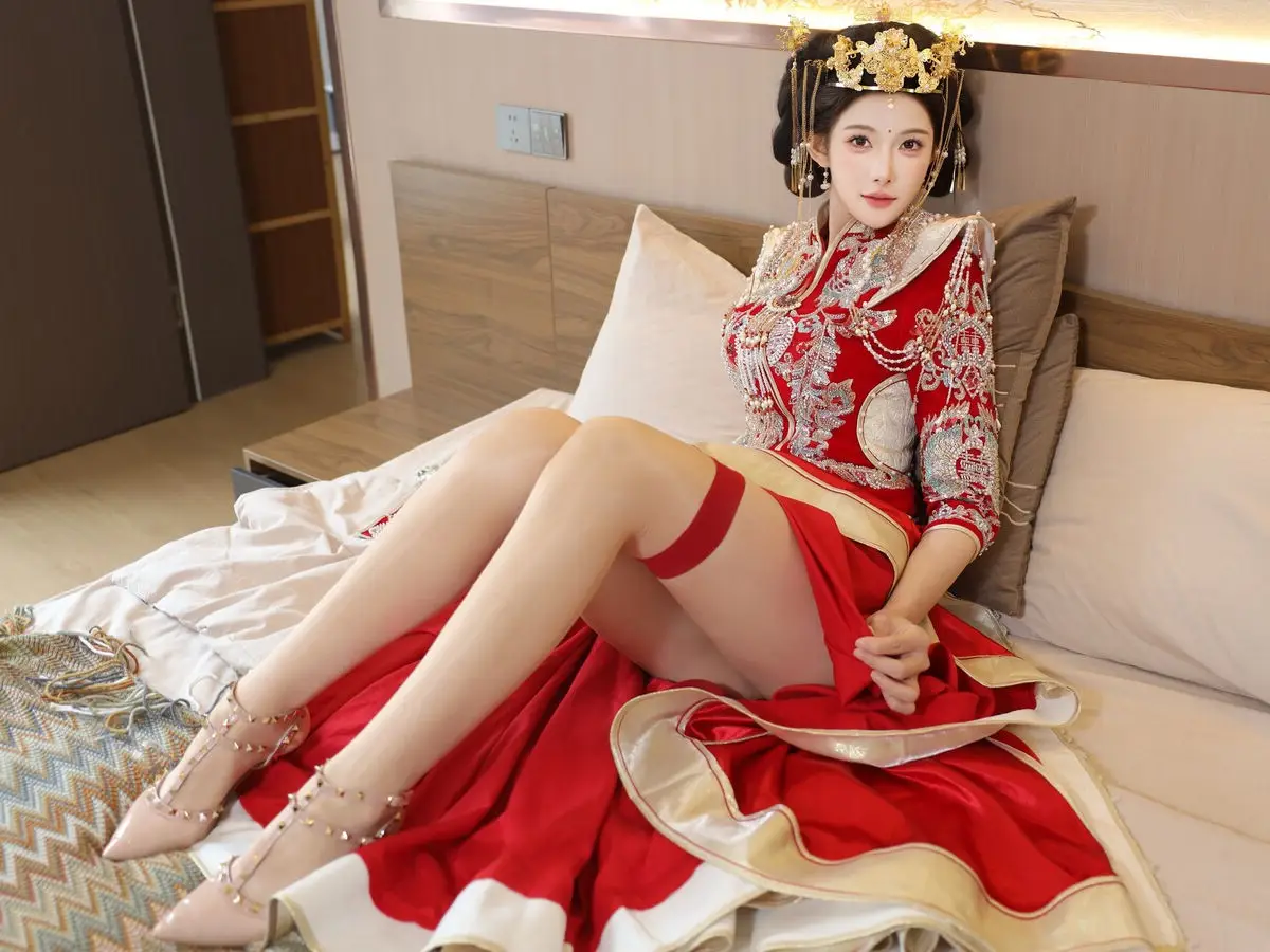 In this captivating image model Li Shuang Er 梨霜儿 commands attention with her elegant and graceful beauty. She is adorned in a traditional Xiùhéfú 秀禾服 a classic Chinese wedding gown meticulously embroidered with intricate details. The vibrant red hue complemented by shimmering gold and silver patterns exudes an aura of luxury and majesty. Her elaborate headpiece and delicate accessories further enhance her regal and sophisticated charm. Li Shuang Er's gentle gaze and serene demeanor beautifully intertwine classic and modern aesthetics. This attire is not merely a garment but a work of art showcasing the meticulous craftsmanship and refined elegance inherent in traditional East Asian culture. This image is part of the XiuRen model Part01 collection#LiShuangEr #Xiùhéfú #TraditionalChineseWeddingDress #AsianBeauty #XiuRen #Model