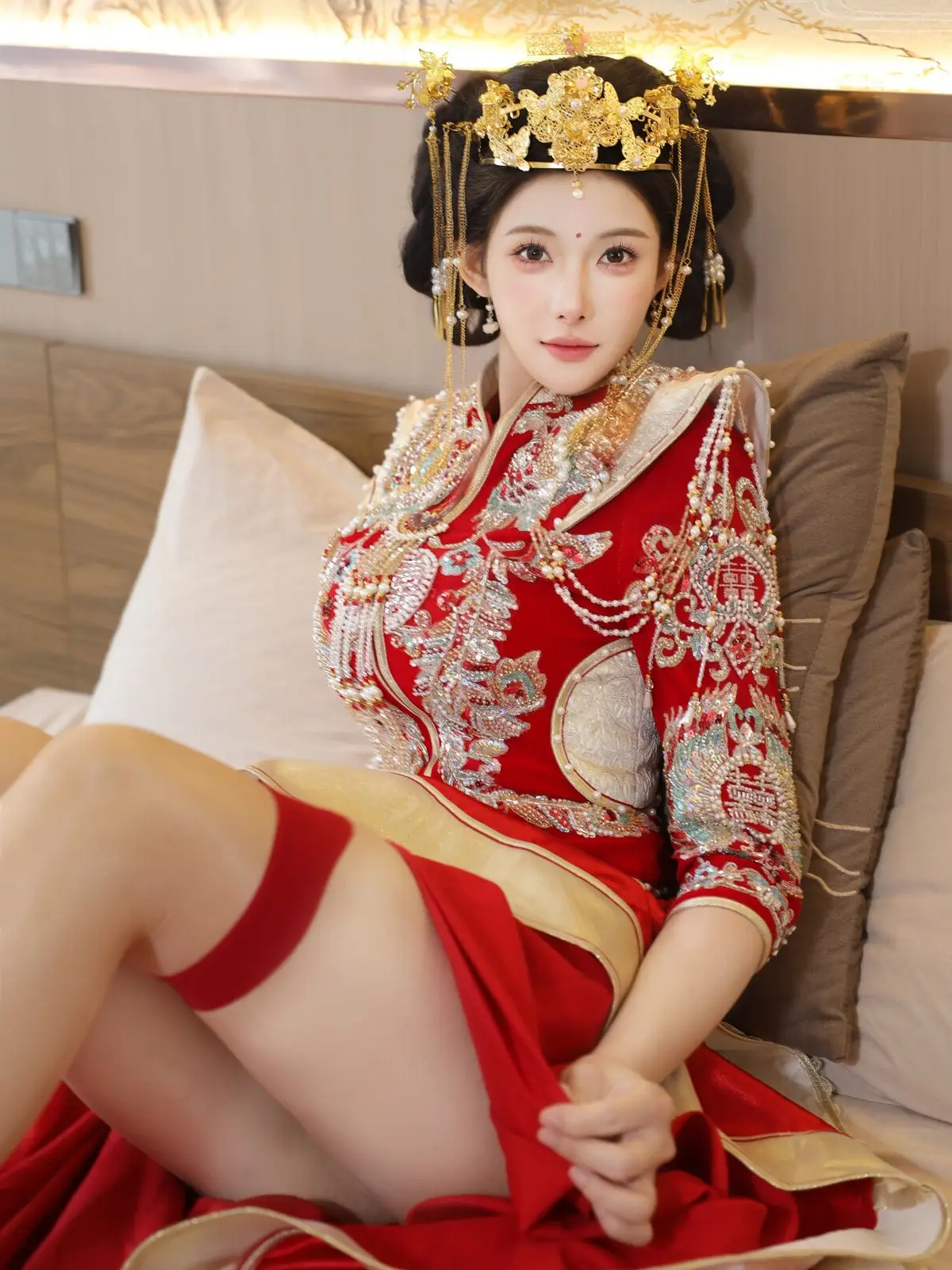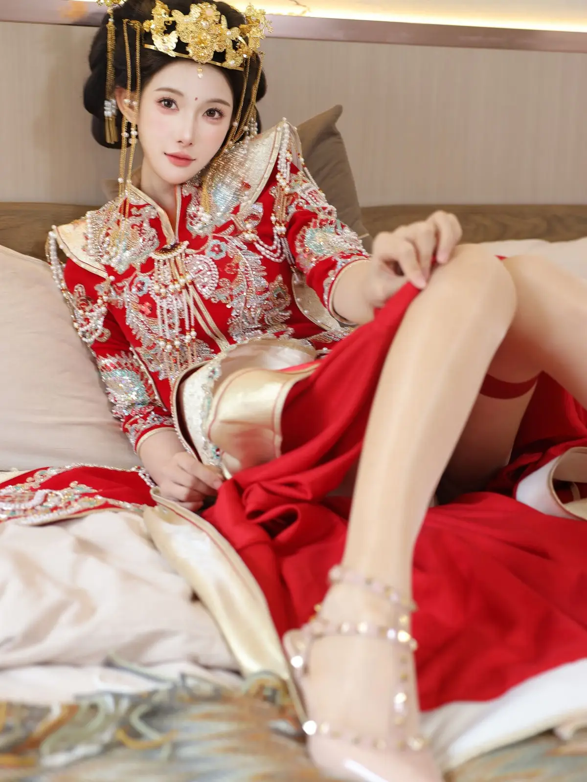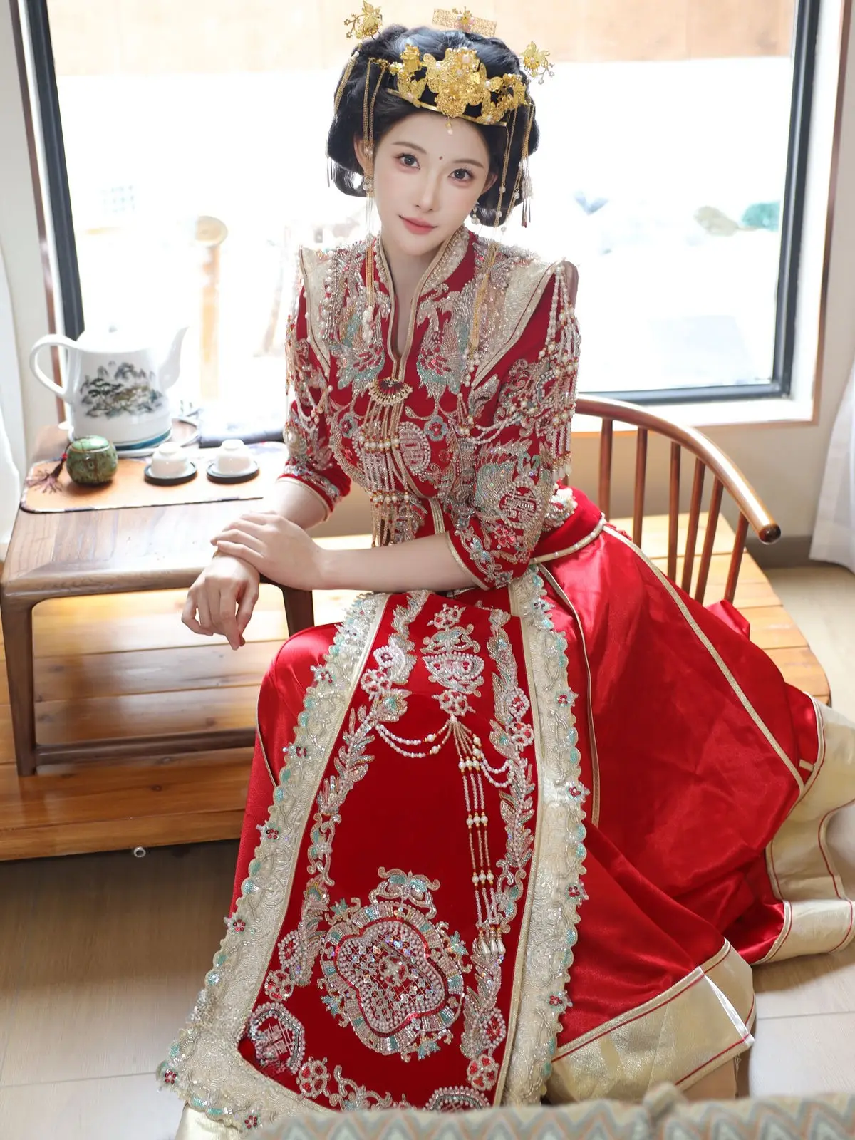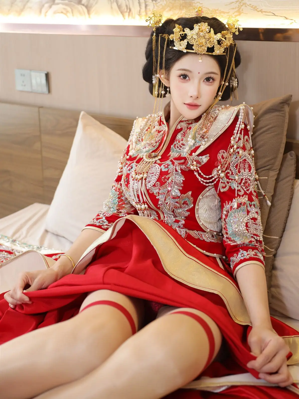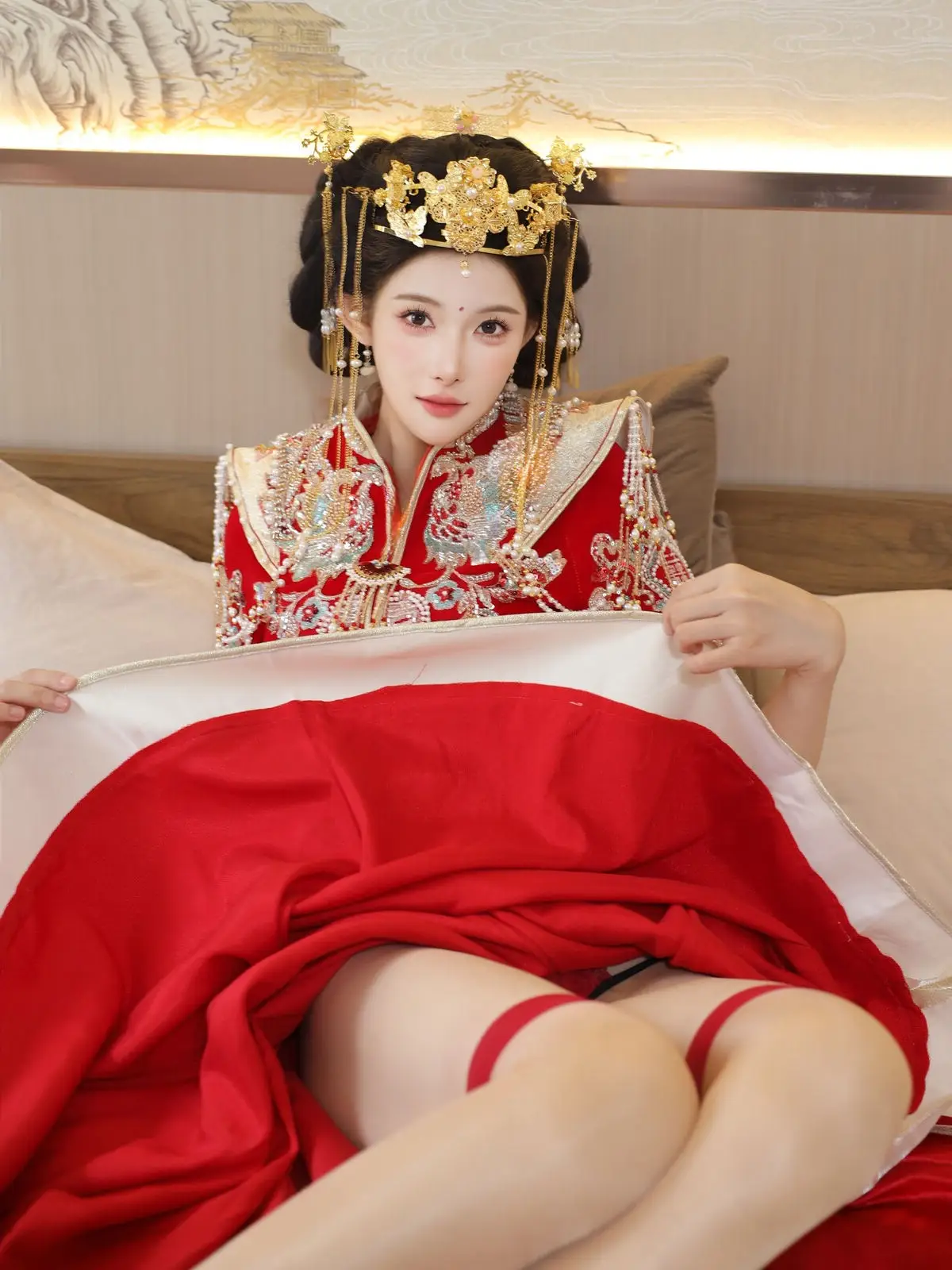 In this captivating image model Li Shuang Er 梨霜儿 commands attention with her elegant and graceful beauty. She is adorned in a traditional Xiùhéfú 秀禾服 a classic Chinese wedding gown meticulously embroidered with intricate details. The vibrant red hue complemented by shimmering gold and silver patterns exudes an aura of luxury and majesty. Her elaborate headpiece and delicate accessories further enhance her regal and sophisticated charm. Li Shuang Er's gentle gaze and serene demeanor beautifully intertwine classic and modern aesthetics. This attire is not merely a garment but a work of art showcasing the meticulous craftsmanship and refined elegance inherent in traditional East Asian culture. This image is part of the XiuRen model Part01 collection#LiShuangEr #Xiùhéfú #TraditionalChineseWeddingDress #AsianBeauty #XiuRen #Model
