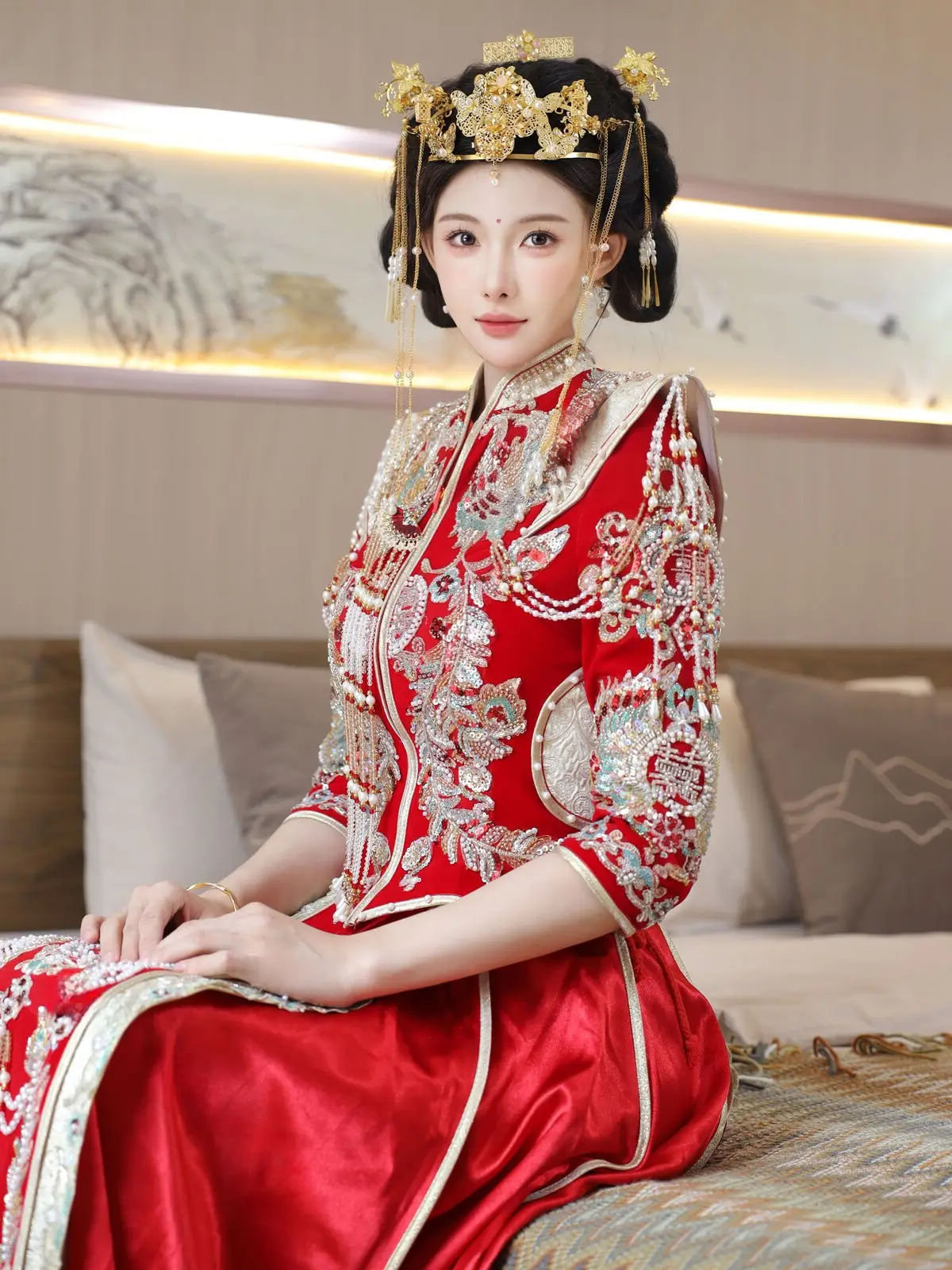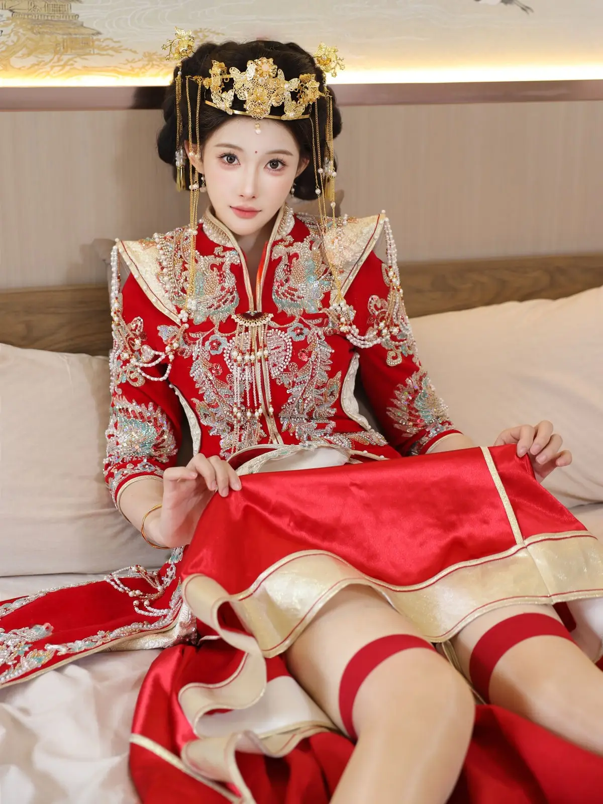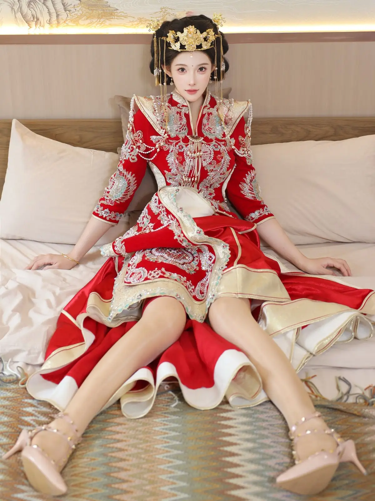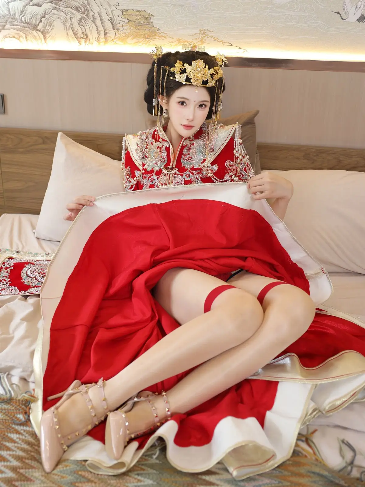In this captivating image model Li Shuang Er 梨霜儿 commands attention with her elegant and graceful beauty. She is adorned in a traditional Xiùhéfú 秀禾服 a classic Chinese wedding gown meticulously embroidered with intricate details. The vibrant red hue complemented by shimmering gold and silver patterns exudes an aura of luxury and majesty. Her elaborate headpiece and delicate accessories further enhance her regal and sophisticated charm. Li Shuang Er's gentle gaze and serene demeanor beautifully intertwine classic and modern aesthetics. This attire is not merely a garment but a work of art showcasing the meticulous craftsmanship and refined elegance inherent in traditional East Asian culture. This image is part of the XiuRen model Part01 collection#LiShuangEr #Xiùhéfú #TraditionalChineseWeddingDress #AsianBeauty #XiuRen #Model