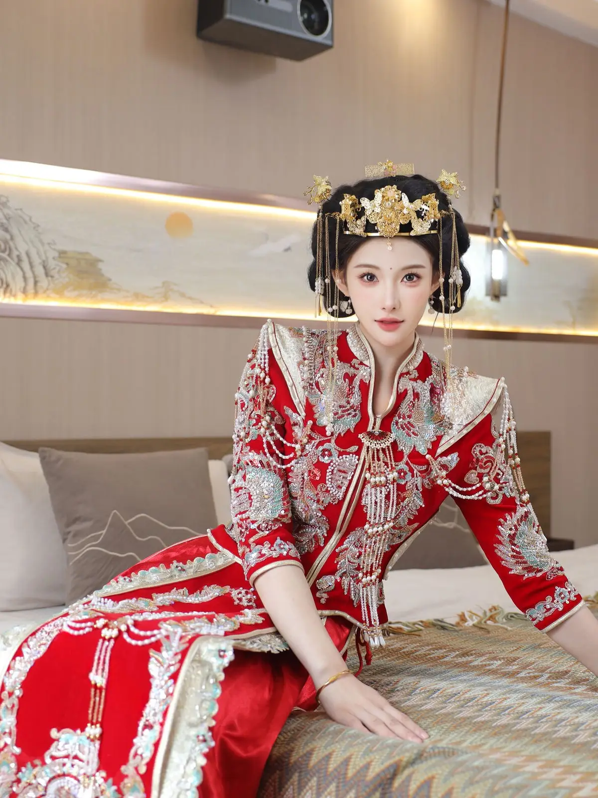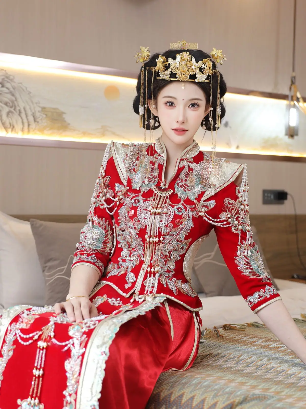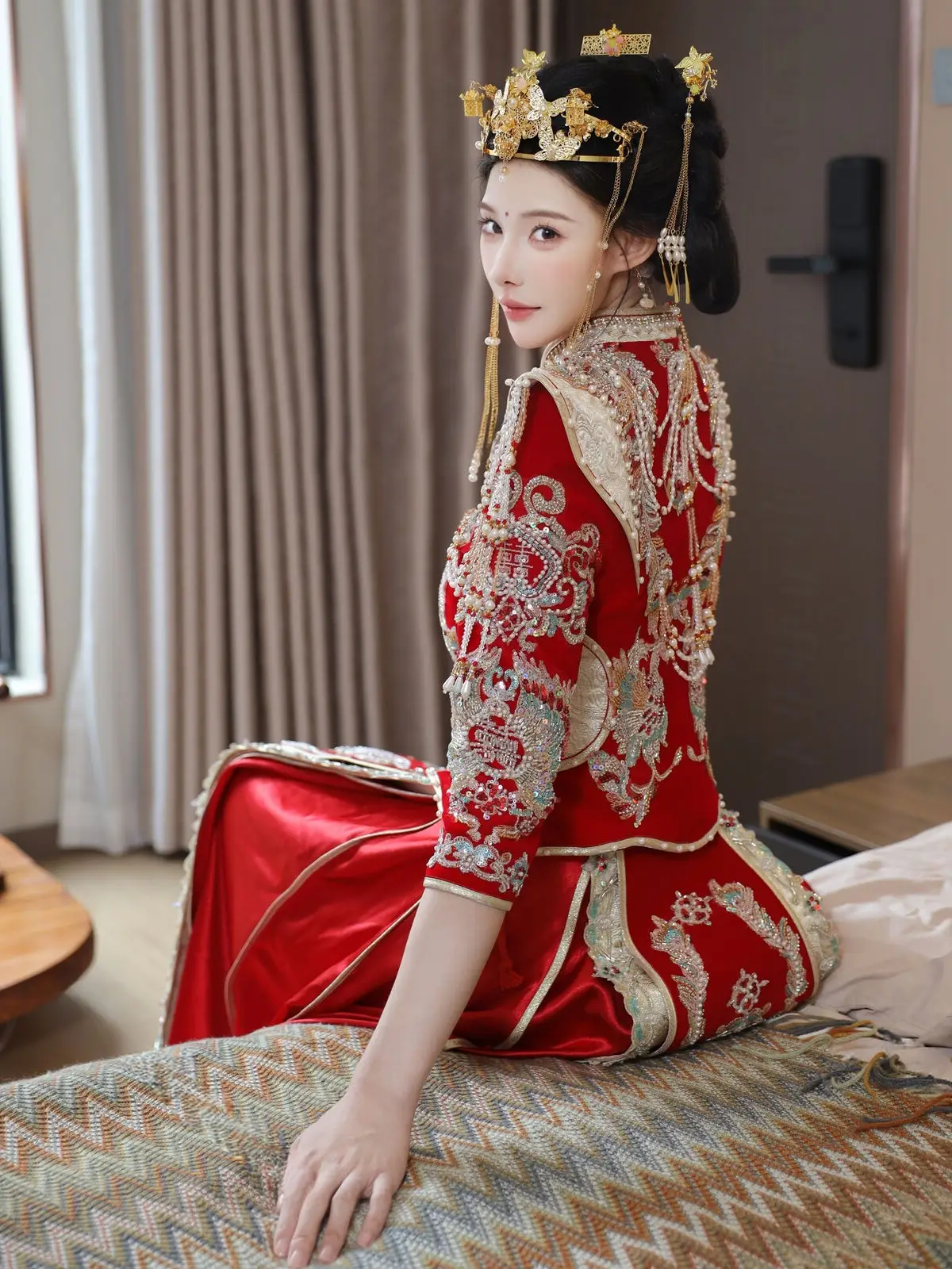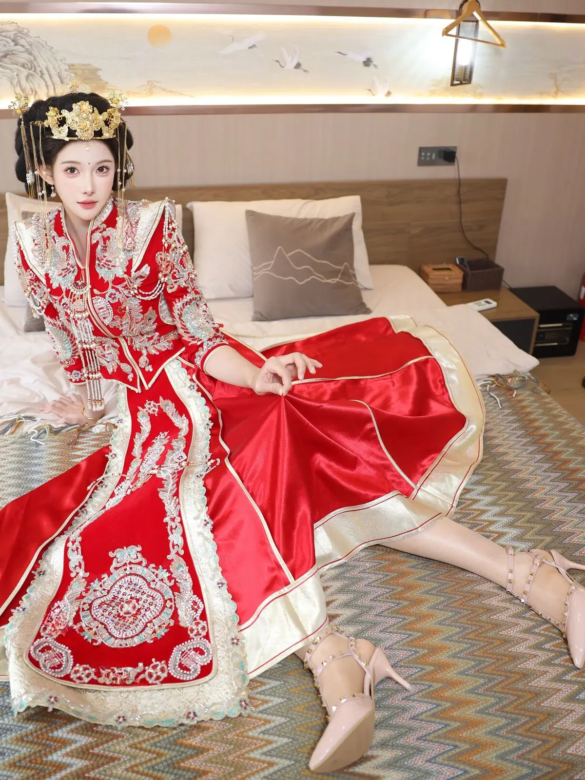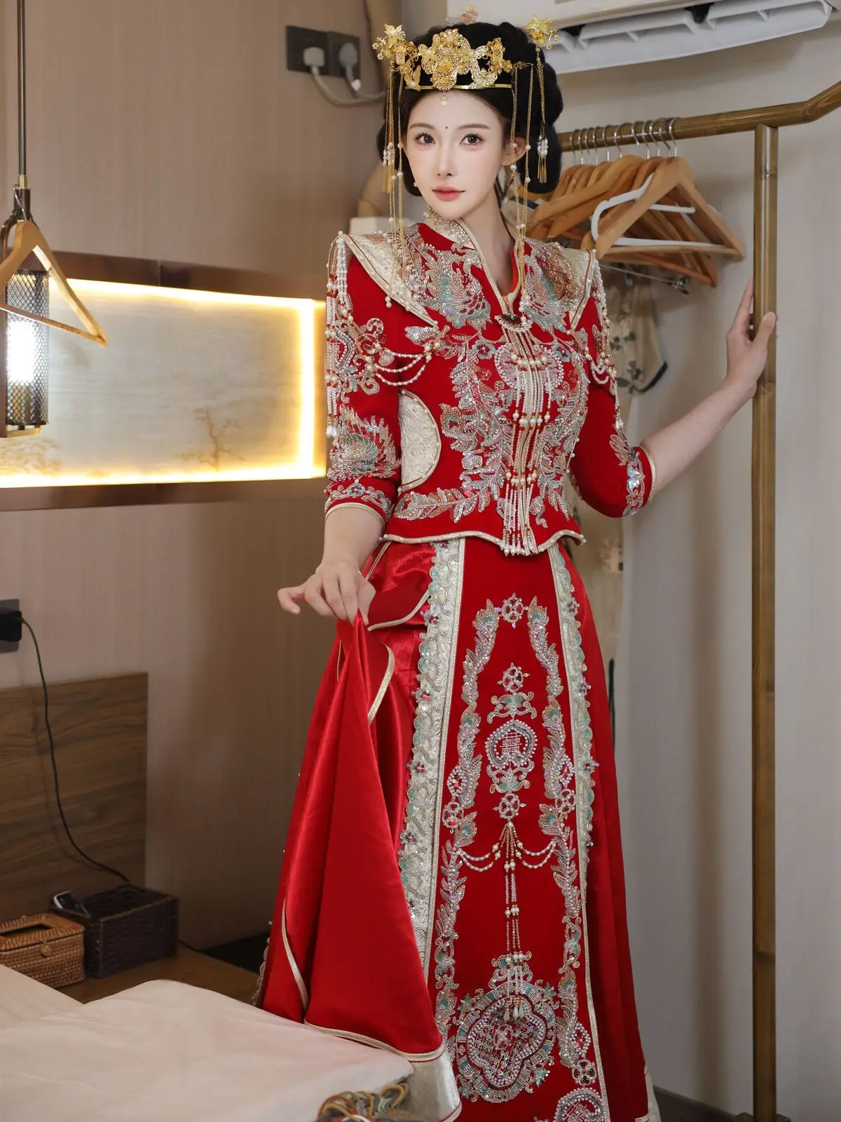 In this captivating image model Li Shuang Er 梨霜儿 commands attention with her elegant and graceful beauty. She is adorned in a traditional Xiùhéfú 秀禾服 a classic Chinese wedding gown meticulously embroidered with intricate details. The vibrant red hue complemented by shimmering gold and silver patterns exudes an aura of luxury and majesty. Her elaborate headpiece and delicate accessories further enhance her regal and sophisticated charm. Li Shuang Er's gentle gaze and serene demeanor beautifully intertwine classic and modern aesthetics. This attire is not merely a garment but a work of art showcasing the meticulous craftsmanship and refined elegance inherent in traditional East Asian culture. This image is part of the XiuRen model Part01 collection#LiShuangEr #Xiùhéfú #TraditionalChineseWeddingDress #AsianBeauty #XiuRen #Model