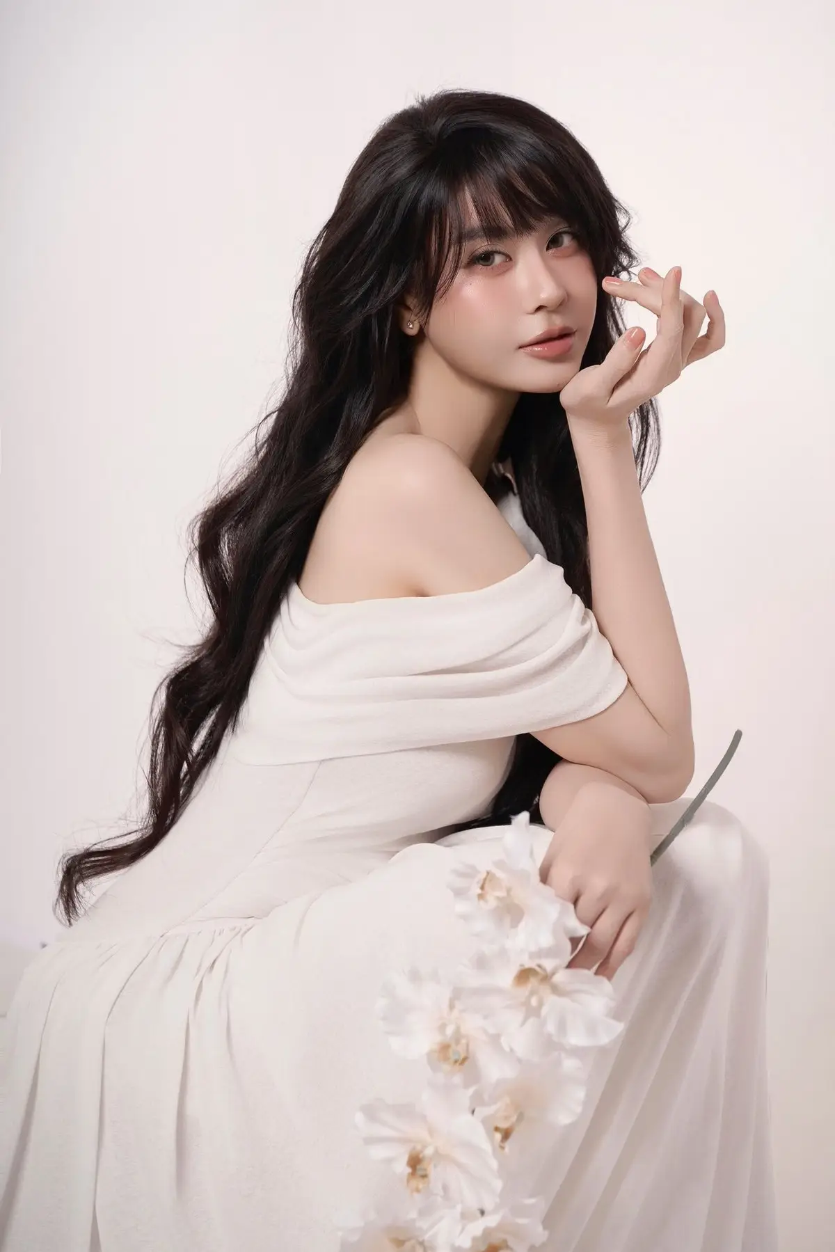 This image captures a beautiful and graceful young woman in an elegant off-shoulder white dress, sitting amidst a space brimming with Christmas cheer. Her gentle smile and fresh eyes perfectly complement the vibrant green of the lavishly decorated Christmas tree and the radiant red gift box. The pristine white maxi dress not only highlights her delicate beauty but also showcases a sophisticated fashion style, ideal for the festive season. The photograph evokes a sense of warmth, serenity, and the joy of welcoming a peaceful and happy Christmas. It's a sweet, poetic moment that offers endless inspiration for those who appreciate beauty and the festive atmosphere.#GracefulWhiteDress #WarmChristmas #HolidayFashion #ElegantGirl #ChristmasStyle