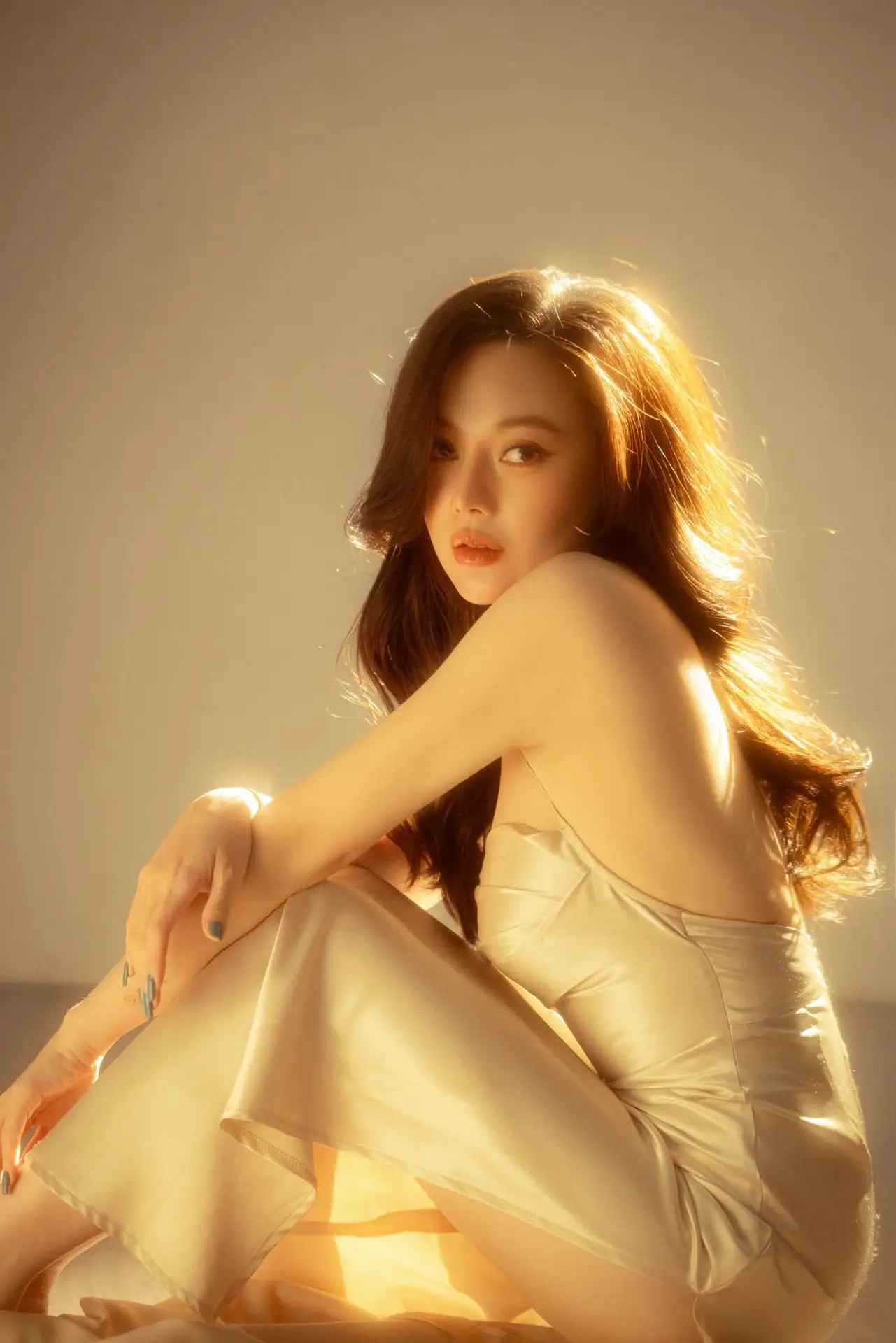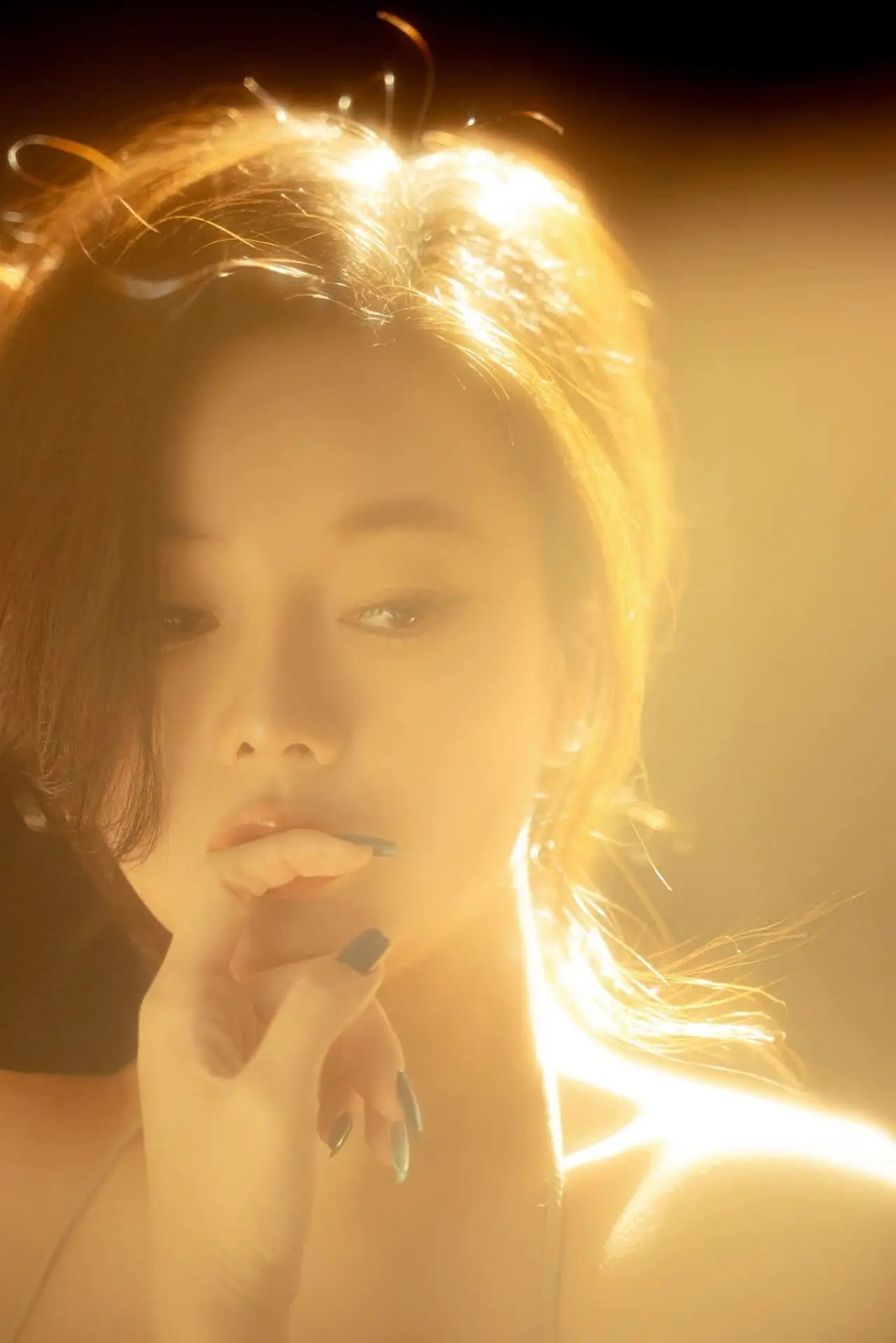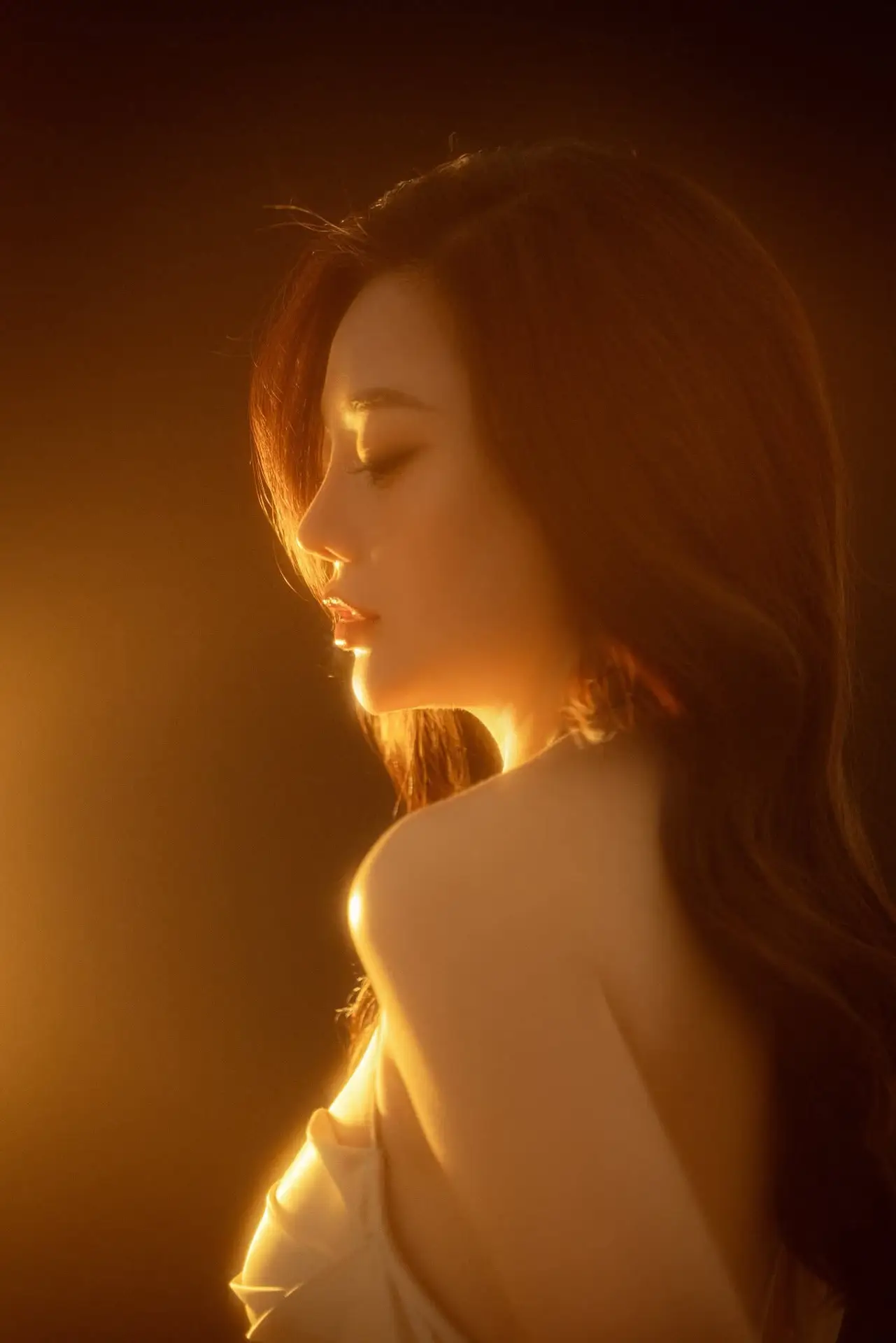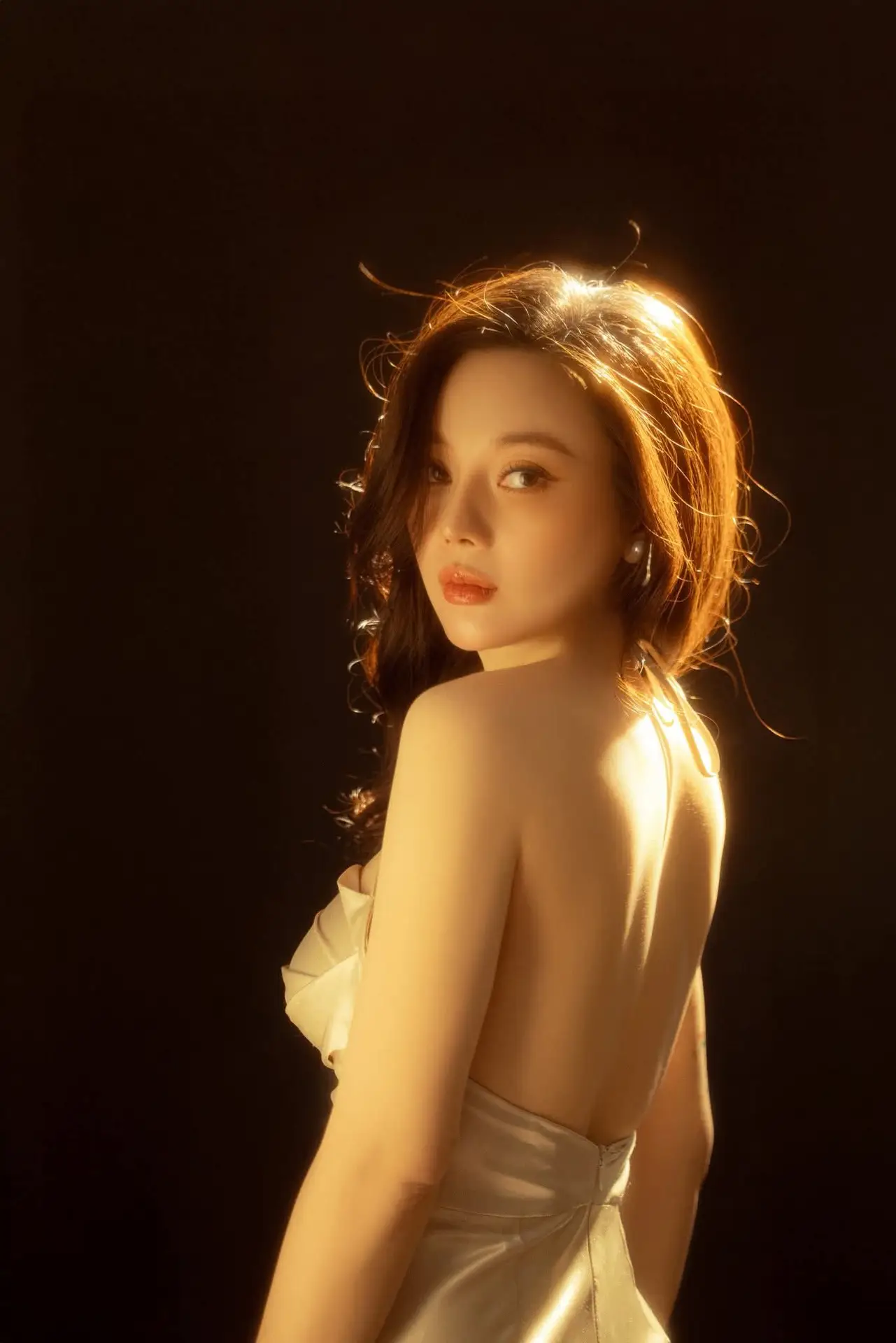 This captivating portrait features a woman of elegant beauty, bathed in a warm golden light. The backlight creates a shimmering halo around her hair and bare shoulder, evoking a magical, dreamy atmosphere reminiscent of a sunset glow. Her gaze, direct and alluring, holds a hint of mystery, inviting viewers to look closer. The simple yet sophisticated backless dress enhances her sensual and luxurious appeal. The entire image exudes an irresistible charm, a perfect blend of photographic artistry and the model's natural grace, making it a truly mesmerizing piece.#ArtisticPortrait #AlluringBeauty #GoldenLight #Elegance #MusePortrait