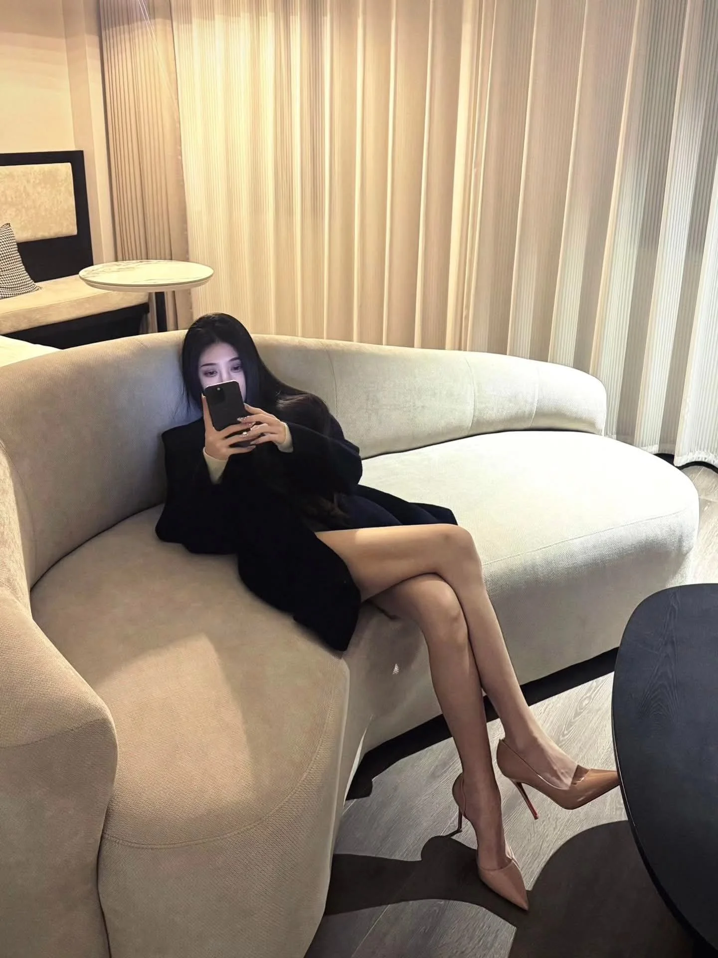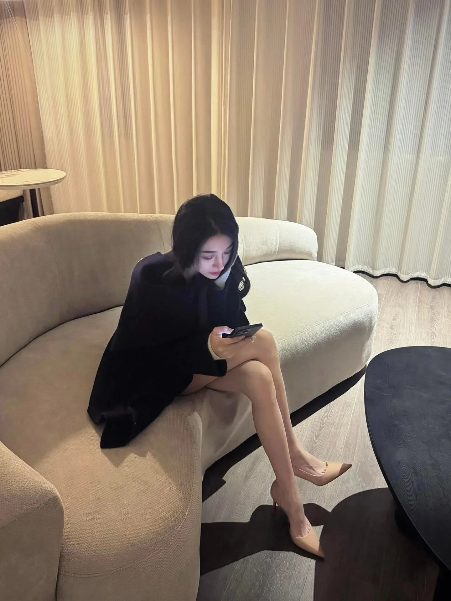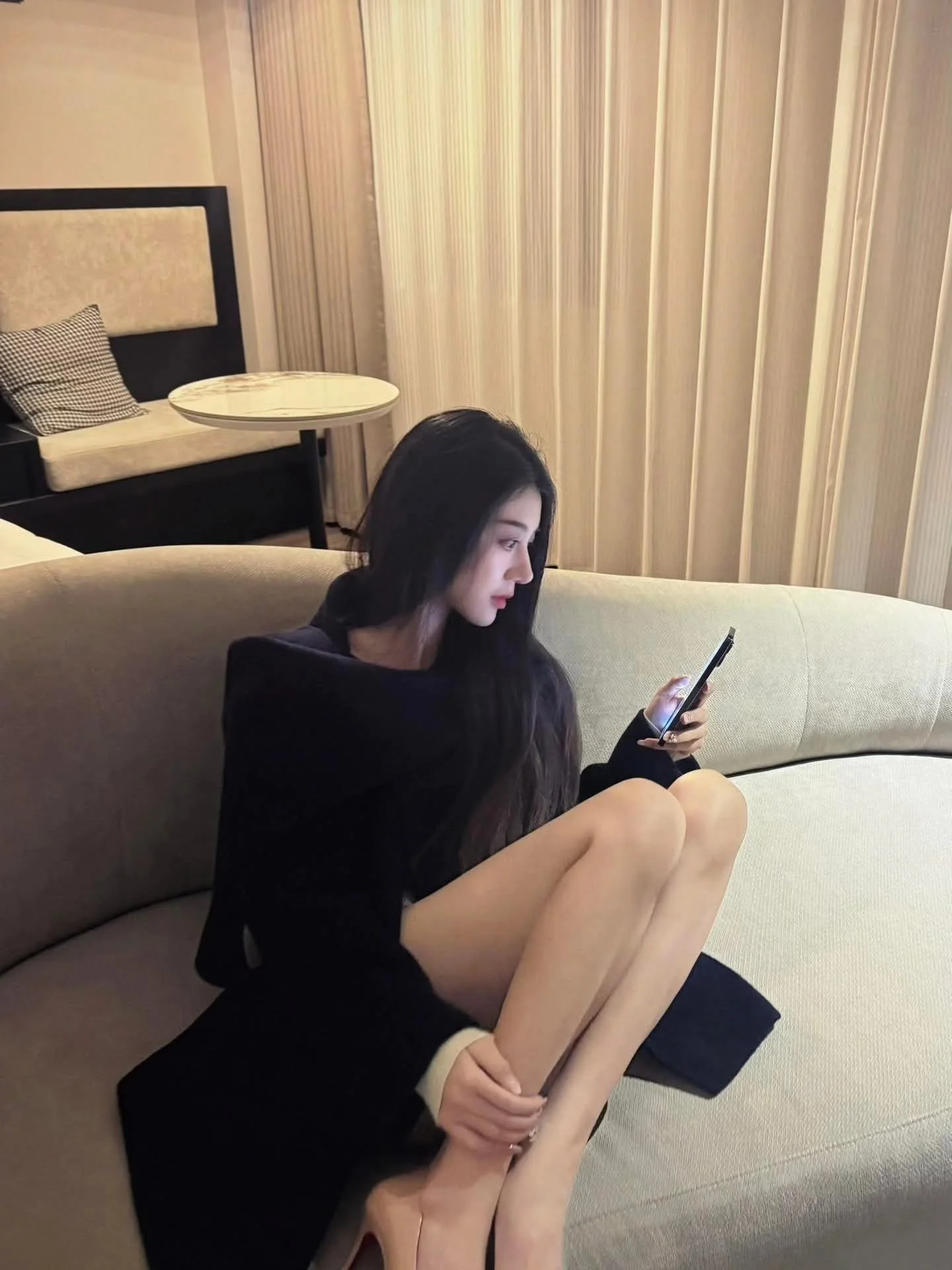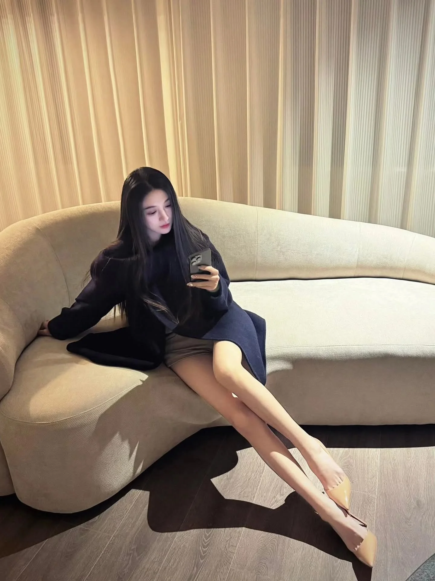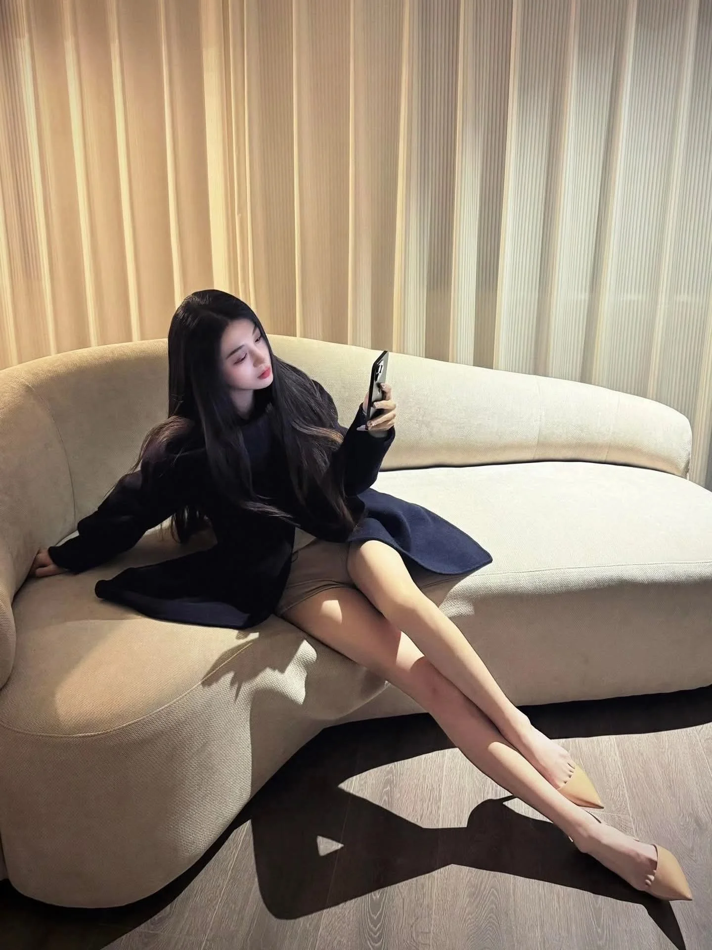 The image captures a peaceful and utterly captivating moment of a young woman. She sits relaxed on a comfortable sofa, her long dark hair flowing, eyes focused on her phone. Her dark outfit, with its unique design, subtly highlights her slender legs, creating a distinctive and subtly sensual style. The warm, inviting surroundings, bathed in soft light, further accentuate her alluring beauty and unique aura. This is a private moment where natural beauty and comfort intertwine, offering viewers a sense of relaxation and charm. This image not only showcases unique fashion sense but also evokes a serene, contemplative evening.#CaptivatingWoman #PersonalStyle #RelaxingAtHome #AlluringBeauty #UniqueFashion