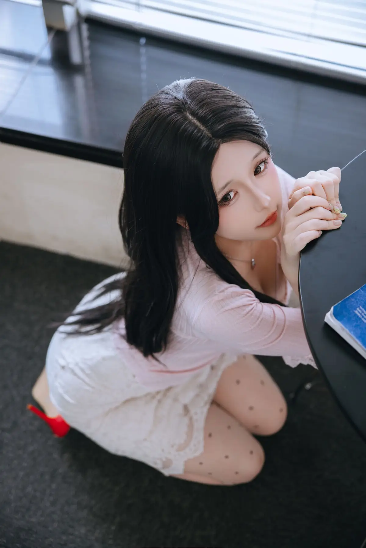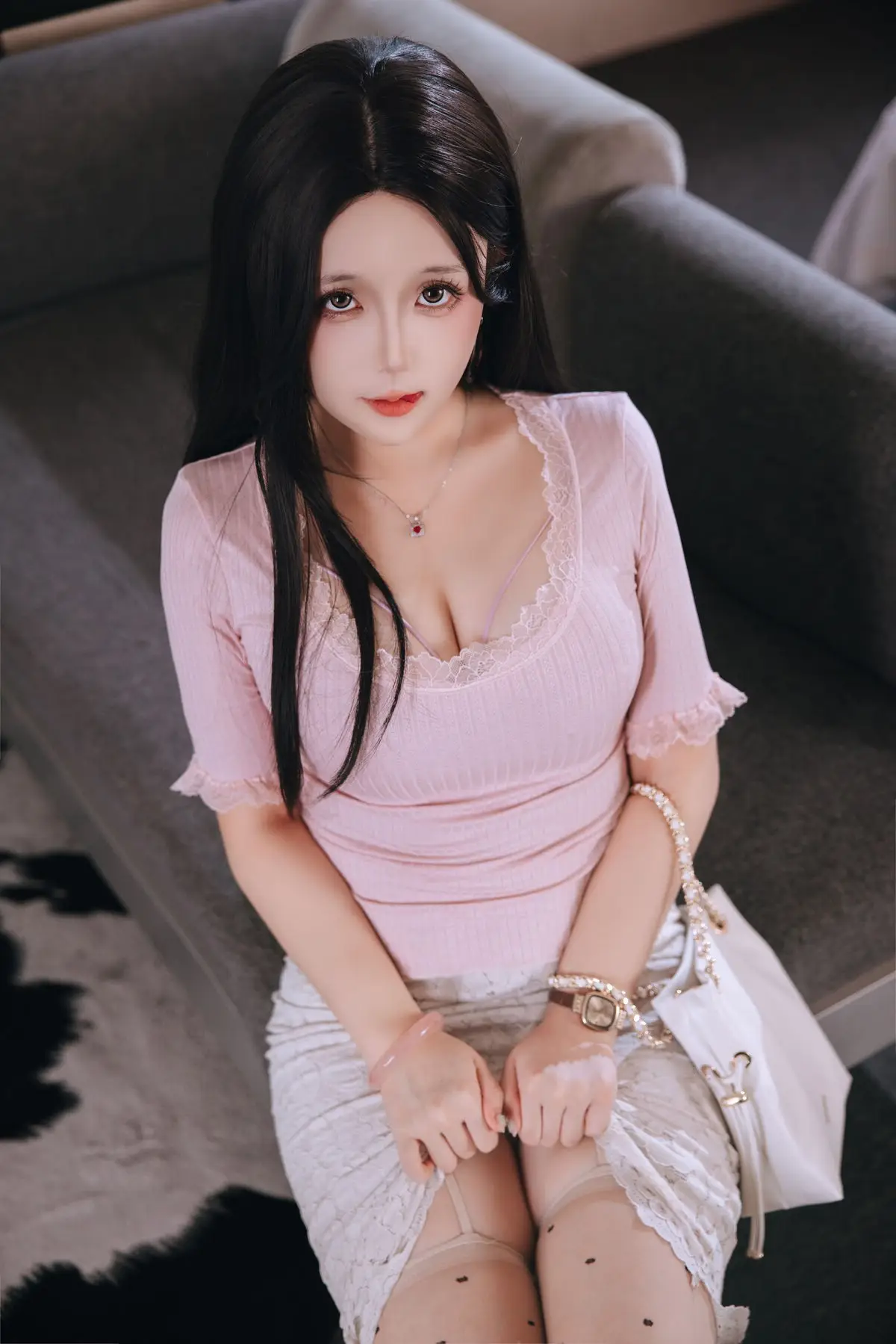 This image beautifully captures Coser Ri Nai Jiao's captivating charm. She poses gracefully on a sofa exuding elegance in a soft pink top and a delicate white lace skirt that highlights her graceful silhouette. Her slender legs are accentuated by sheer polka-dot stockings and vibrant red high heels adding a touch of bold sophistication. With a direct gaze and a confident posture Ri Nai Jiao embodies the alluring theme of Temptation of the Ex-wife Part02. The photograph masterfully portrays her professional artistry presenting a woman who is both sophisticated and undeniably enchanting.#Coser #RiNaiJiao #ExWifesTemptation #AlluringBeauty #CosplayGirl #FashionPhotography