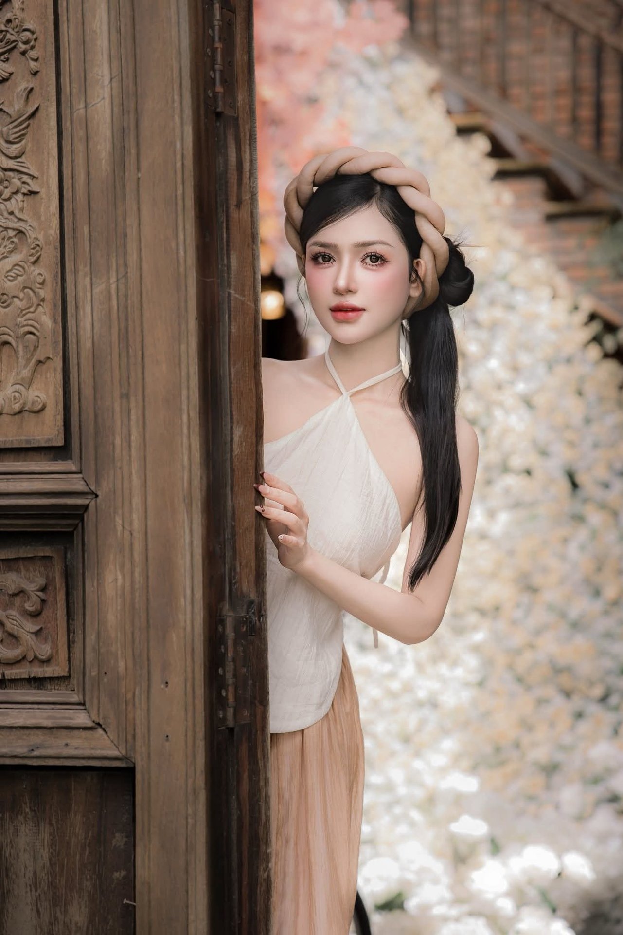 Image 1000019532.jpg beautifully captures an enchanting East Asian traditional beauty. The central figure is a young woman with a gentle smile and serene eyes. She is adorned in traditional attire featuring soft pastel pink and white hues exuding elegance and refinement reminiscent of ancient cultural charm. Every detail of her flowing garment is meticulously designed accentuating her graceful beauty and ethereal presence. Her neatly styled updo and delicate accessories further enhance her captivating allure. The softly blurred background serves as a subtle backdrop allowing her serene beauty to shine transporting viewers into a fairytale-like scene. This image symbolizes the harmonious blend of human beauty and the essence of traditional culture.Đông Hoàng