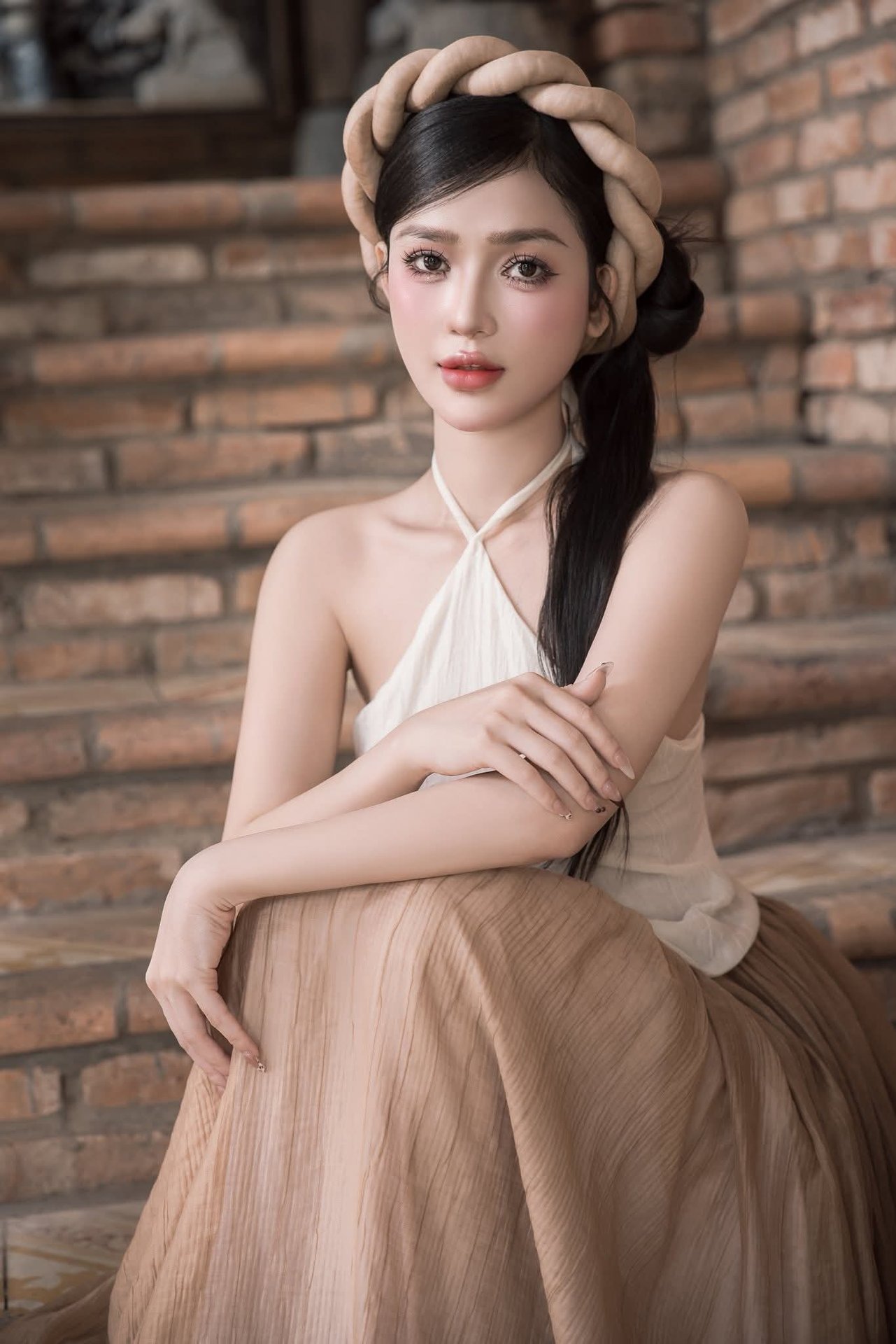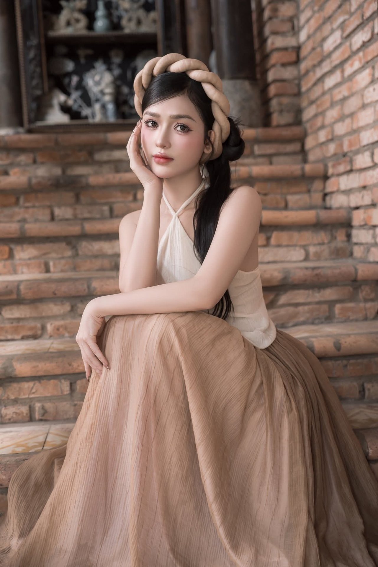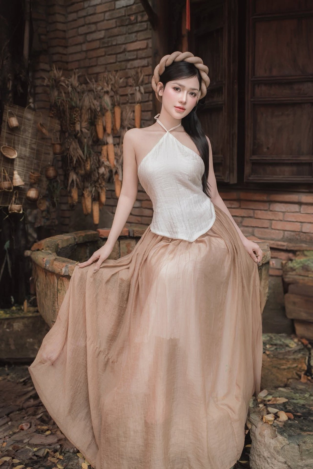 This photograph captures the elegant and graceful beauty of a Vietnamese girl in traditional-inspired attire. The girl stands out with her pristine white Ao Yem top combined with a flowing long beige skirt creating a harmonious and captivating overall look. Her gentle beauty radiates from her eyes a soft smile and neatly braided hair highlighting her delicate facial features. The ancient setting with brick walls and rustic potted plants further emphasizes her pure beauty evoking deep traditional cultural values. This is a subtle blend of classic beauty and modern style honoring the timeless charm of Vietnamese women.