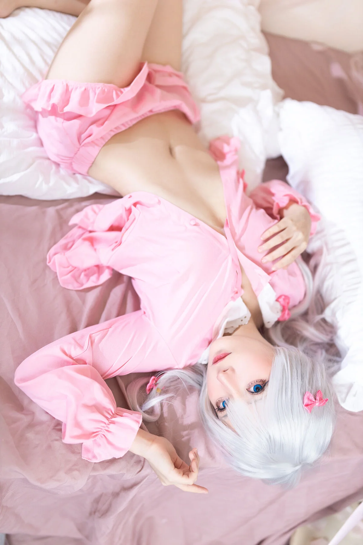 For fashion enthusiasts, this set showcases how loungewear can be both comfortable and visually captivating. The minimalist bedroom setting, coupled with carefully curated props, offers endless inspiration for interior design and indoor portraiture. Whether you are a fan of anime culture or simply an admirer of fine art photography, this gallery provides a refreshing take on character interpretation, blending Japanese pop culture with a sophisticated Western visual palette. Experience the harmony of pastel tones and gentle emotions in this meticulously crafted visual journey.