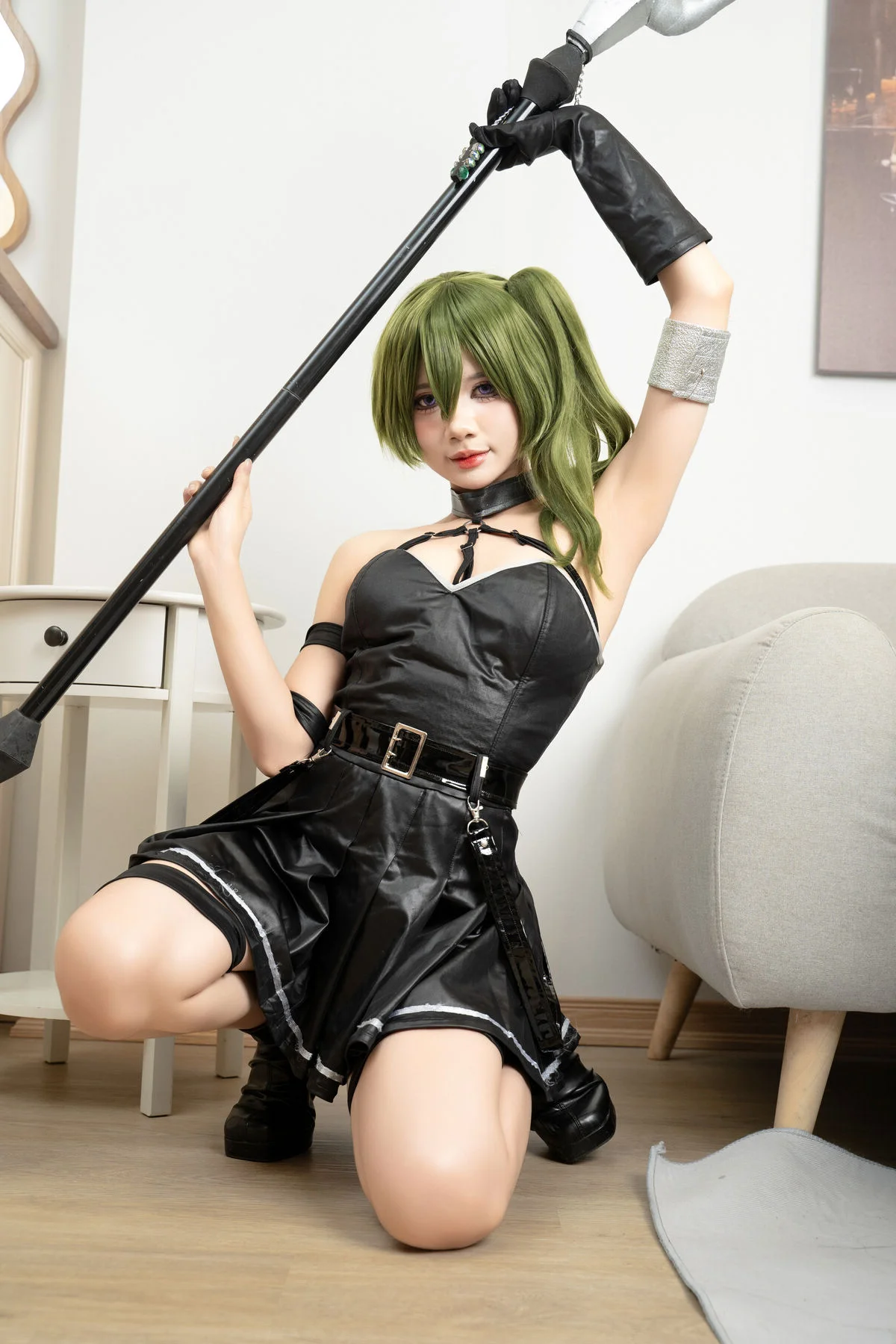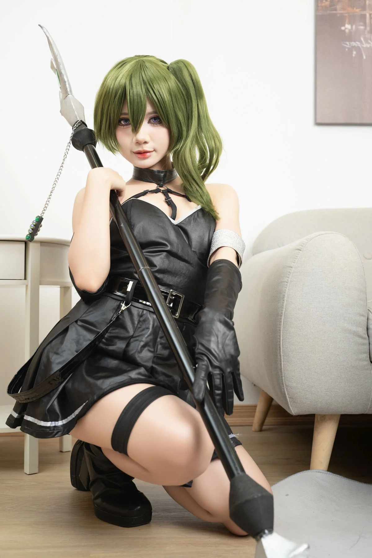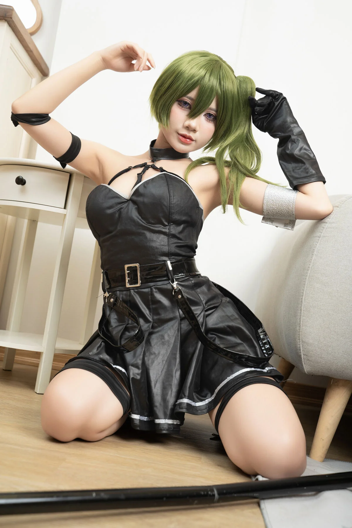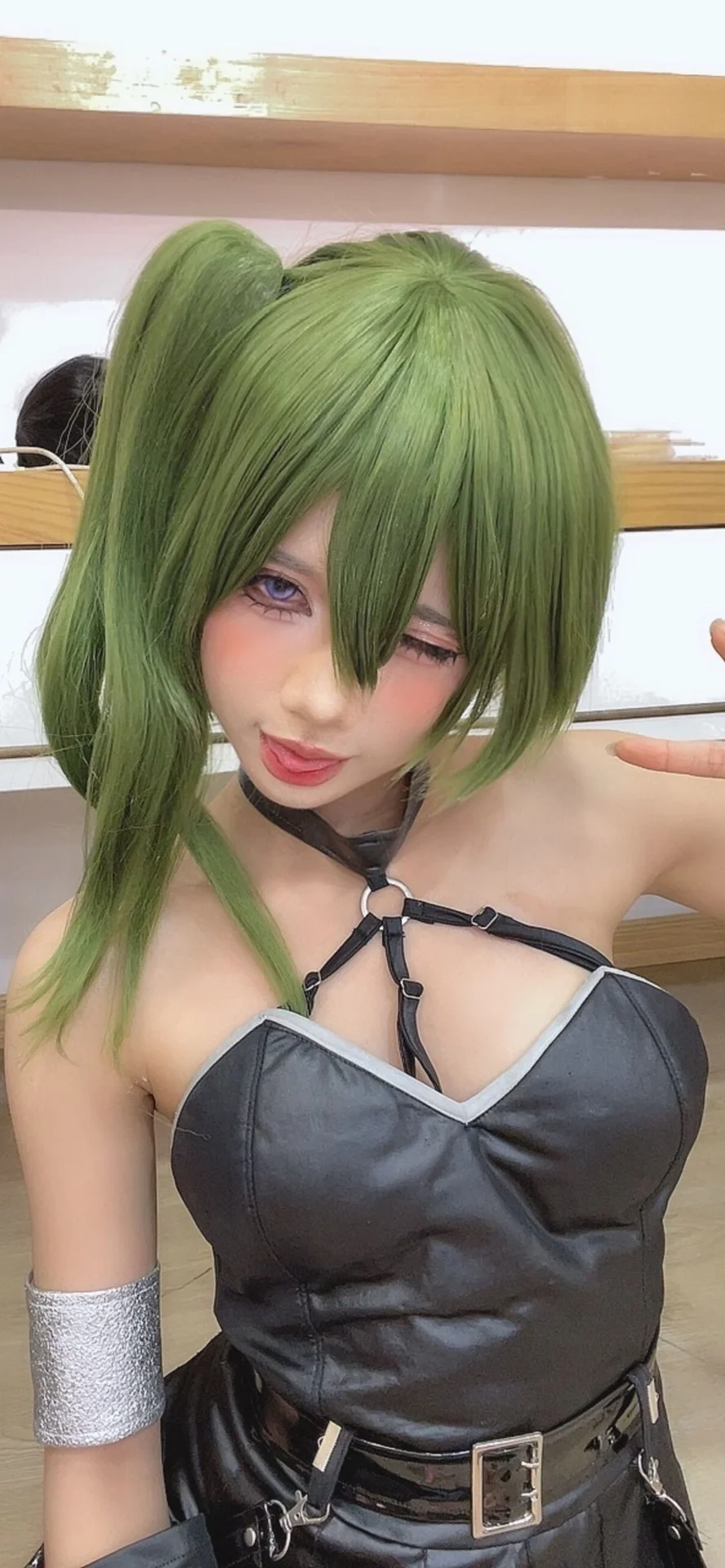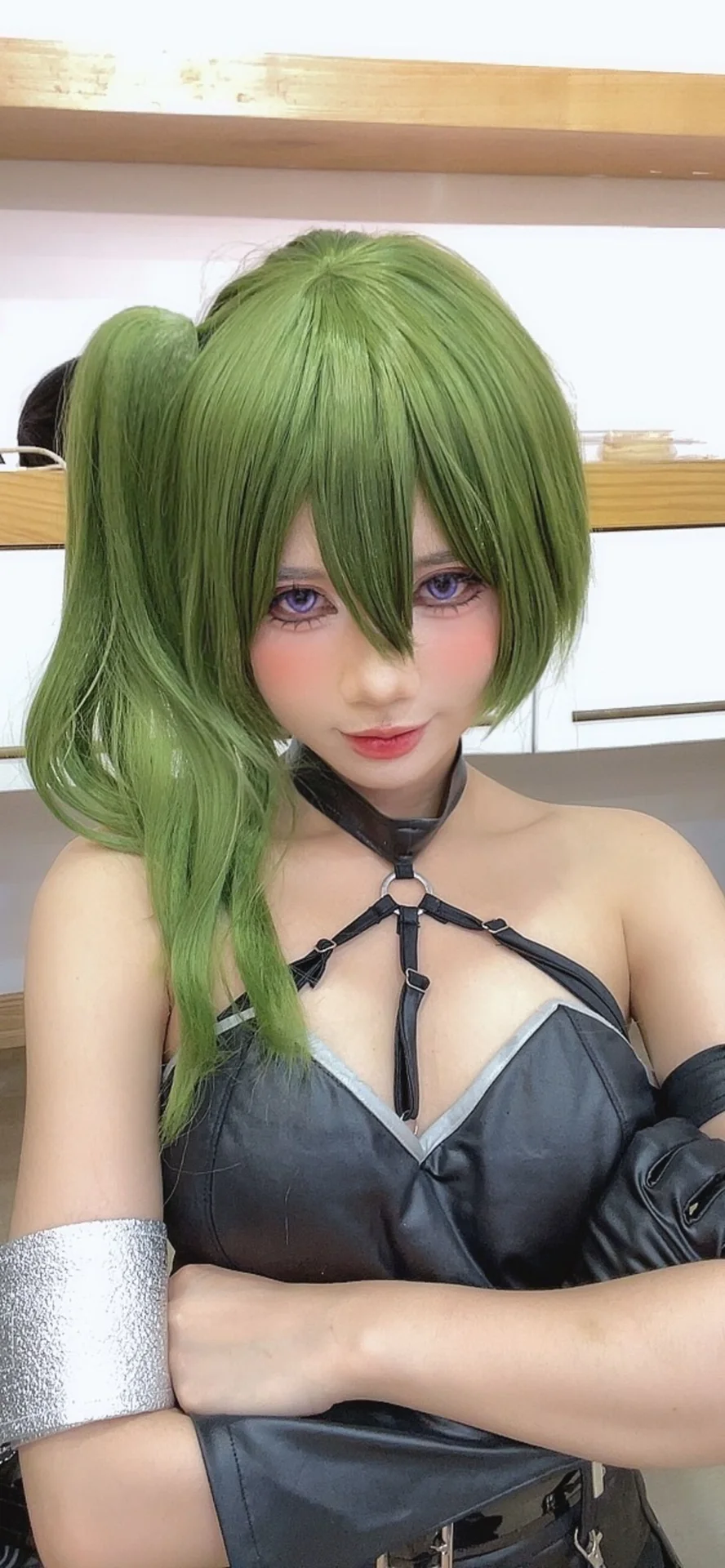 This stunning portrait captures the enigmatic essence of Ubel, brought to life by the talented PoppaChan with a perfect blend of mystery and charm. The playful wink and sharp gaze reflect a personality that is as dangerous as it is alluring, drawing the viewer into her world with effortless ease. The vibrant moss-green hair provides a striking contrast against the dark, edgy ensemble, which features a sophisticated mix of leather textures and metallic accents. Every detail, from the delicate choker to the sleek silver armbands, speaks to a high level of fashion sensibility and an eye for visual storytelling. The overall mood is one of quiet confidence and rebellious elegance, making it feel more like a high-fashion editorial than a traditional cosplay shoot. It is an inspiring tribute to the character complex nature, showcasing a masterful command of expression and style that leaves a lasting impression on anyone who appreciates the art of transformation and visual aesthetics.