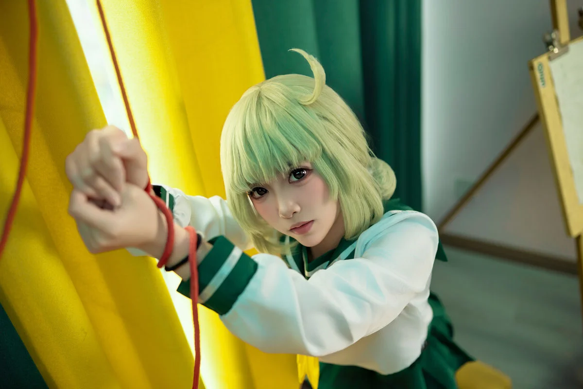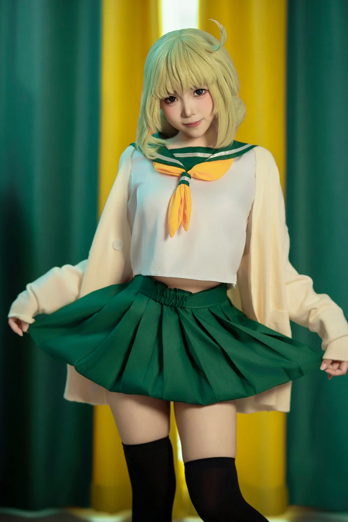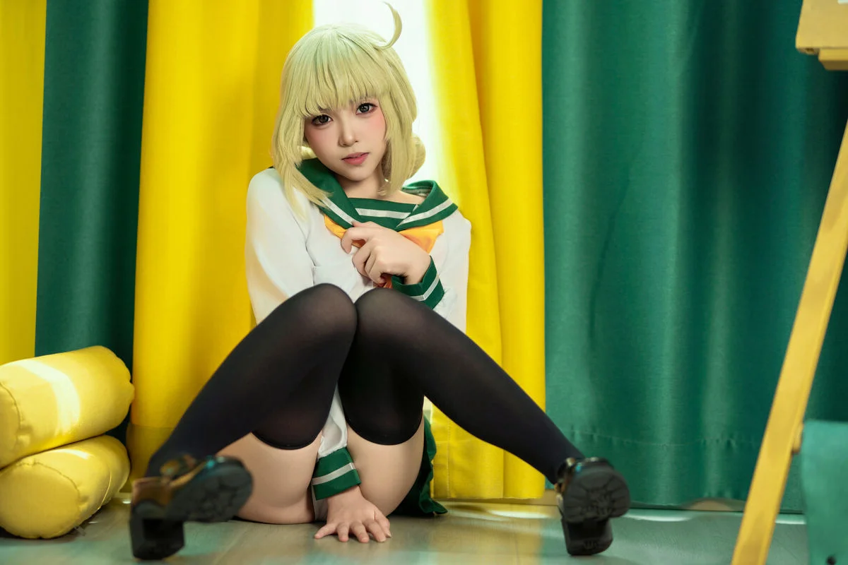This stunning portrayal of Araga Kiwi by the talented Bangni captures a perfect blend of youthful energy and cinematic mood. The visual storytelling is evident in her expressive gaze and poised body language, reflecting a character that is both sweet and spirited. The fashion choices here are impeccable, featuring a classic sailor style uniform with a vibrant yellow scarf that contrasts beautifully against the deep green accents. Every detail, from the soft texture of the fabric to the iconic blonde hairstyle with its playful flick, is executed with artistic precision and a deep understanding of visual aesthetics. The warm lighting and minimalist background create a nostalgic atmosphere, reminiscent of a quiet afternoon in a classic anime setting. It is a masterful display of how cosplay can transcend into the world of high end visual art, making it a truly inspiring piece for fashion enthusiasts and photography lovers who appreciate the beauty of character transformation.