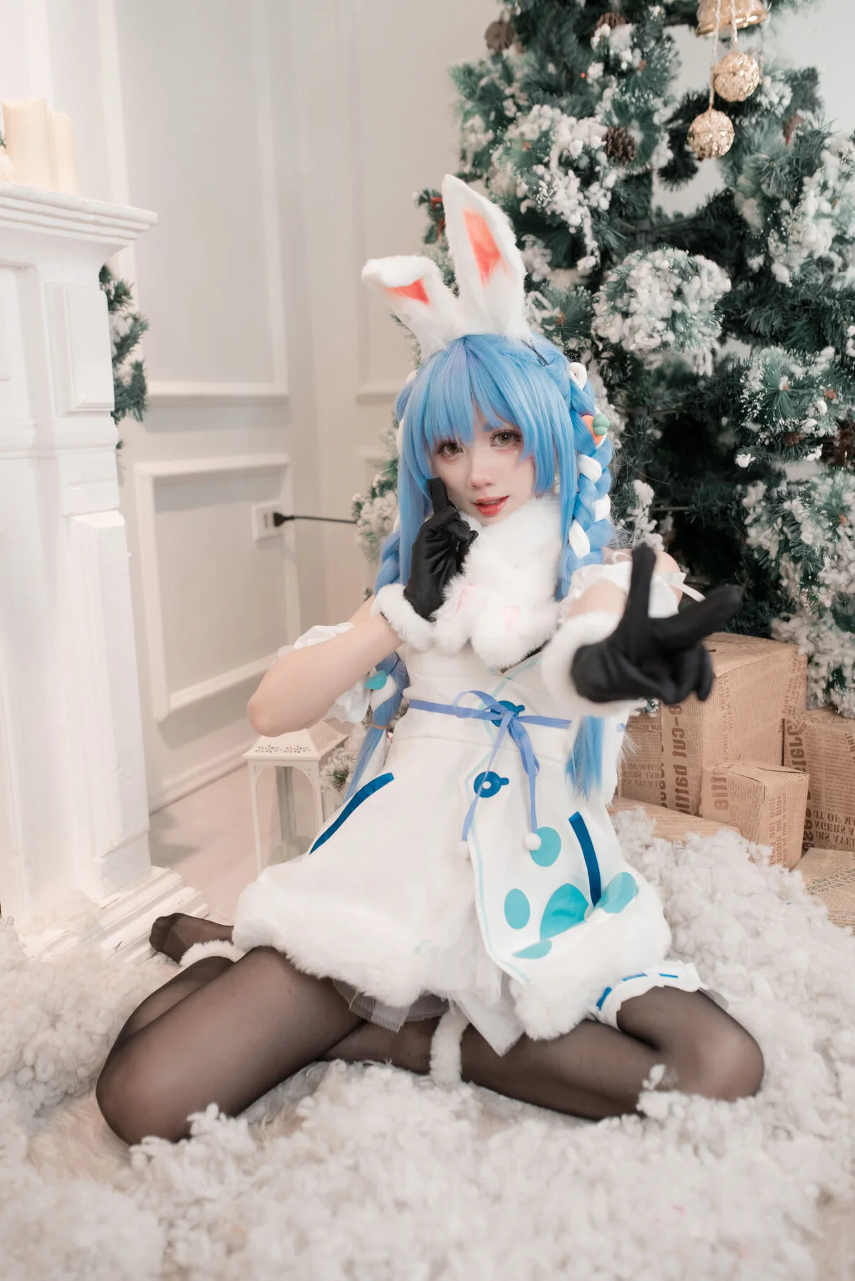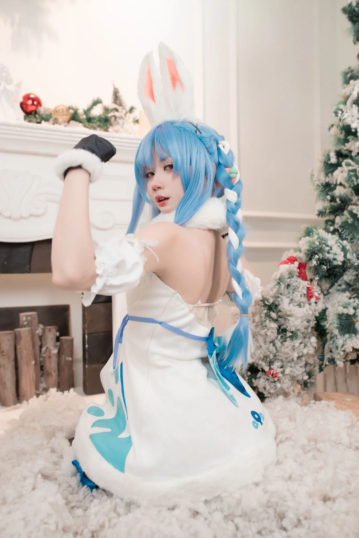 Stepping into a whimsical winter wonderland, PoppaChan captures the heart with her stunning portrayal of the beloved Usada Pekora. The scene is set against a backdrop of a snow-dusted Christmas tree and a soft, warm fireplace glow, creating a nostalgic and cozy atmosphere. Her shy yet playful gaze, paired with a delicate pose, brings out the endearing personality of the character. The fashion choice is impeccable, featuring a white outfit with vibrant blue accents that perfectly complement her signature blue braided hair and iconic rabbit ears. The soft textures of the fur trim and the gentle lighting enhance the overall aesthetic, making the image feel like a dreamlike moment frozen in time. Every detail, from the carefully styled wig to the subtle makeup, reflects a high level of artistic dedication and a keen eye for visual storytelling. This collection is a beautiful blend of anime culture and festive elegance, offering an inspiring look at how costume design can evoke such deep, joyful emotions during the holiday season.#PoppaChan #UsadaPekora #ChristmasCosplay #AnimeStyle #VisualStorytelling #Cosplay