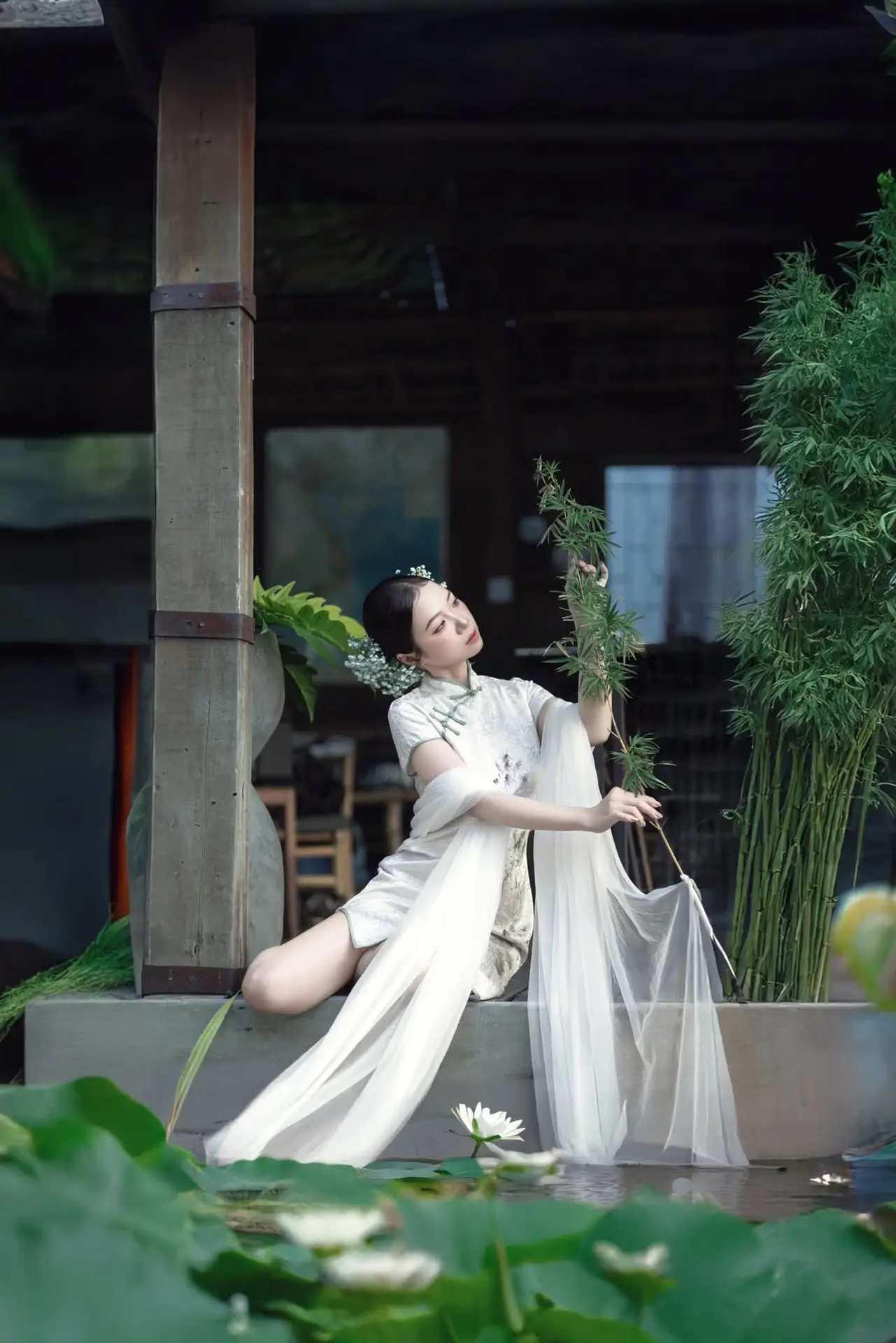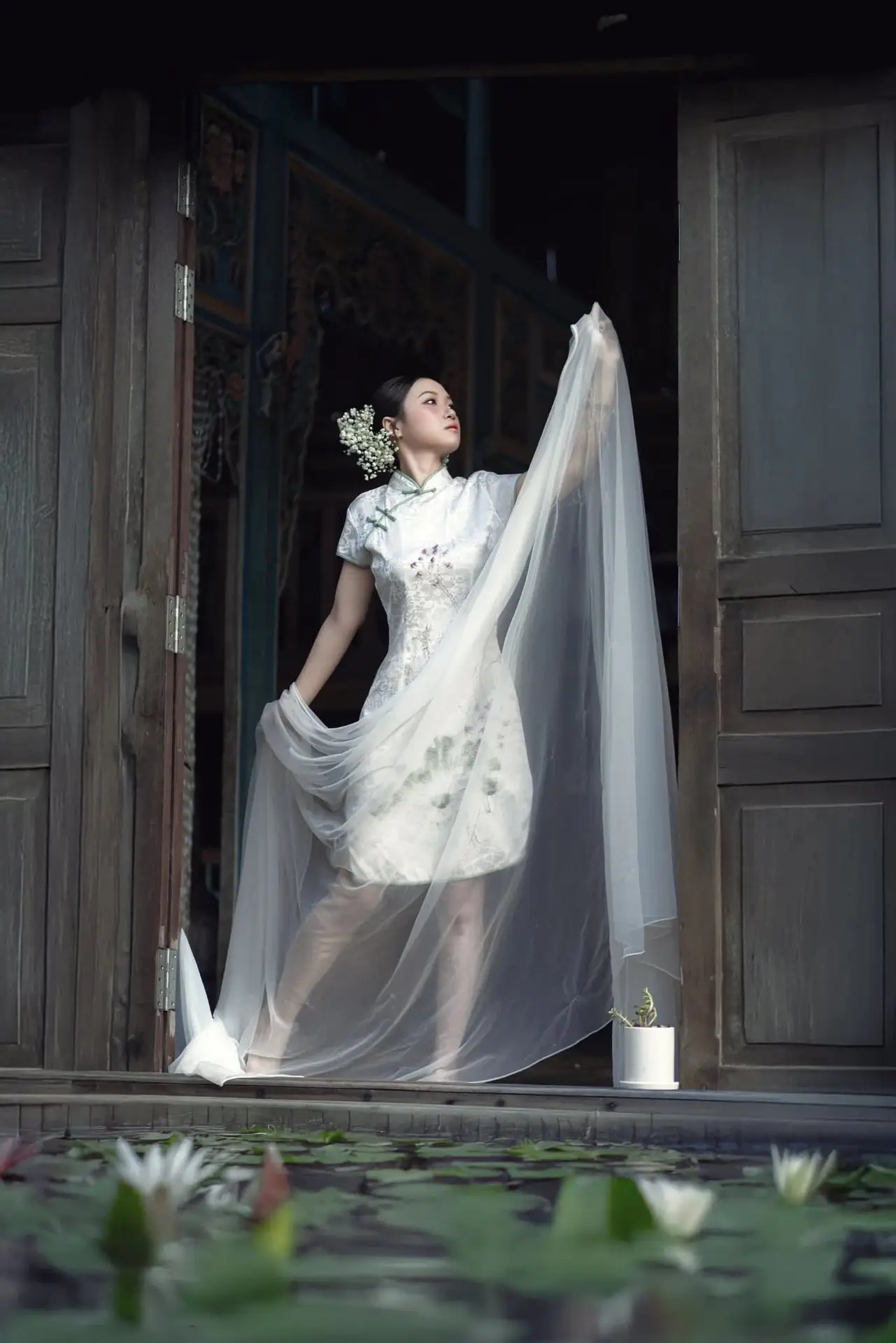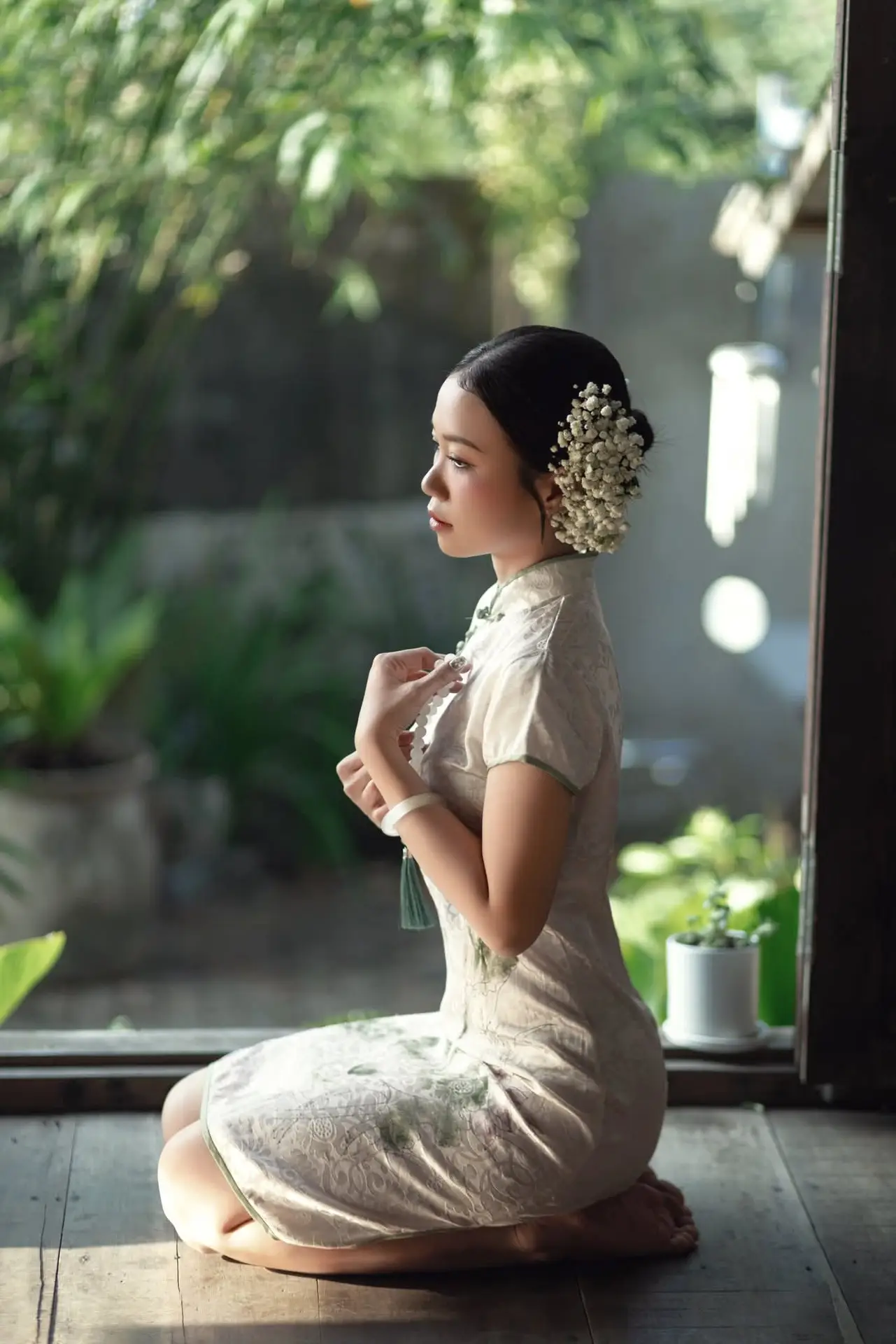This stunning photograph captures the graceful traditional beauty of a Vietnamese woman. She sits elegantly on an antique wooden doorstep, adorned in a sophisticated modernized Ao Dai that accentuates her gentle and modest charm. Delicate white flowers intricately woven into her dark hair add a soft touch, harmonizing with her serene demeanor. In the foreground, a tranquil lotus pond with pristine white lotus blossoms symbolizes purity. The scene deeply embodies Vietnamese architecture and culture, evoking a nostalgic and peaceful ambiance. This image is a timeless representation of enduring East Asian beauty.#VietnameseBeauty #AoDaiFashion #TraditionalCharm #LotusPond #AsianGrace