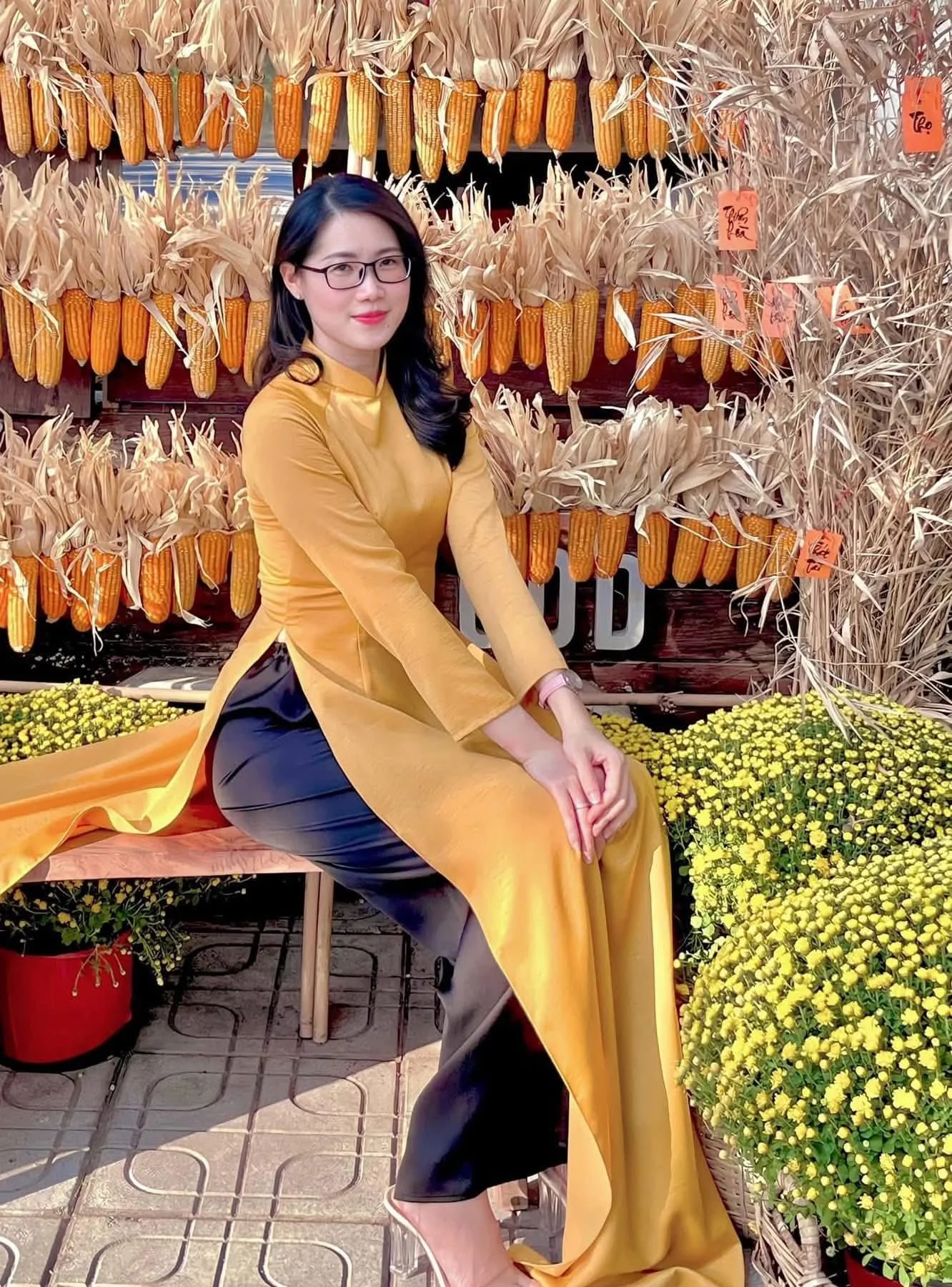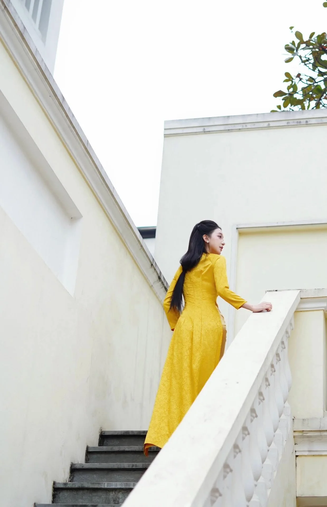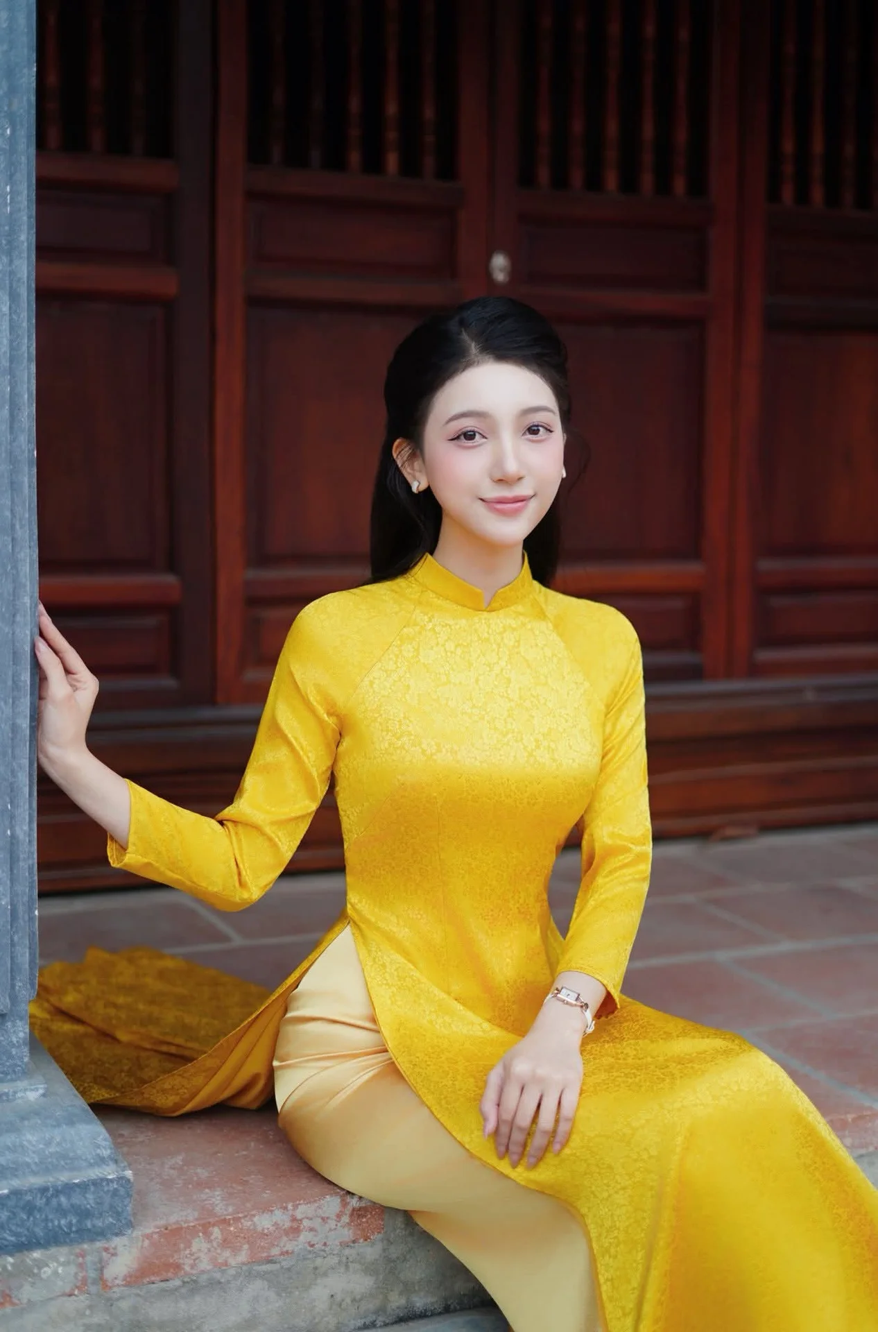 This stunning photo captures a graceful Vietnamese girl in a vibrant yellow Ao Dai. The traditional Ao Dai with its bright yellow hue not only accentuates her fair skin but also highlights her delicate and gentle beauty. Her pure East Asian features, gentle smile, and captivating eyes create an enchanting image. The girl sits leaning against an ancient wooden pillar, exuding the unique elegance and grace of Vietnamese women. This is not just a fashion photo but also a tribute to cultural beauty, the sophistication of traditional attire, and the confident, alluring demeanor of a Vietnamese lady.#YellowSilk #AoDai #VietnameseBeauty #TraditionalDress #AoDaiFashion #AsianBeauty