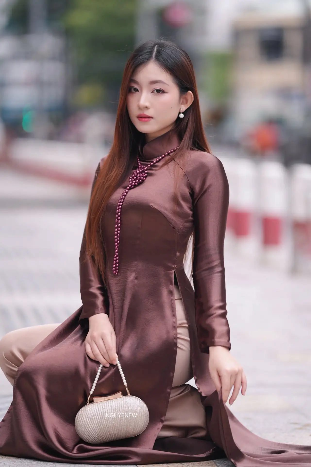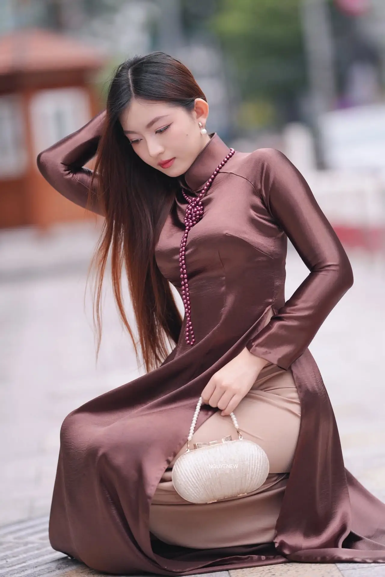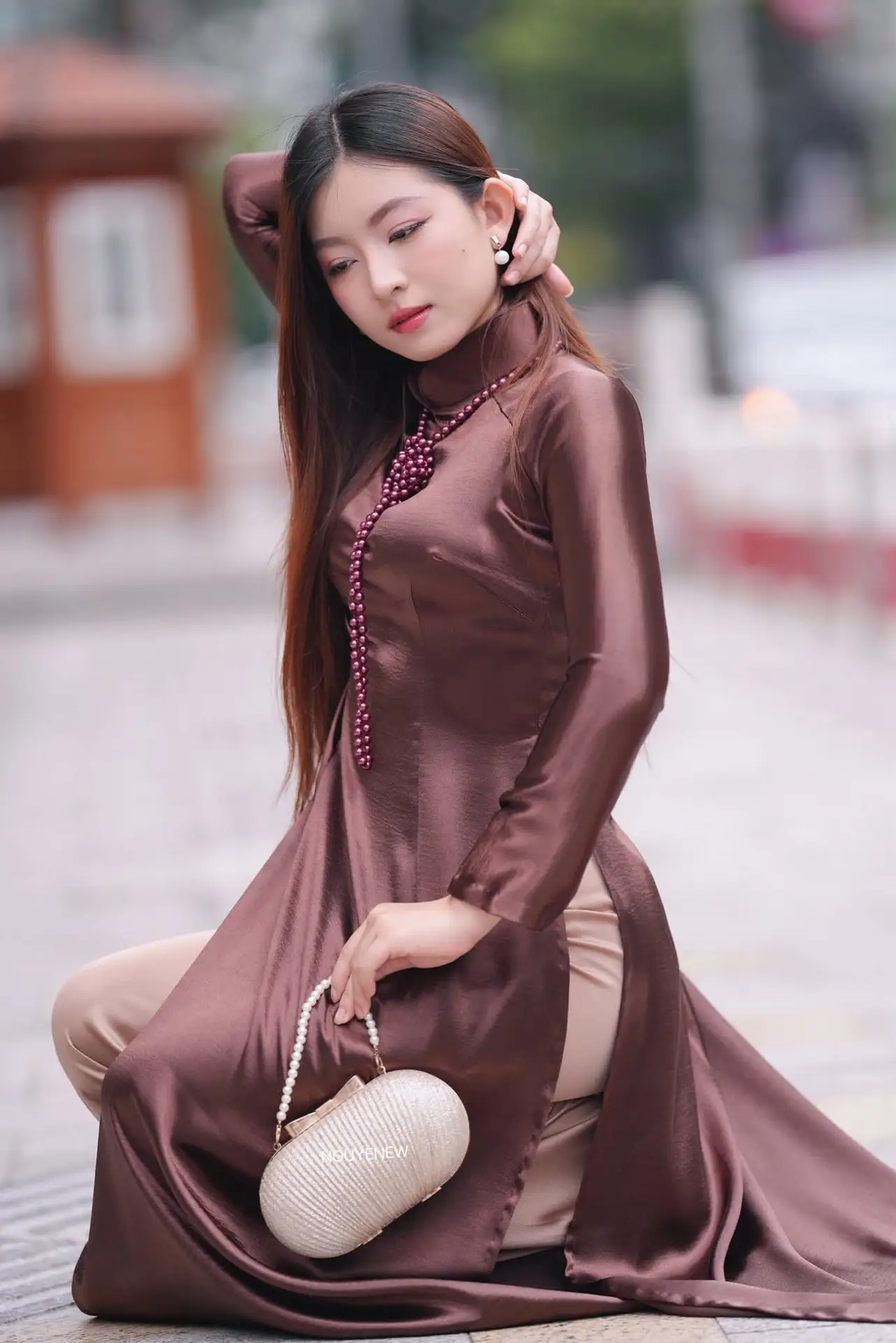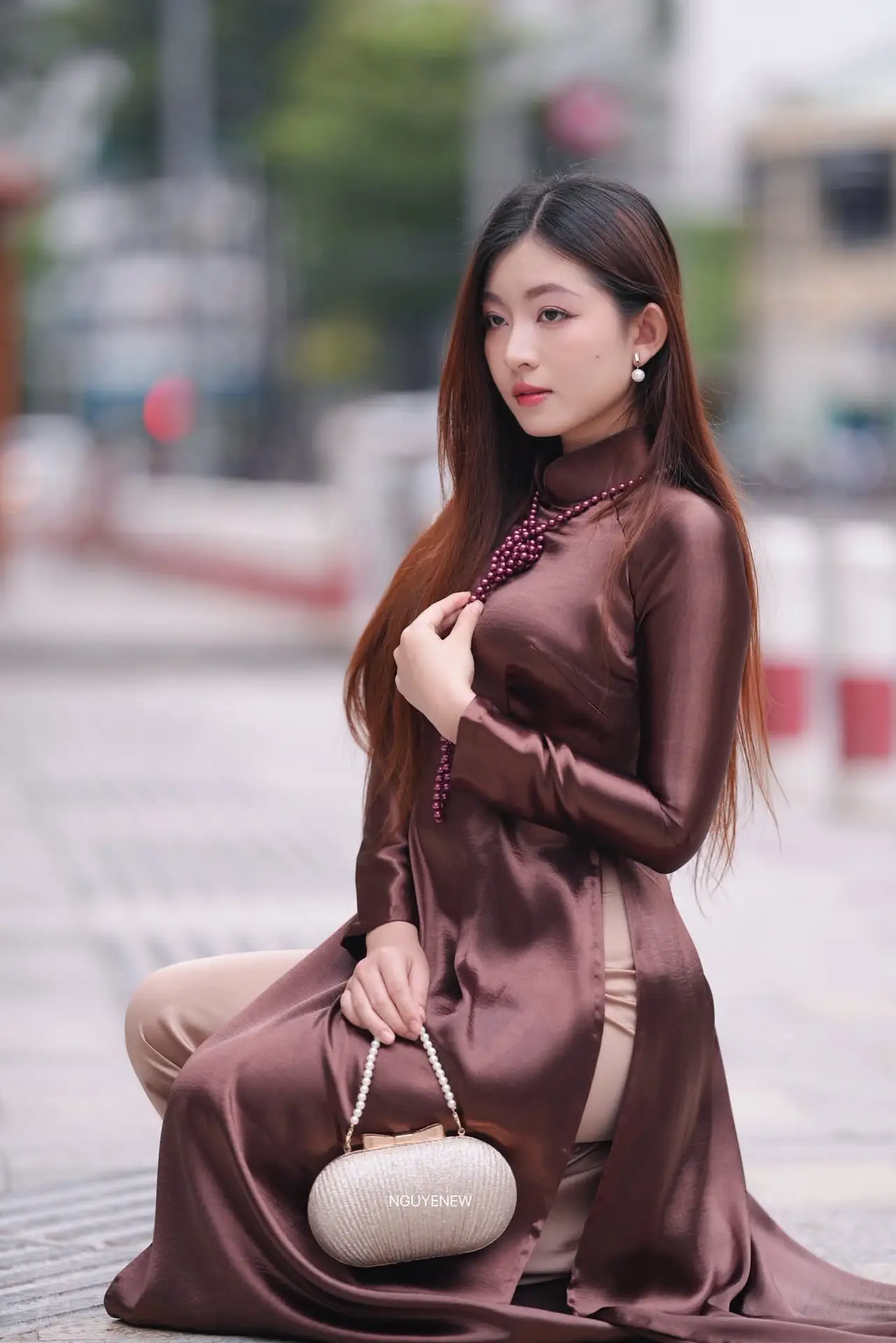 This captivating image beautifully captures a Vietnamese woman embodying grace and elegance in a modern brown Ao Dai. Crafted from soft, lustrous silk, the dress subtly accentuates her slender figure, creating an alluring silhouette. Paired with a delicate pearl clutch and flowing long hair, her overall style exudes sophisticated charm. She confidently showcases a blend of traditional Vietnamese beauty and contemporary fashion against an urban backdrop, offering a sense of both familiarity and luxury. This photograph is more than just a fashion statement; it's a celebration of Asian beauty, symbolizing the confidence and unique style of Vietnamese women.#ModernAoDai #VietnameseBeauty #AoDaiFashion #VietnameseWoman #AsianGrace