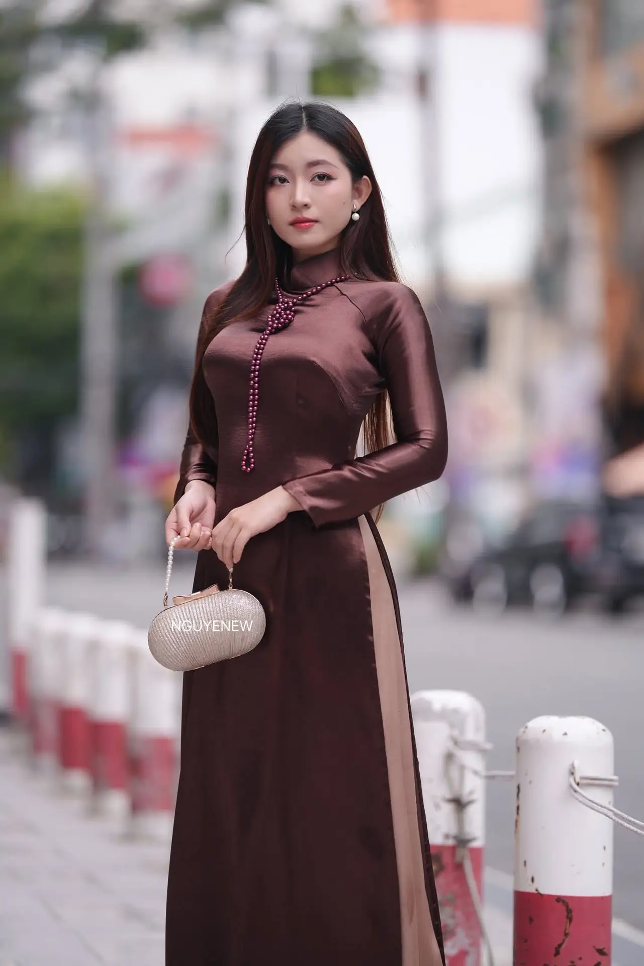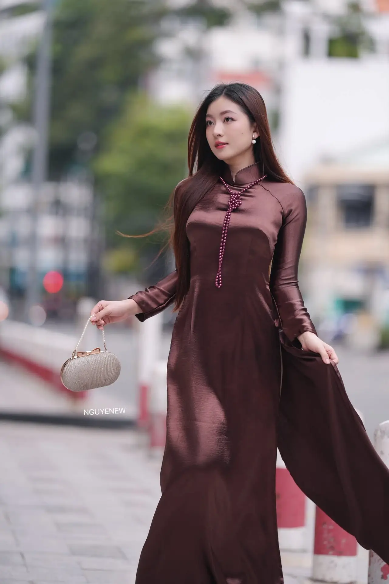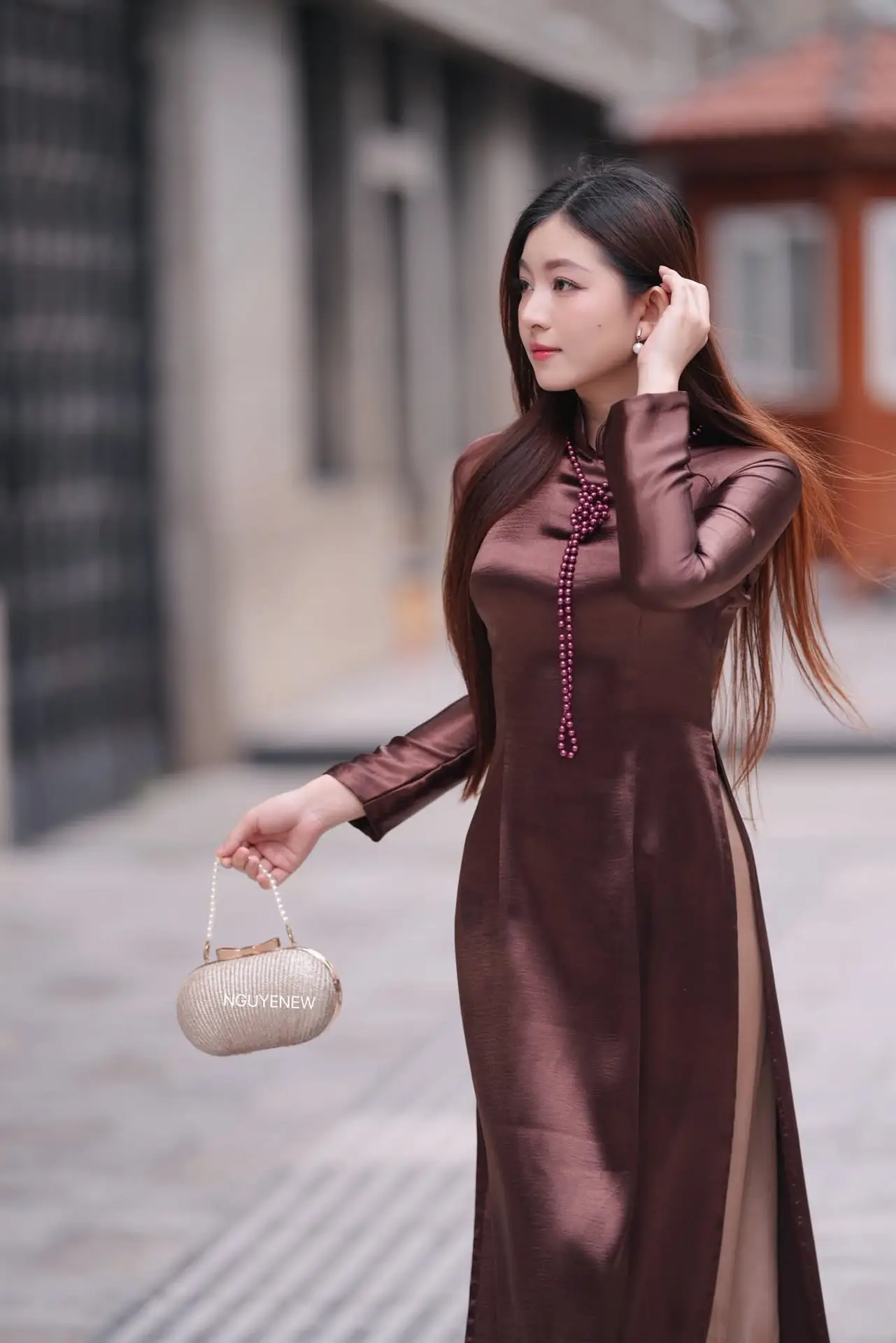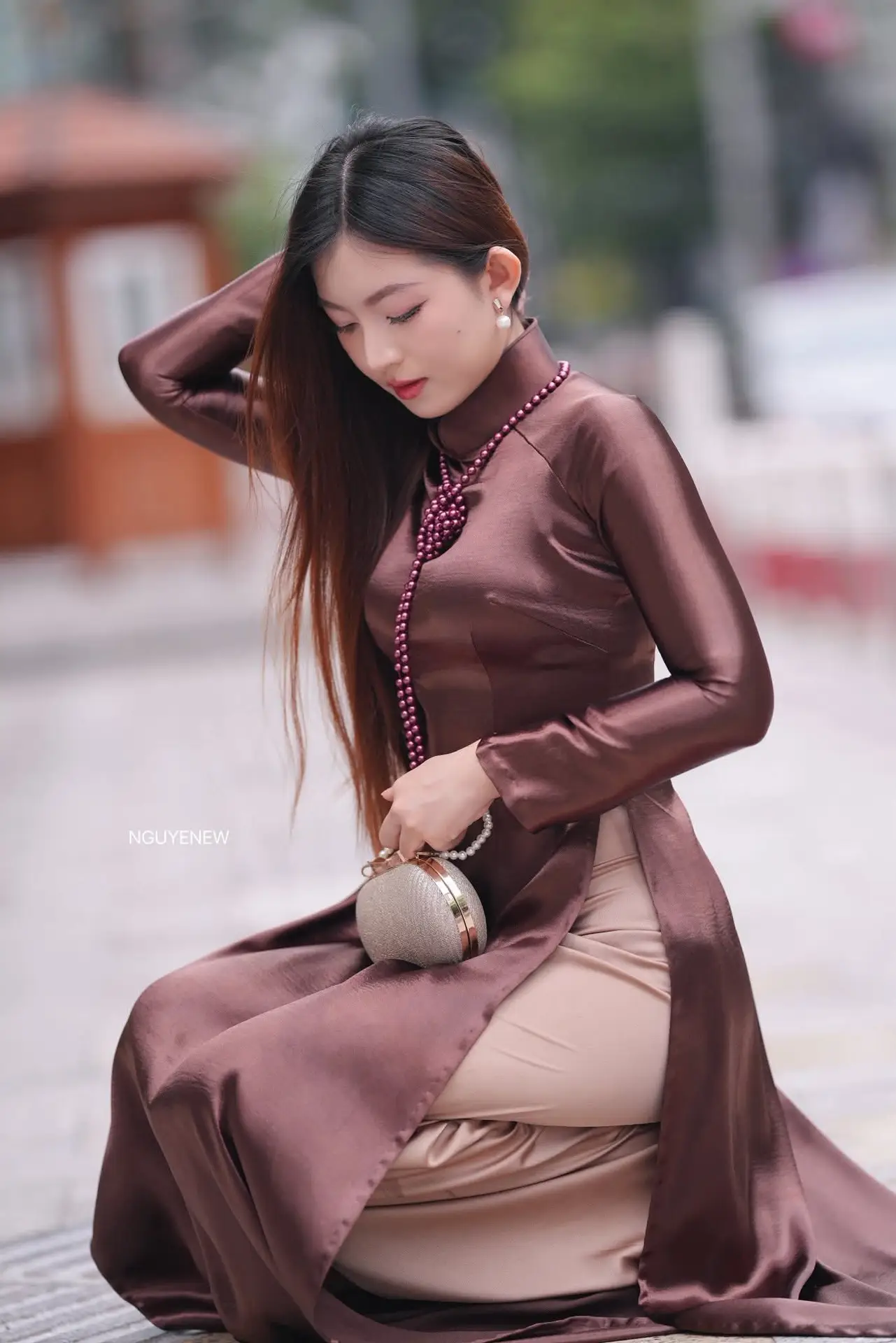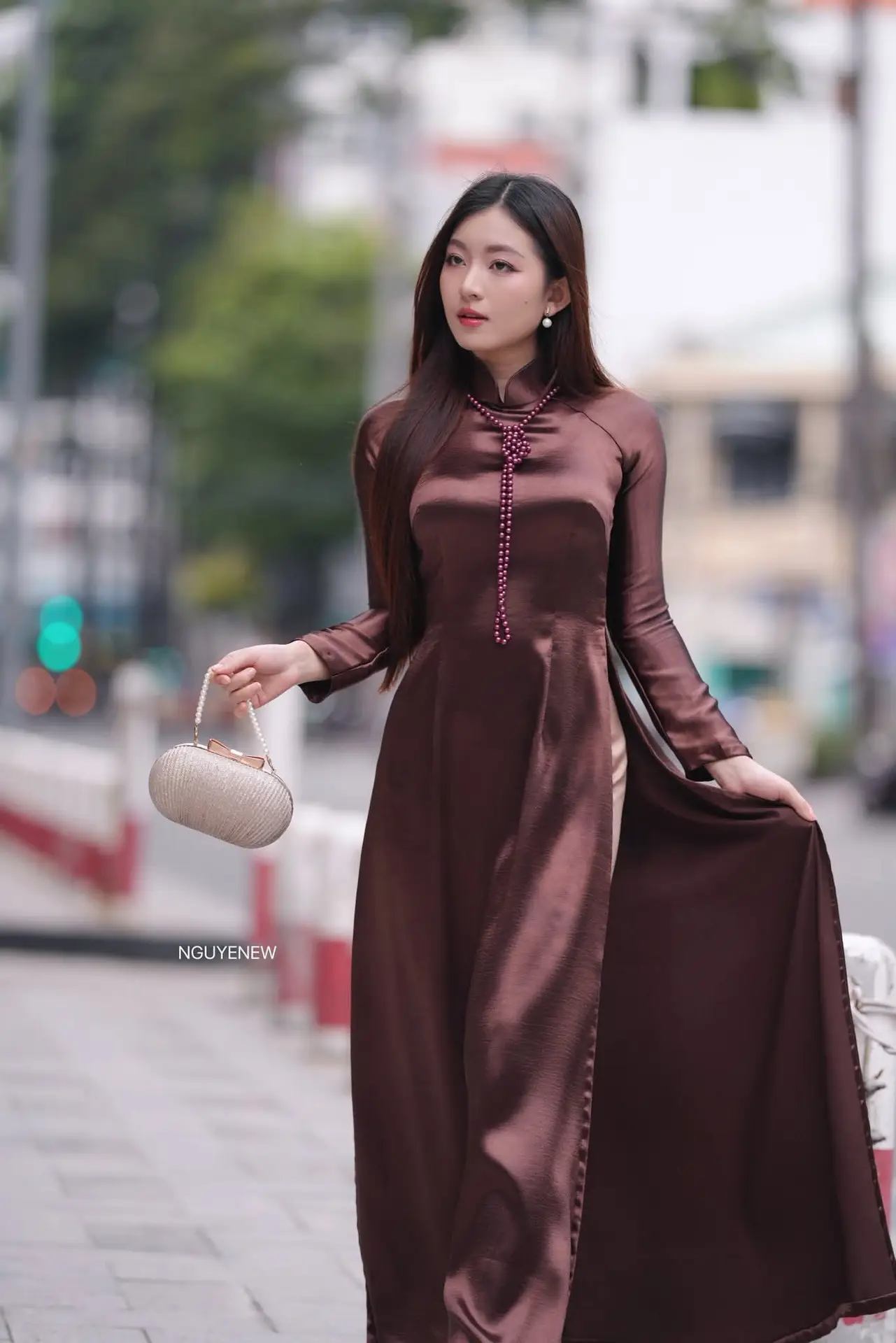 This captivating image beautifully captures a Vietnamese woman embodying grace and elegance in a modern brown Ao Dai. Crafted from soft, lustrous silk, the dress subtly accentuates her slender figure, creating an alluring silhouette. Paired with a delicate pearl clutch and flowing long hair, her overall style exudes sophisticated charm. She confidently showcases a blend of traditional Vietnamese beauty and contemporary fashion against an urban backdrop, offering a sense of both familiarity and luxury. This photograph is more than just a fashion statement; it's a celebration of Asian beauty, symbolizing the confidence and unique style of Vietnamese women.#ModernAoDai #VietnameseBeauty #AoDaiFashion #VietnameseWoman #AsianGrace