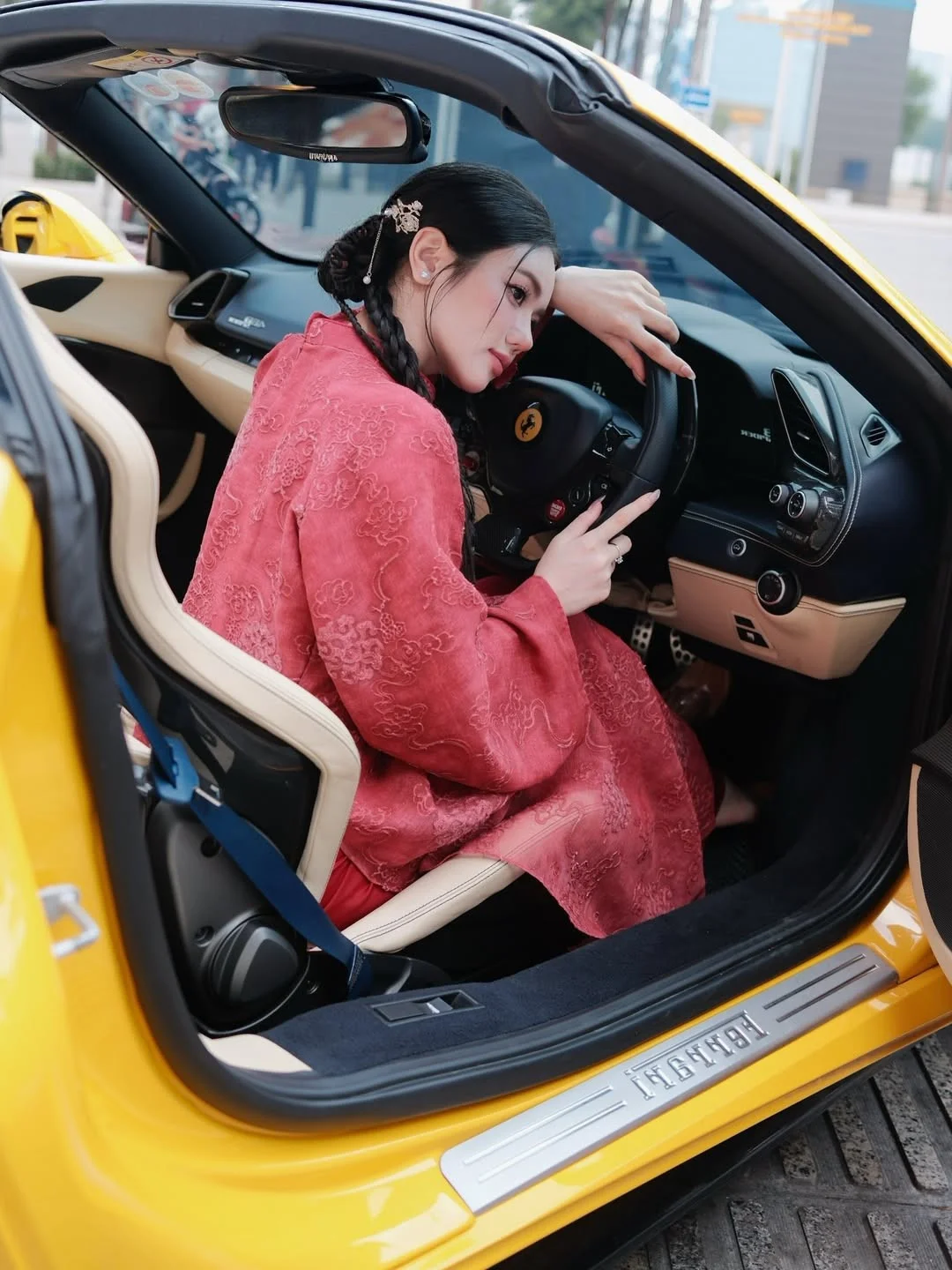 Experience the breathtaking blend of cultural heritage and modern luxury in this captivating photoshoot featuring the popular TikTok influencer, Bo Chanh. Dressed in a vibrant, floor-length red Ao Dai—the iconic traditional Vietnamese dress—Bo Chanh radiates elegance and grace. The choice of deep crimson silk beautifully symbolizes luck and prosperity, making a bold statement against the sleek, aerodynamic lines of a high-performance yellow supercar.This stunning visual narrative showcases how traditional fashion can seamlessly transition into a contemporary lifestyle. The Ao Dai’s high collar and flowing silhouette highlight a timeless aesthetic, while the bright yellow luxury vehicle adds a touch of high-octane glamour and urban sophistication. Bo Chanh’s poise and natural charm bring the entire scene to life, capturing the essence of a modern woman who respects her roots while embracing the fast-paced world of social media and luxury.