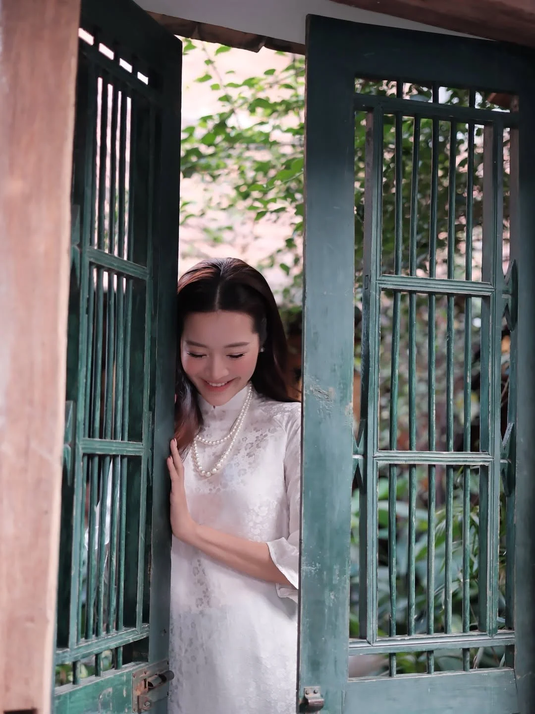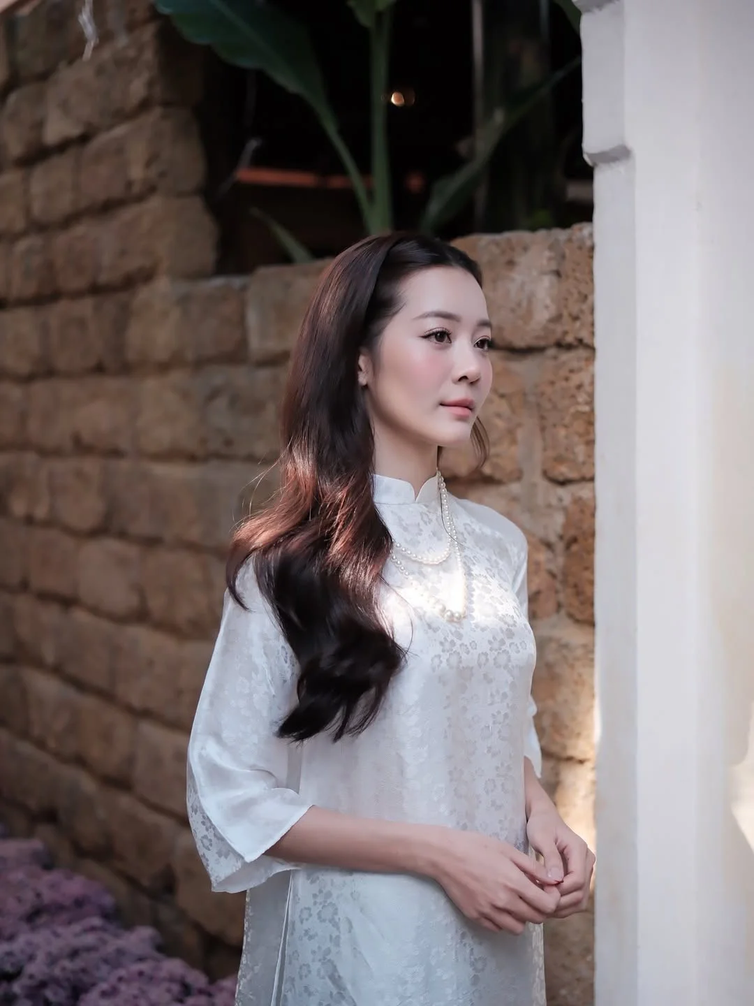 Capturing a moment of serene beauty, Karen Nguyen shines in a classic white Ao Dai that perfectly balances tradition and modern grace. Her thoughtful expression and gentle body language evoke a sense of nostalgia, as if she is stepping out of a poetic cinematic scene. The choice of a silk brocade fabric with subtle, intricate patterns paired with a timeless pearl necklace showcases an impeccable sense of style and a deep appreciation for Vietnamese heritage. The soft natural lighting playing against the rustic stone background creates a warm, harmonious atmosphere, highlighting her increasingly mature and radiant beauty. This ensemble is a masterclass in minimalist elegance, where every detail from the flowing silhouette to the soft waves of her hair contributes to an overall aesthetic of sophisticated femininity. It is more than just a fashion statement; it is an artistic portrayal of soul and stillness in a fast-paced world, inviting the viewer to appreciate the quiet power of classic elegance.#VietnameseCulture #AoDaiStyle #KarenNguyen #TimelessElegance #VisualArt