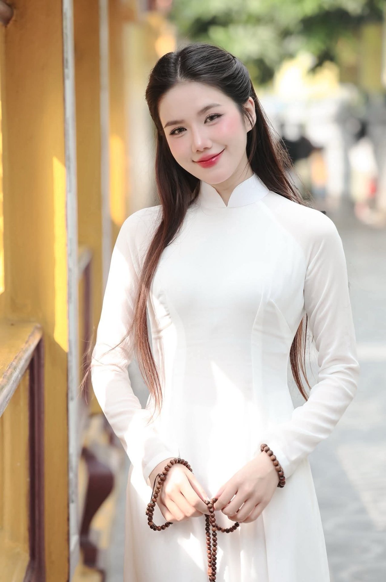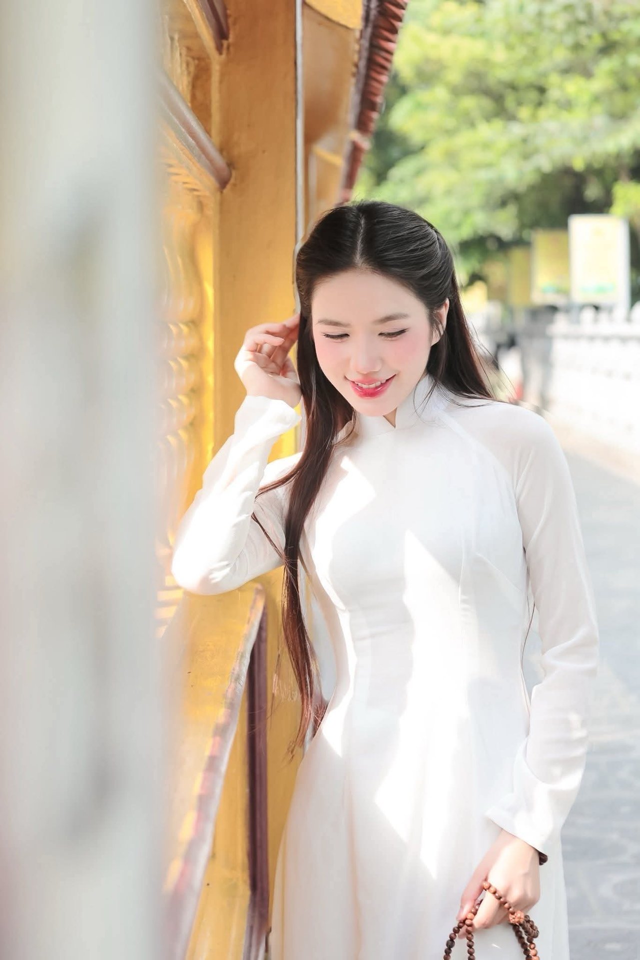 This captivating image portrays the serene beauty of a Vietnamese woman adorned in a pristine white Ao Dai. Her graceful posture, gentle smile, and contemplative gaze exude an enchanting charm. The white Ao Dai not only accentuates her elegant figure but also symbolizes the timeless essence of Vietnamese traditional culture. In the background, ancient architecture with weathered tiled roofs and vibrant Buddhist flags creates a harmonious blend between human beauty and a sacred cultural space. It is a moment of tranquility where traditional beauty is preserved and shines naturally, deeply touching the heart.Đông Hoàng