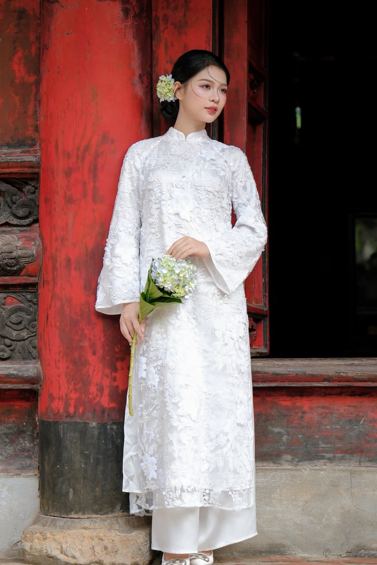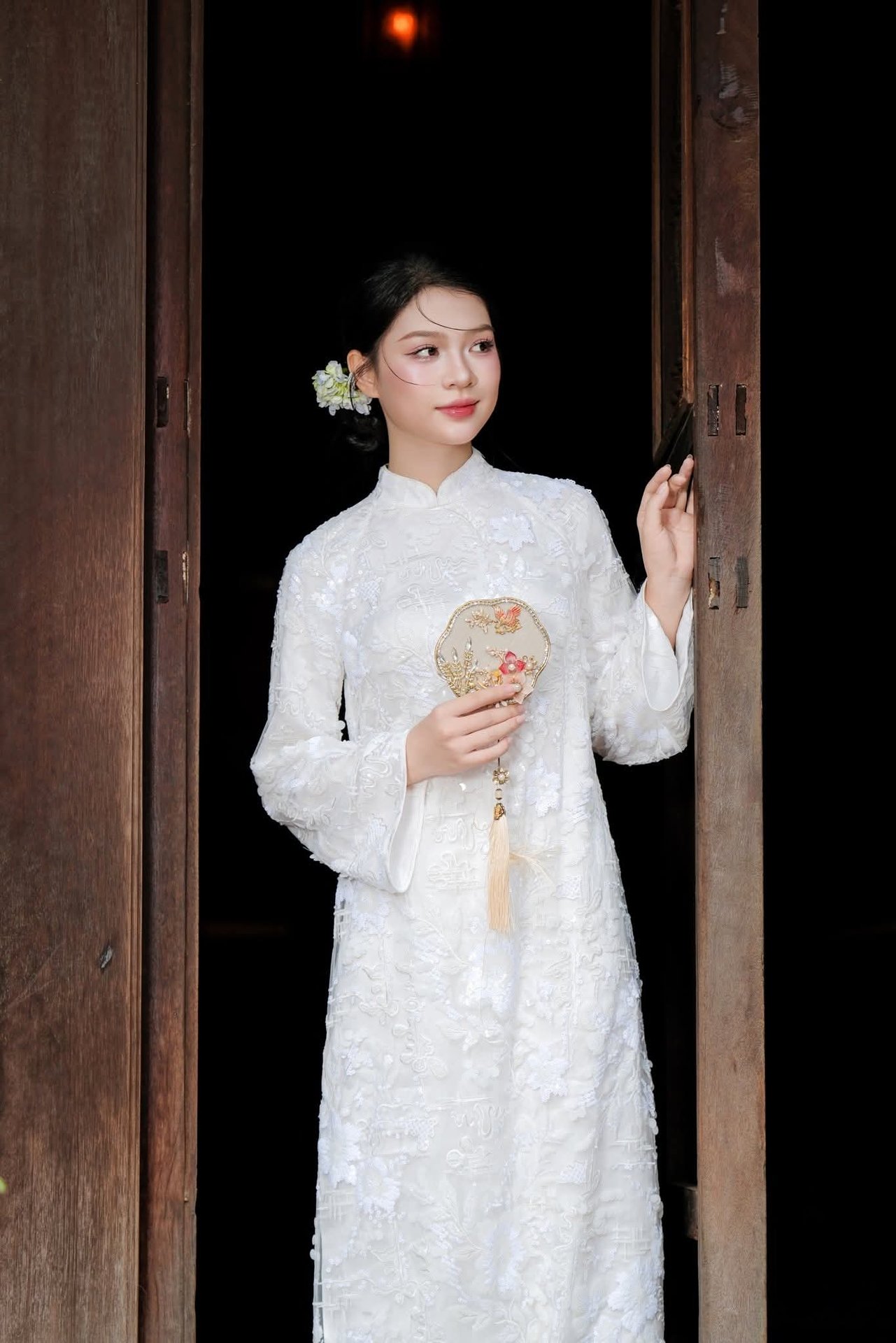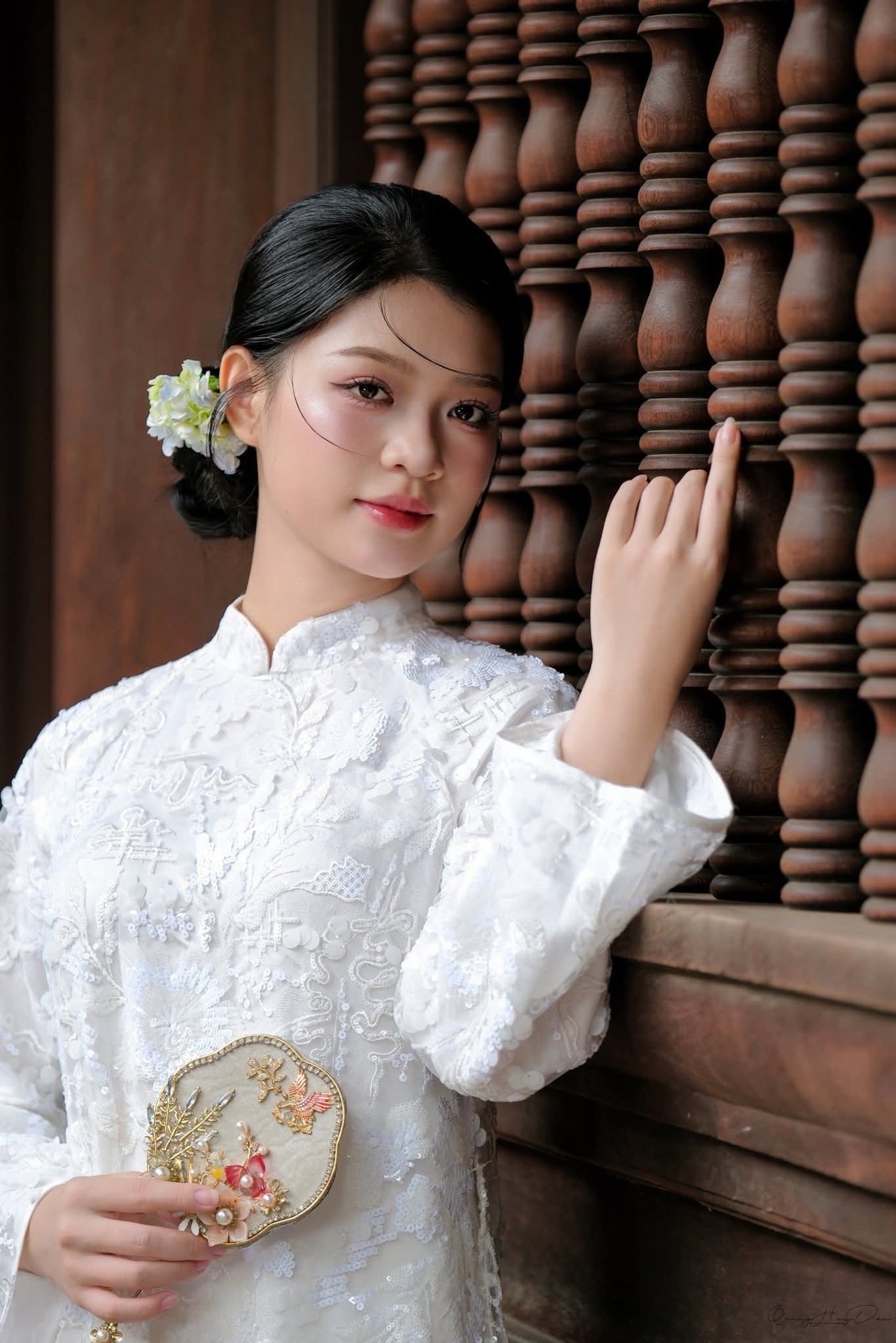 This exquisite photograph captures the serene elegance of a Vietnamese woman adorned in traditional attire Standing gracefully within an ancient architectural setting she embodies the timeless beauty and cultural richness of Vietnam Her gentle gaze and composed demeanor reflect a profound sense of peace and inner tranquility The delicate white flower adorning her neatly styled hair enhances her refined charm Her pristine white garment harmonizes beautifully with the rustic wooden tones of the traditional structure creating a visually captivating and poetic scene More than just a portrait this image celebrates the enduring grace and cultural heritage of Vietnamese women offering a captivating glimpse into their unique eleganceĐông Hoàng