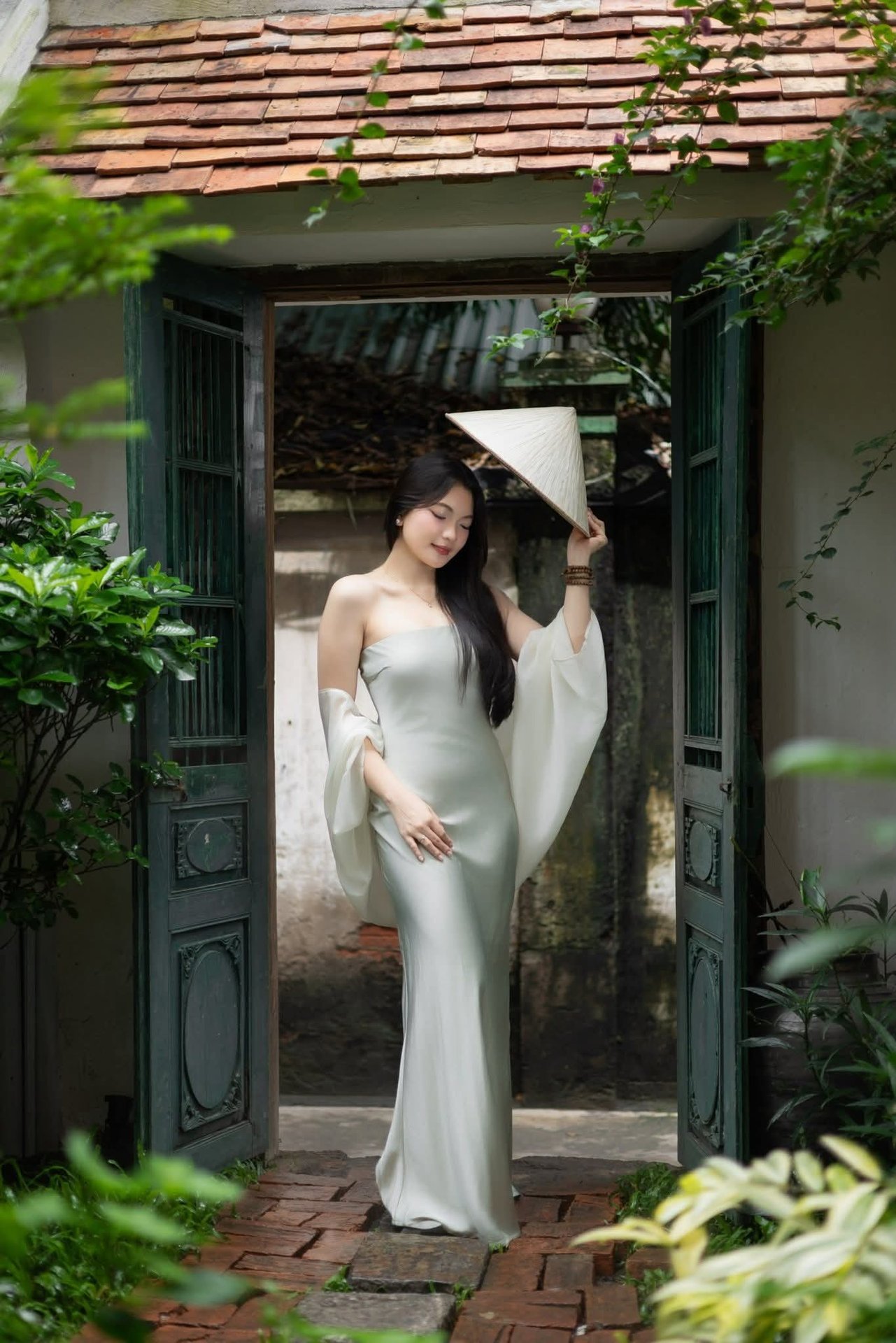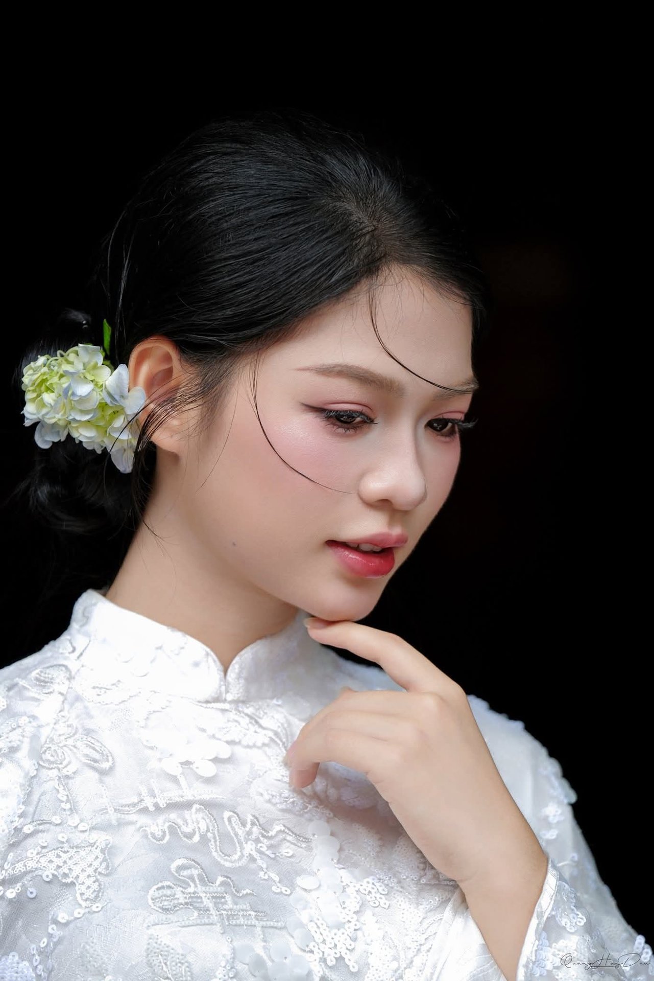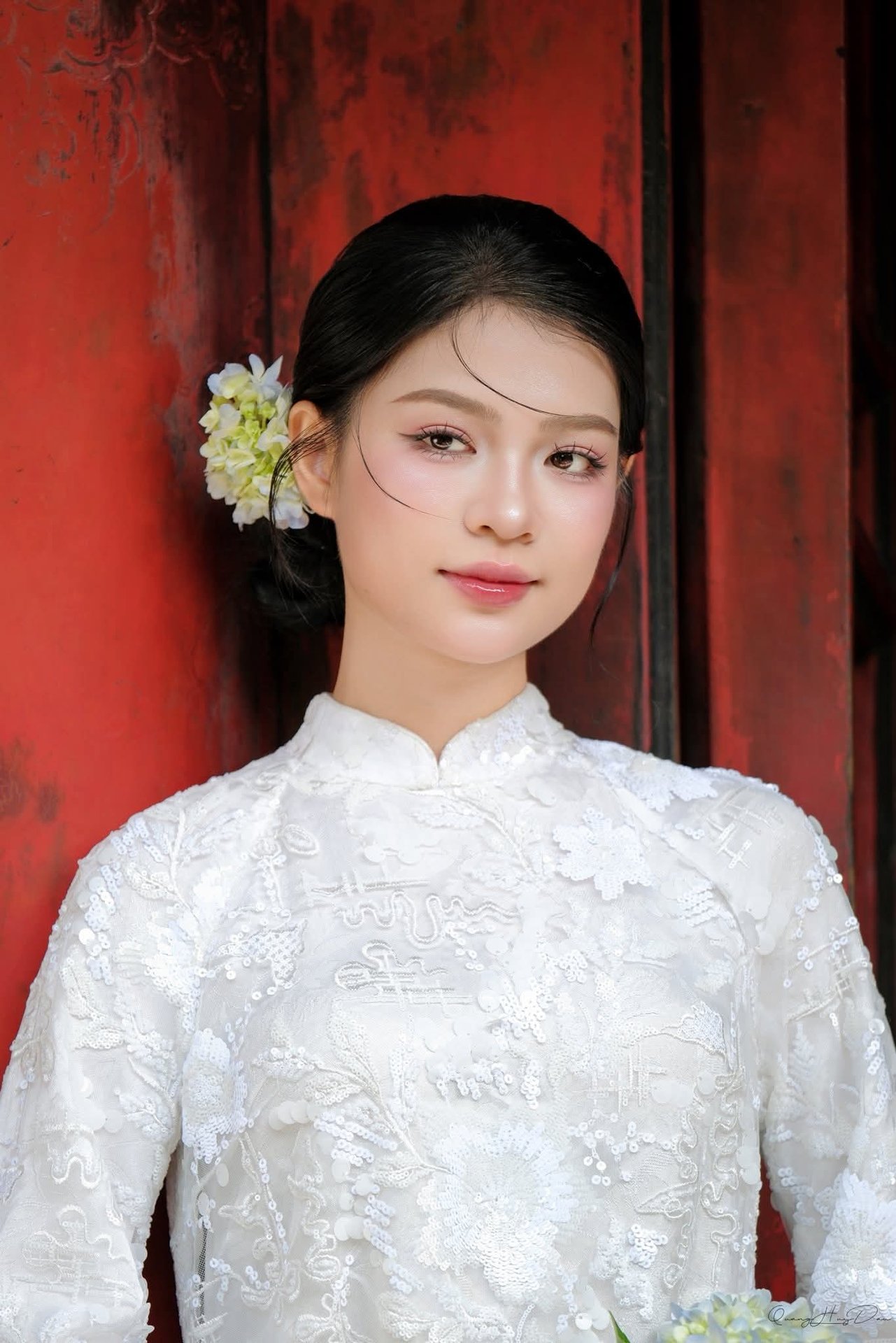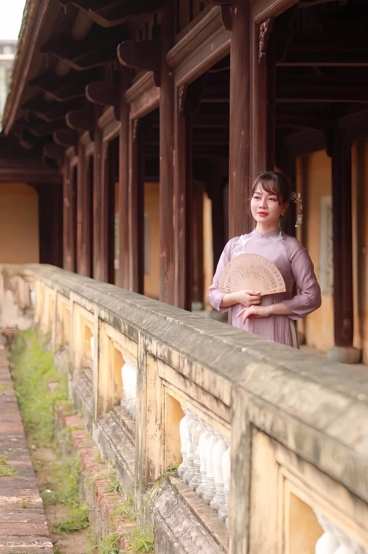 This exquisite photograph captures the serene elegance of a Vietnamese woman adorned in traditional attire Standing gracefully within an ancient architectural setting she embodies the timeless beauty and cultural richness of Vietnam Her gentle gaze and composed demeanor reflect a profound sense of peace and inner tranquility The delicate white flower adorning her neatly styled hair enhances her refined charm Her pristine white garment harmonizes beautifully with the rustic wooden tones of the traditional structure creating a visually captivating and poetic scene More than just a portrait this image celebrates the enduring grace and cultural heritage of Vietnamese women offering a captivating glimpse into their unique eleganceĐông Hoàng