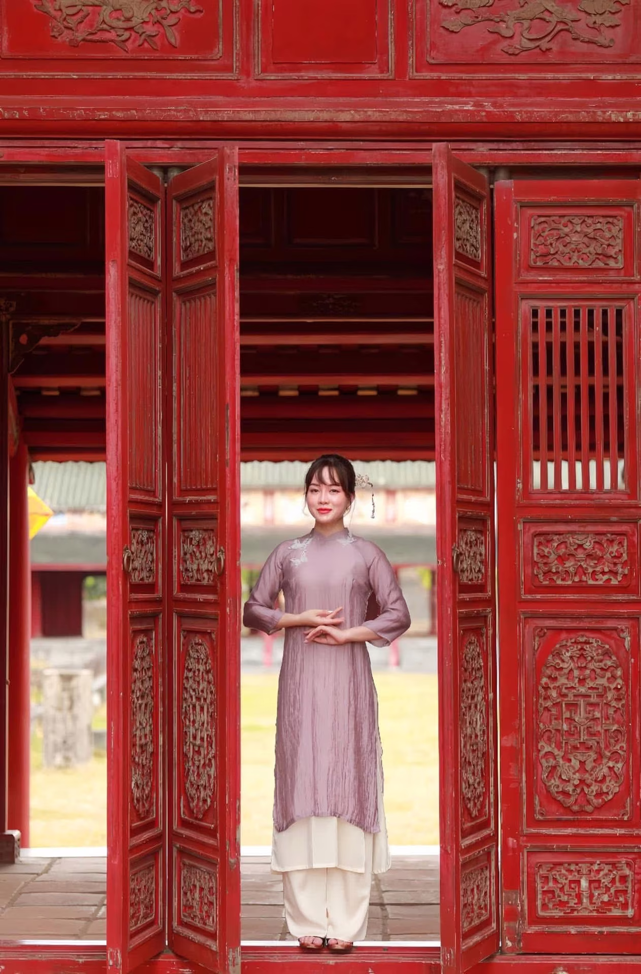 This exquisite photograph captures a Vietnamese young woman embodying gentle and ethereal beauty adorned in a refined pastel purple Ao Dai. The traditional dress is delicately embellished with subtle white embroidery accentuating the inherent grace of an East Asian woman. She stands demurely within an ancient red wooden doorway her gaze softly cast downwards hands tenderly poised as if adjusting a small item creating a moment of thoughtful introspection and tranquility. Her beauty transcends the attire emanating from her serene and elegant demeanor reminiscent of enduring cultural values. This image epitomizes the pure and noble beauty of Vietnamese women evoking a sense of peace and nostalgia for a golden era of traditional aesthetics. The photograph harmoniously blends ancient architecture with human grace highlighting profound cultural significance.Đông Hoàng