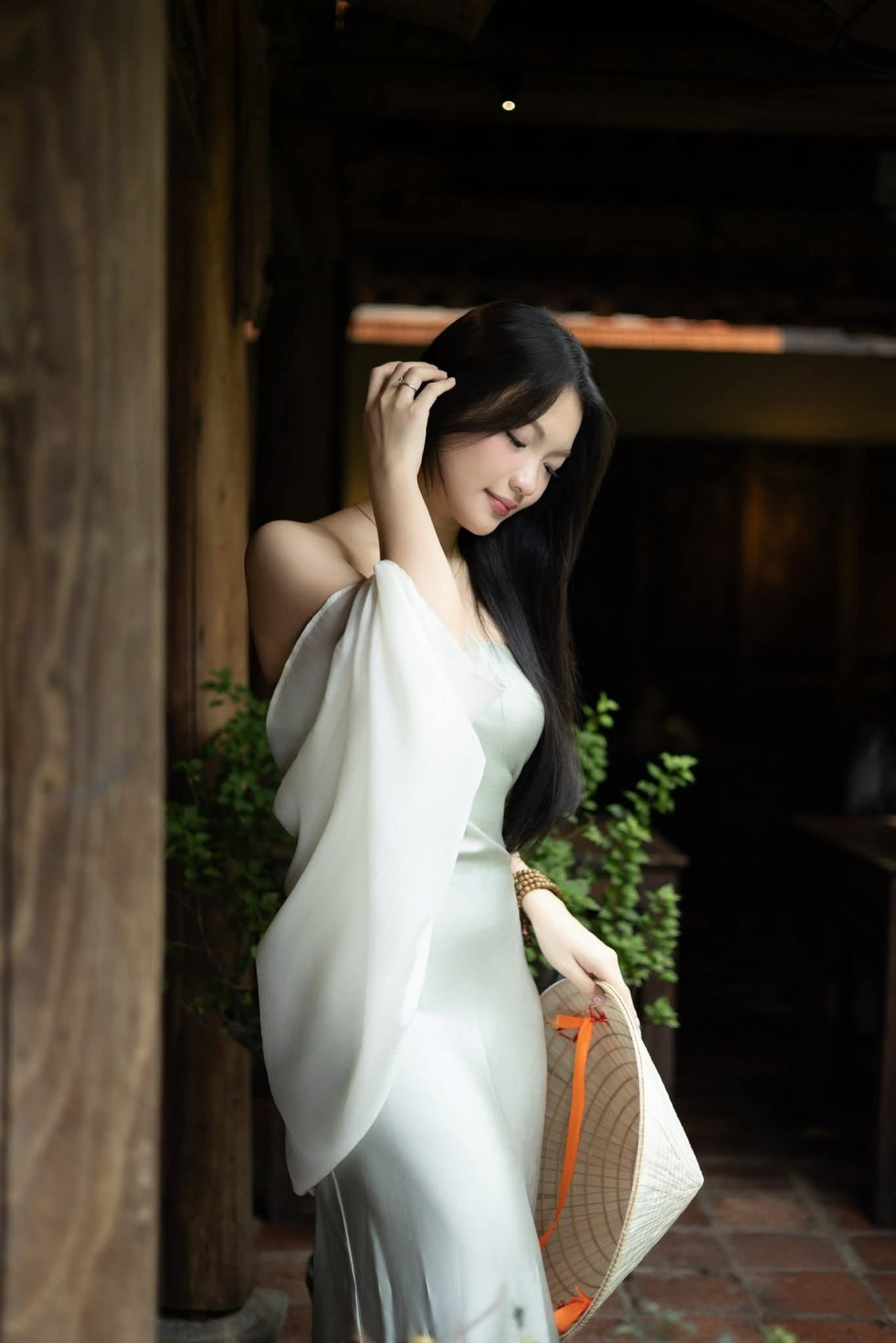 This captivating image beautifully portrays the graceful and elegant beauty of a Vietnamese girl adorned in a delicate traditional outfit. Her gentle smile and modest gaze beneath the brim of the conical hat evoke a strong sense of Asian charm, reminiscent of Vietnam's profound cultural heritage. The pristine white off-shoulder dress, showcasing her slender shoulders, perfectly complements the rustic conical hat, highlighting her refined and elegant demeanor. The ancient architecture in the background further enhances the timeless beauty of the Vietnamese woman. This photograph is not just a beautiful moment but also a tribute to traditional aesthetics, conveying a feeling of peace and nostalgia.