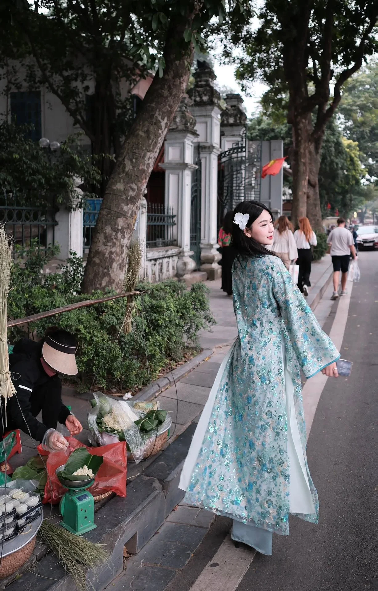 Hanoi in the gentle autumn days always brings an indescribable sense of nostalgia, and this photograph perfectly captures that essence. The young woman in a teal floral Ao Dai exudes an ethereal beauty, as light and airy as the breeze through the Old Quarter. The soft fabric and delicate patterns create a seamless blend between traditional heritage and modern elegance. Her clear gaze and subtle smile while sitting by a street vendor evoke a slower pace of life, where ancient values remain untouched amidst the urban bustle. The inclusion of a traditional hand fan and the basket of green rice flakes wrapped in lotus leaves are exquisite details that highlight a refined aesthetic and a deep love for local culture. This is more than just a fashion shot; it is a visual poem about the soul of Hanoi, simultaneously rustic and sophisticated, leaving viewers with a profound sense of tranquility and poetic inspiration.#VietnameseAoDai #HanoiTravel #ElegantStyle #AsianAesthetic #TravelPhotography