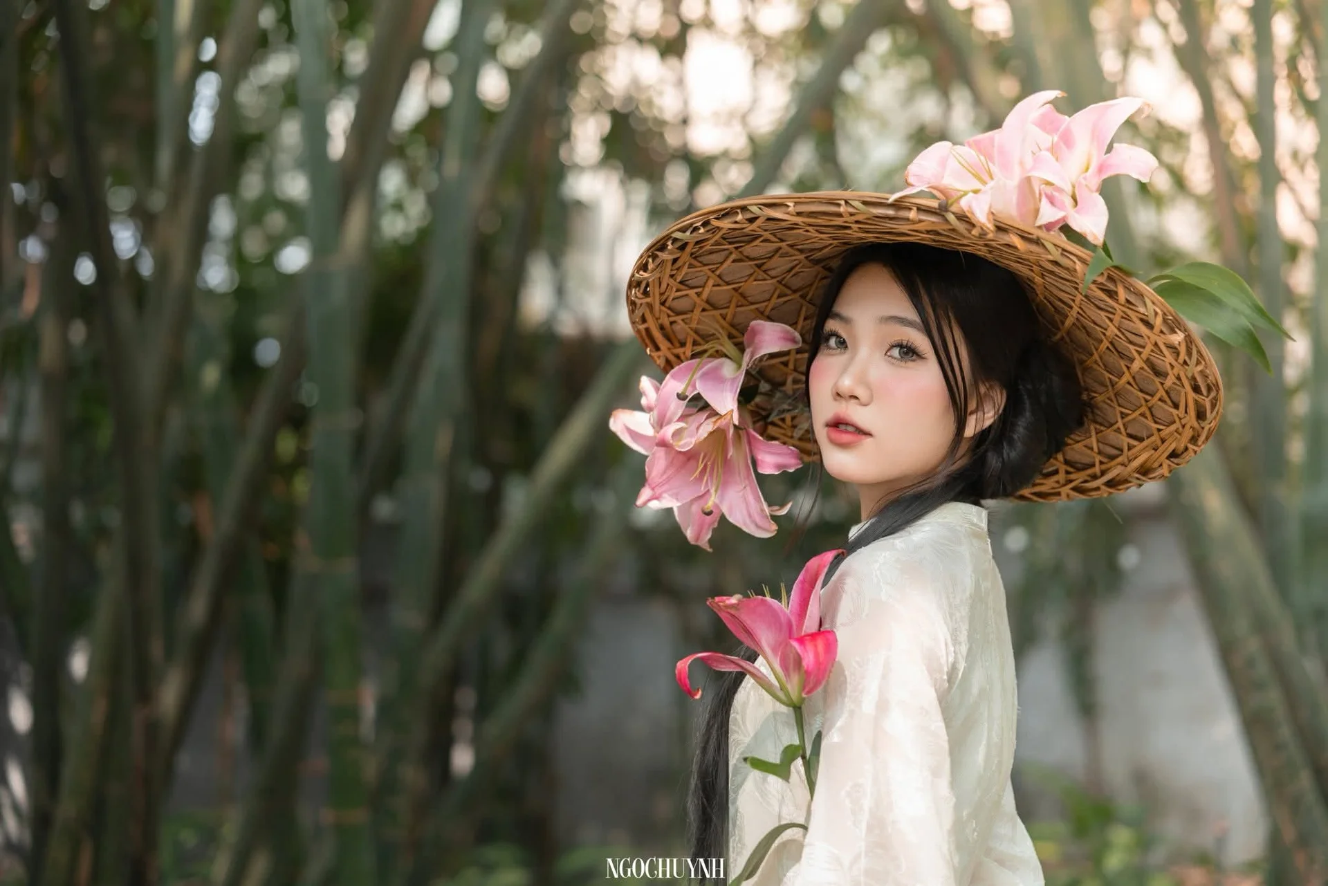 Amidst the whispering bamboo stalks, a serene moment unfolds like a scene from a classical ink painting. The young woman embodies grace and elegance, dressed in a pristine white traditional garment that flows beautifully, highlighting the delicate and pure soul of Eastern beauty. Her wide-brimmed straw hat, adorned with vibrant pink lilies, adds a romantic touch to her rustic surroundings, creating a stunning visual contrast between simplicity and sophistication. There is a profound sense of tranquility in her gaze as she looks into the distance, her hands gently resting on the bamboo, suggesting a deep connection with the natural world. The soft lighting filters through the leaves, highlighting the intricate texture of her outfit and the vivid hues of the flowers against the lush green backdrop. This composition is a masterful blend of fashion and visual storytelling, capturing a vibe that is both nostalgic and timeless. It is an invitation to slow down and appreciate the minimalist beauty of nature, perfectly encapsulated in 1000029828.jpg. Her effortless style and poetic aura make this a truly inspiring piece for any travel or lifestyle mood board seeking a touch of artistic soul.#EtherealVibes #BambooWoods #TraditionalStyle #TravelPhotography #AsianAesthetic