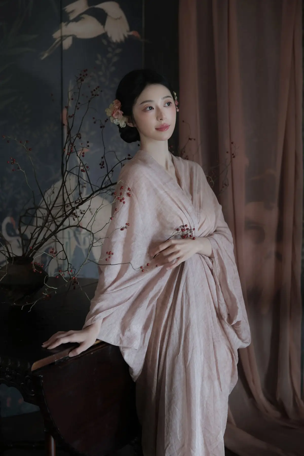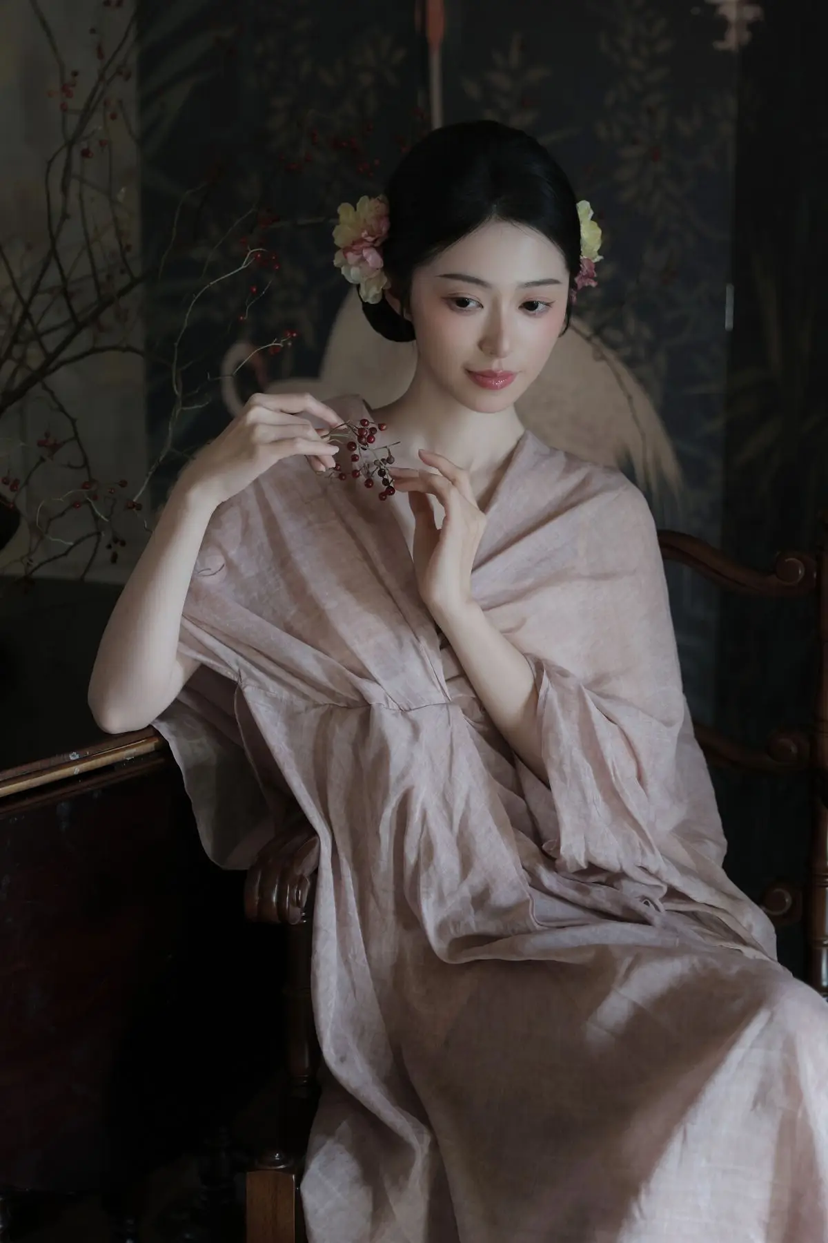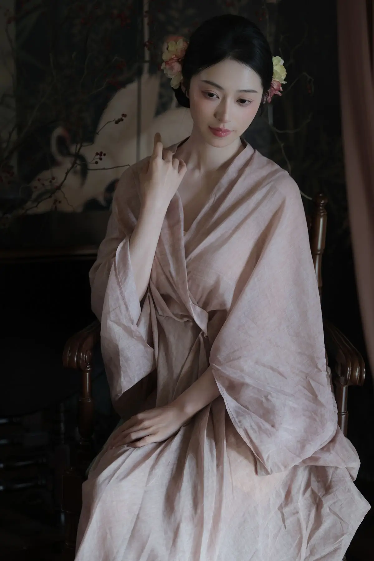 This image from YiTuYu Vol.8577 showcases Fen Mian Gu Niang, embodying captivating Oriental beauty. Dressed in a delicate, flowing traditional garment of soft pink, she radiates elegance and grace. Her pristine complexion, contemplative gaze, and intricately styled hair adorned with subtle flowers evoke the image of a classical maiden from an ancient painting. With a serene expression, her hands gently cradle a small object, creating a moment rich in poetry and emotion. The dark background, featuring traditional bird and floral motifs, further accentuates her ethereal charm, immersing viewers in an irresistible atmosphere of traditional Chinese culture and art.#FenMianGuNiang #OrientalBeauty #TraditionalChinese #AsianAesthetic #CulturalElegance