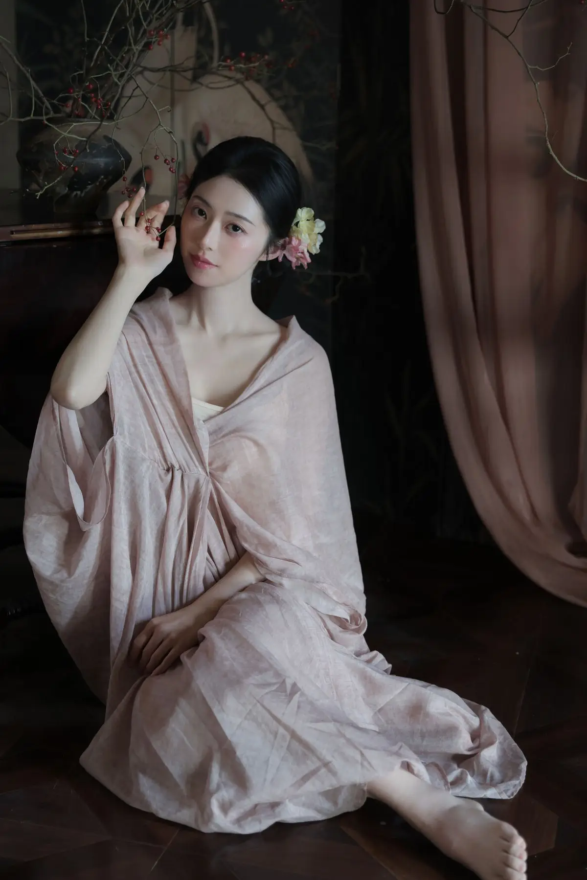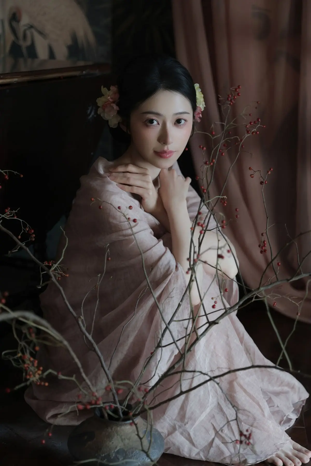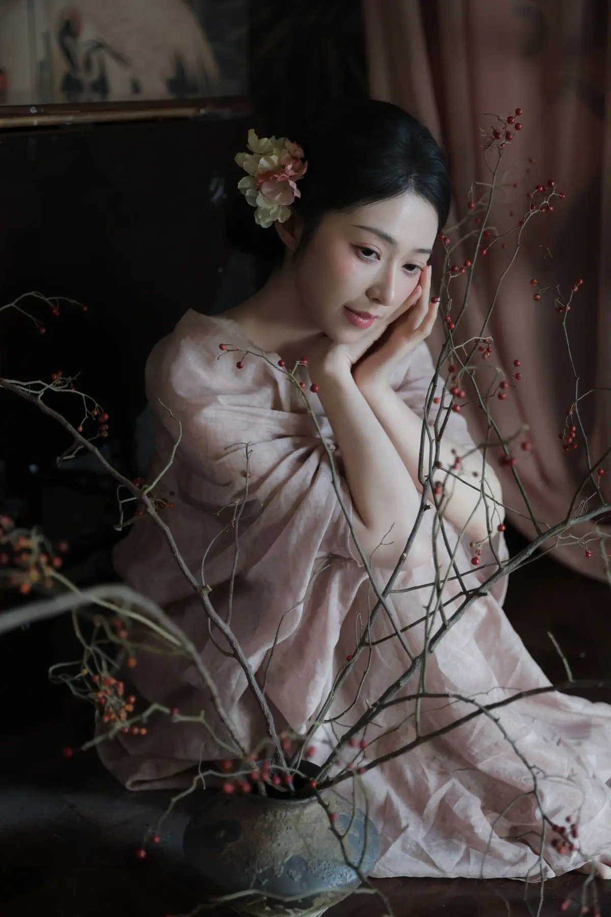 This image from YiTuYu Vol.8577 showcases Fen Mian Gu Niang, embodying captivating Oriental beauty. Dressed in a delicate, flowing traditional garment of soft pink, she radiates elegance and grace. Her pristine complexion, contemplative gaze, and intricately styled hair adorned with subtle flowers evoke the image of a classical maiden from an ancient painting. With a serene expression, her hands gently cradle a small object, creating a moment rich in poetry and emotion. The dark background, featuring traditional bird and floral motifs, further accentuates her ethereal charm, immersing viewers in an irresistible atmosphere of traditional Chinese culture and art.#FenMianGuNiang #OrientalBeauty #TraditionalChinese #AsianAesthetic #CulturalElegance