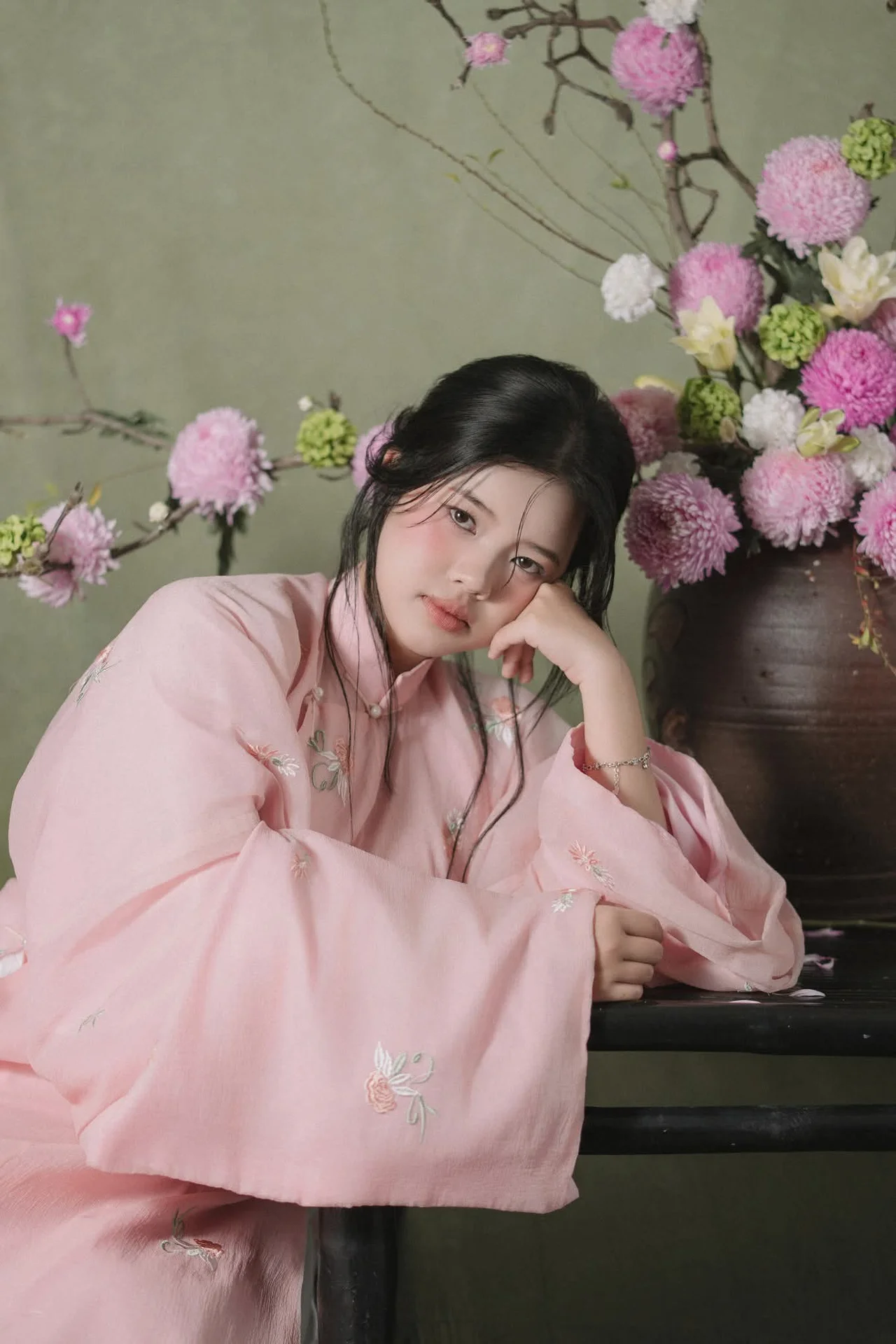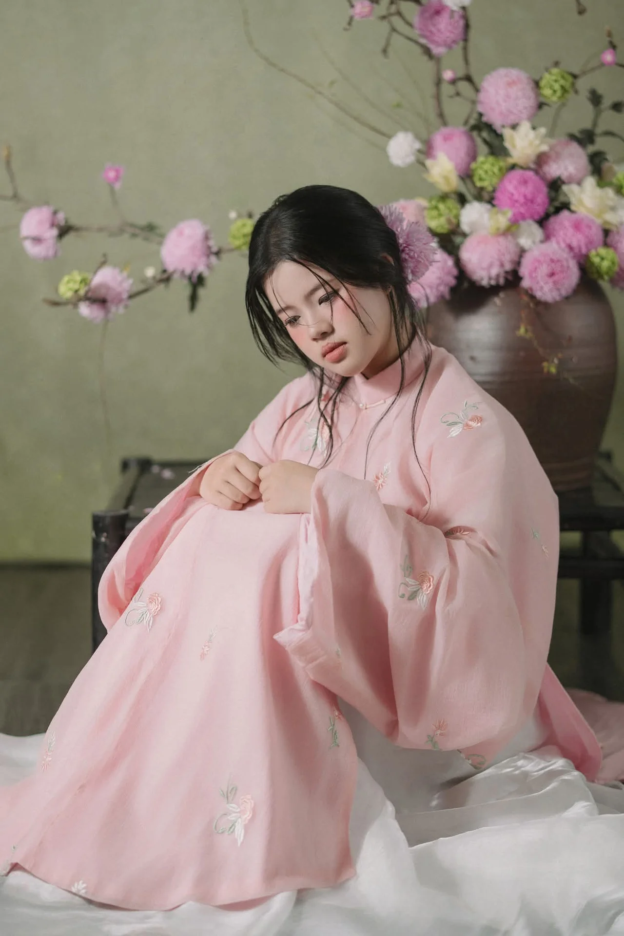 This visual masterpiece captures a moment of profound serenity and poetic beauty featuring a young woman draped in a traditional inspired ensemble that whispers stories of the past. The soft pastel pink silk adorned with delicate floral embroidery flows gracefully over layers of pristine white fabric creating a silhouette that is both ethereal and grounded. Her pensive gaze and gentle posture evoke a sense of quiet longing perfectly complemented by the muted sage green backdrop and the lush arrangement of pink blossoms. The interplay of light and shadow highlights the exquisite texture of the garments showcasing a sophisticated understanding of Vietnamese heritage fashion with a modern artistic twist. Every detail from the wisps of hair framing her face to the rustic wooden furniture contributes to a cinematic atmosphere that feels like a scene from a classic novel. It is a celebration of femininity grace and the enduring charm of cultural aesthetics in a contemporary setting that inspires any art lover.#ModernTraditional #MuseVibes #AsianAesthetics #PortraitPhotography #SilkFashion