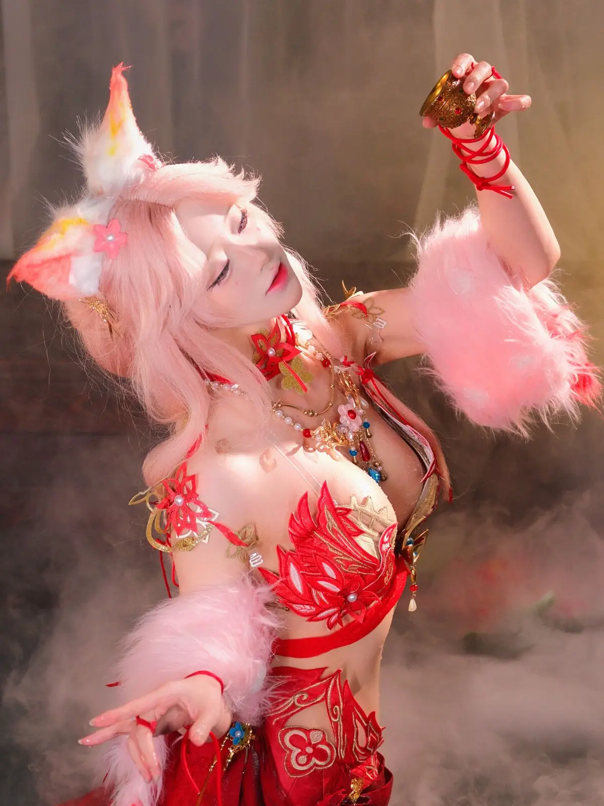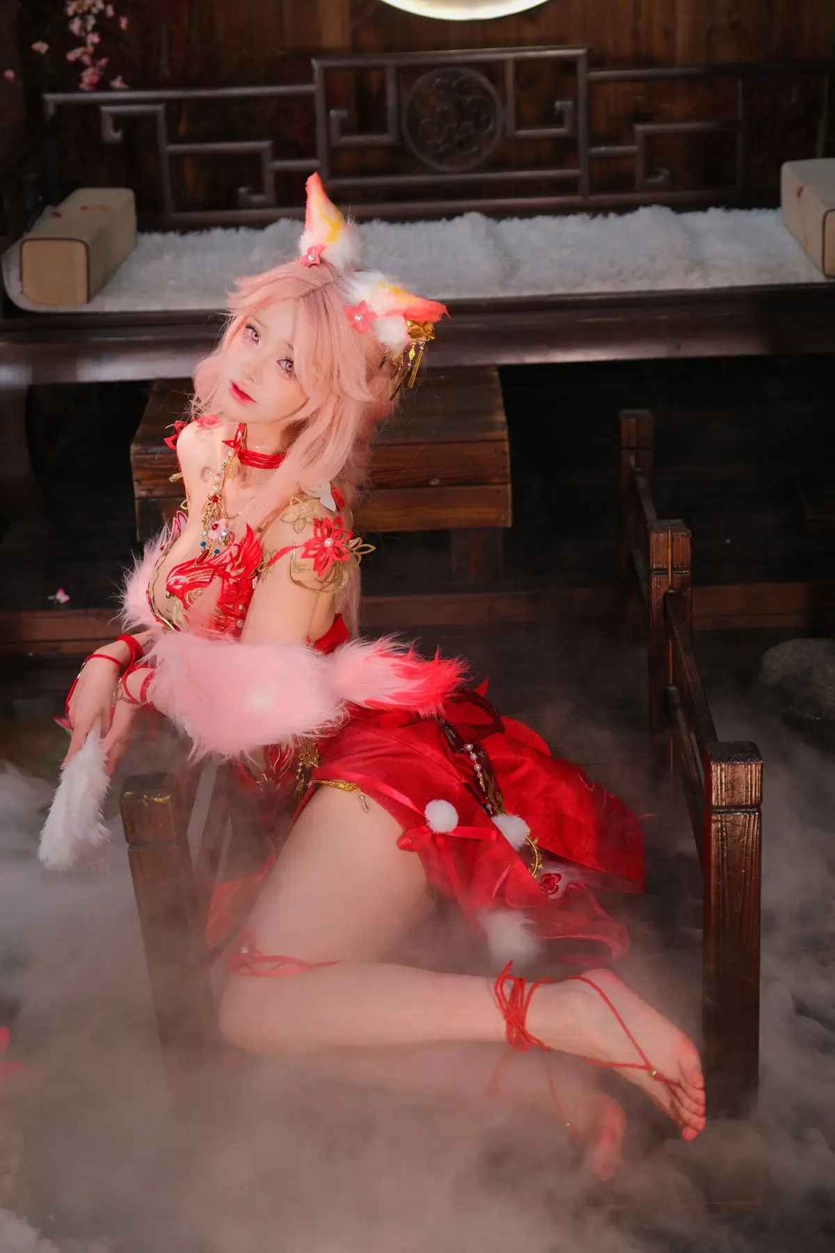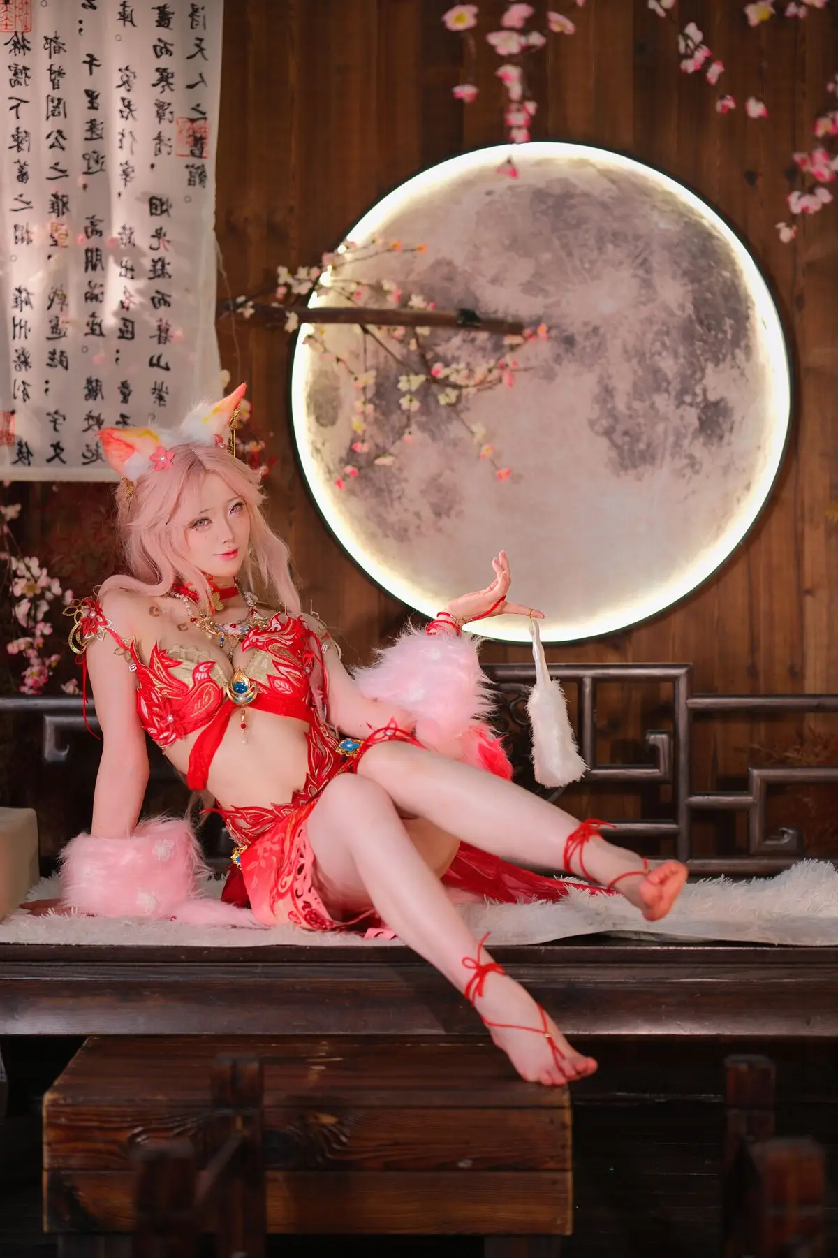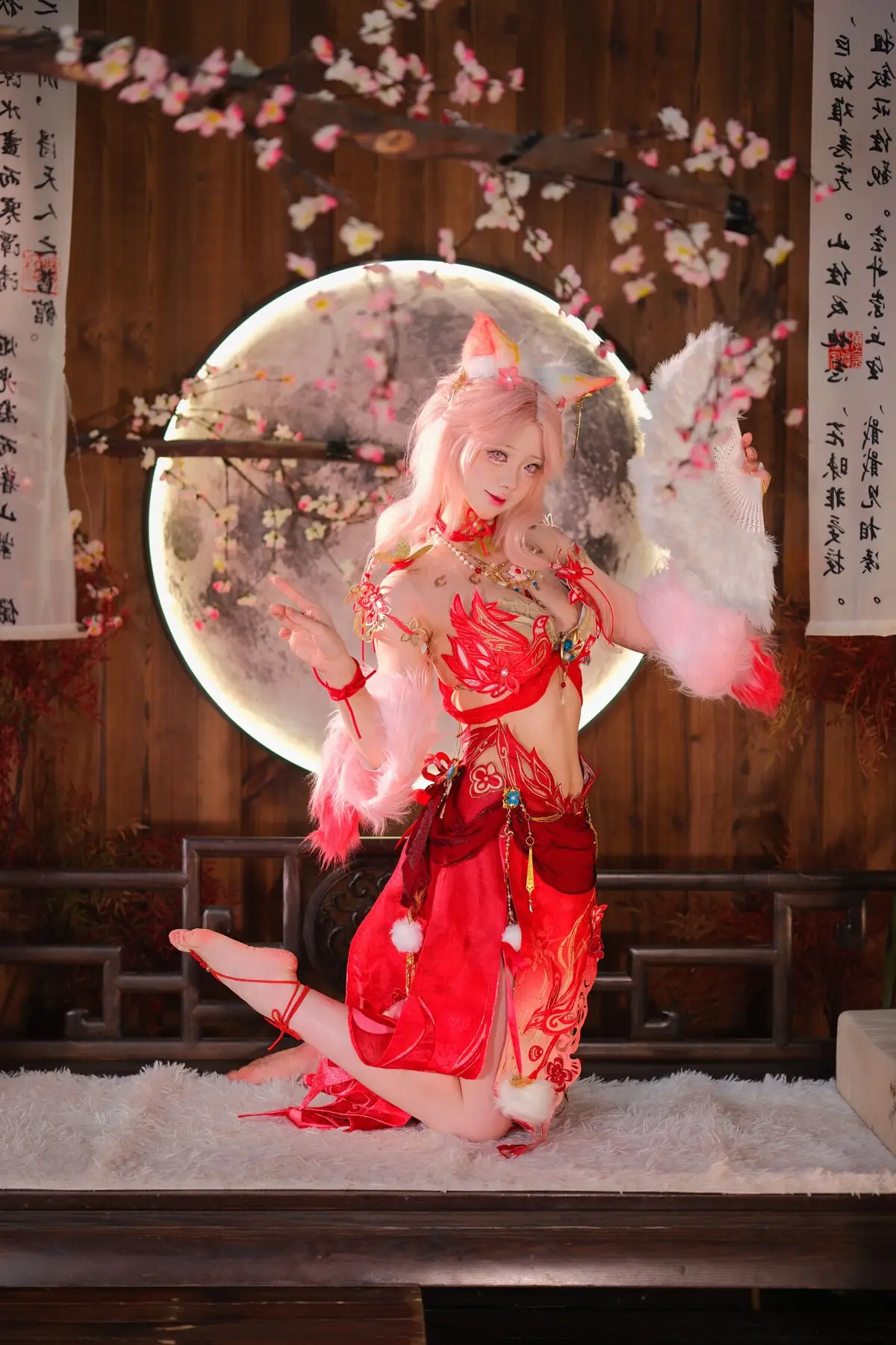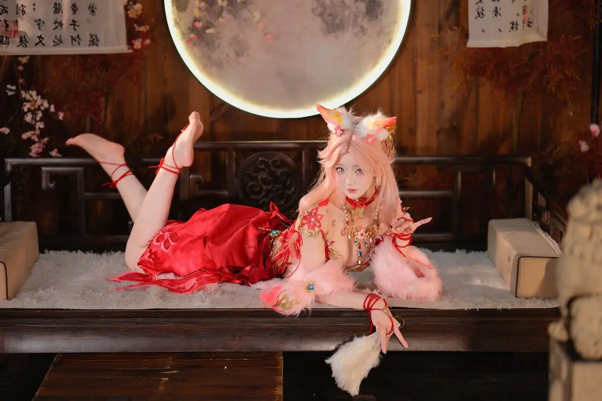 This stunning image features Coser Maeno Taita embodying Yulinglong from the game Naraka Bladepoint. She captivates in a vibrant red costume, posing gracefully with a white fan. The setting, rich in Asian aesthetic, with delicate cherry blossoms and a prominent moon motif, creates an ethereal and mysterious atmosphere. Maeno Taita perfectly portrays the fox spirit Yulinglong, exuding an alluring and enigmatic charm. Every detail, from the elaborate attire to her expressive pose, is meticulously crafted, drawing viewers into the fantastical world of Naraka Bladepoint. This impressive cosplay showcases the cosplayer's talent and dedication.#Cosplay #NarakaBladepoint #Yulinglong #MaenoTaita #AsianFantasy