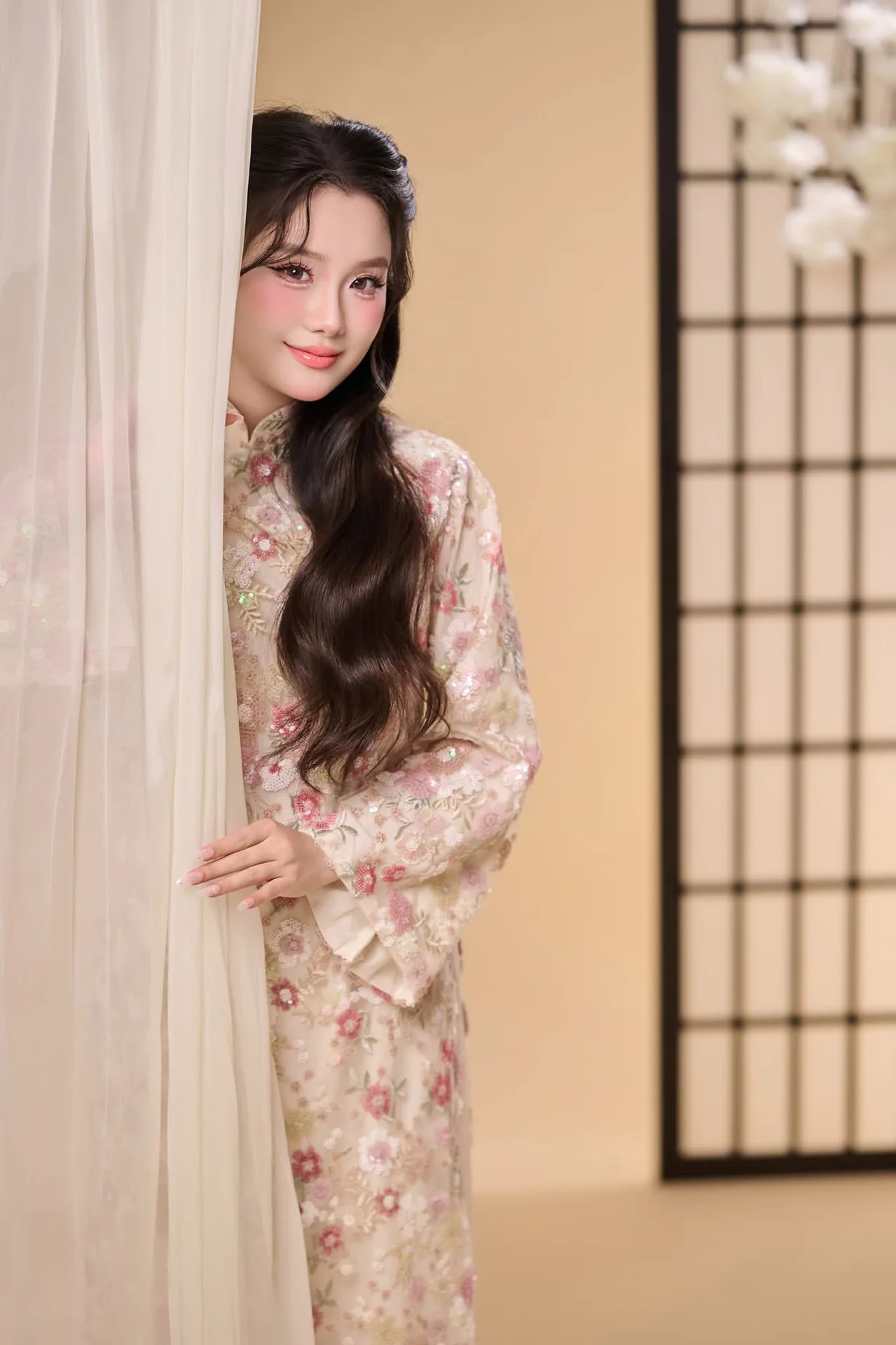 This captivating image showcases a beautiful young Vietnamese woman, radiating grace and elegance with her gentle smile and inviting gaze. She is adorned in a stunning modern Ao Dai, featuring intricate floral patterns on a light-colored fabric, beautifully blending traditional charm with contemporary style. Her long, dark hair, subtly accented with a delicate white flower, along with her soft, natural makeup, enhances her pure and serene Asian beauty. The subtle gesture of peeking from behind a sheer curtain adds an element of allure and mystery, inviting viewers to discover and appreciate this timeless portrayal of Vietnamese femininity and style.