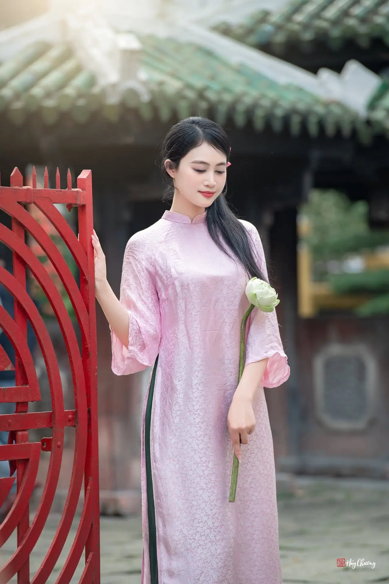 This stunning VGU No.163 image captures a Vietnamese girl in a traditional pink Ao Dai, exuding gentle beauty and elegance. With her long dark hair and a shy, serene gaze, she becomes the focal point of grace, blending seamlessly with the ancient architectural setting. The delicate floral patterned pink pastel Ao Dai paired with dark green silk trousers creates a harmonious contrast, honoring Vietnam's rich cultural heritage. The backdrop of an ancient temple or pagoda, featuring intricate carvings, further enhances the timeless beauty of both the attire and the person. This is not just a fashion photograph but a vivid symbol of the refined and modest charm of Vietnamese women, captivating all eyes with its perfect blend of modern allure and traditional values.