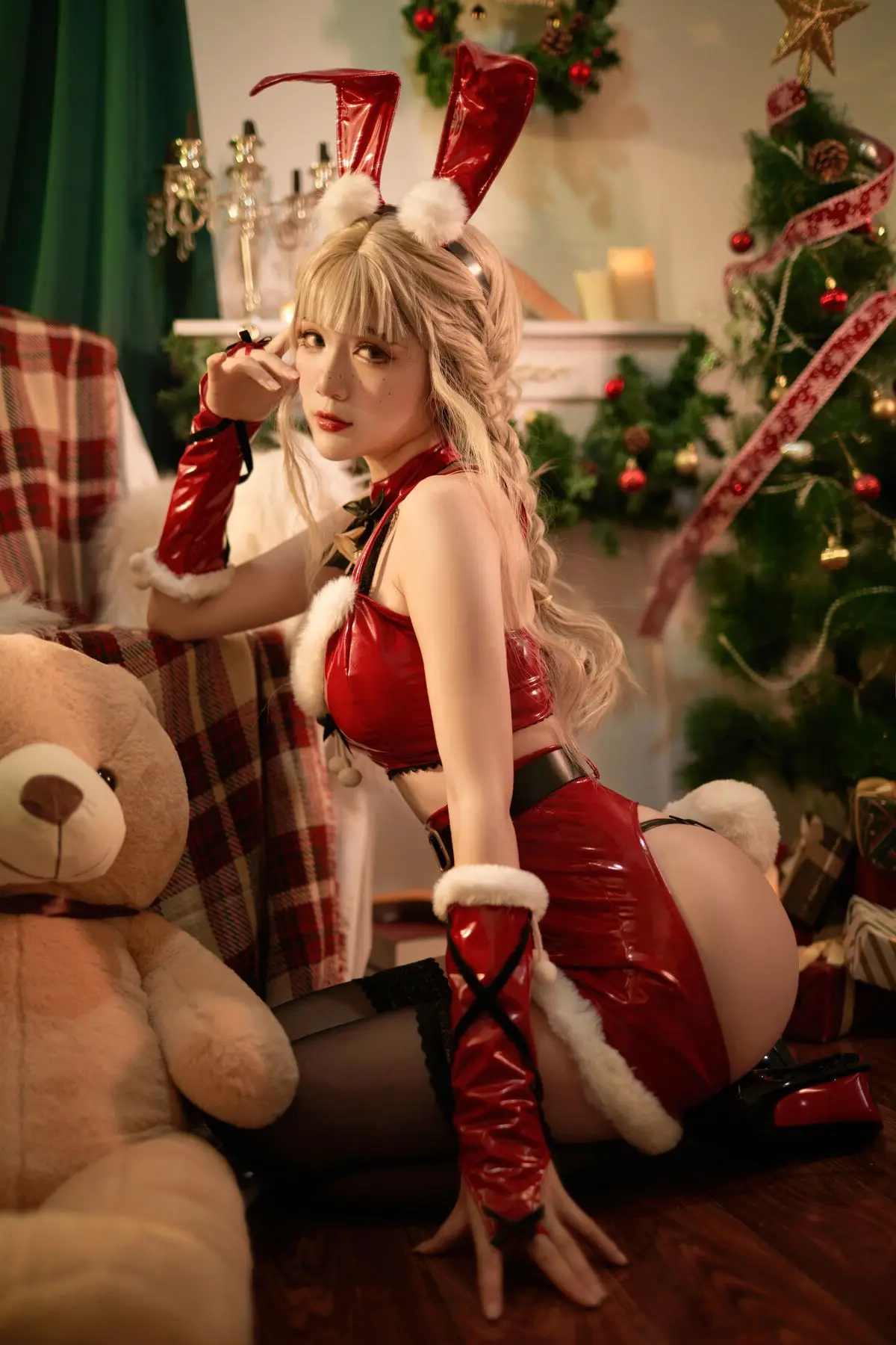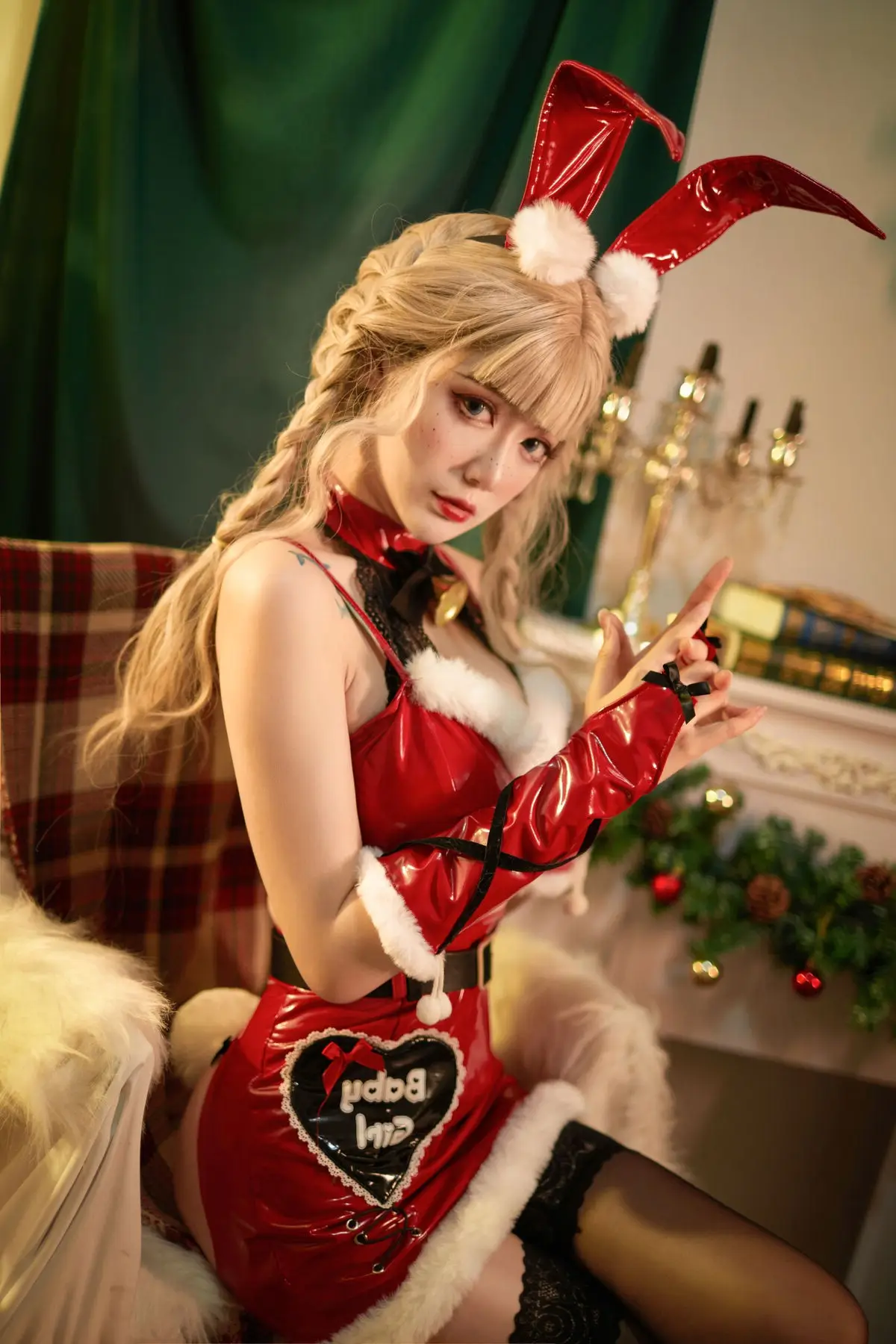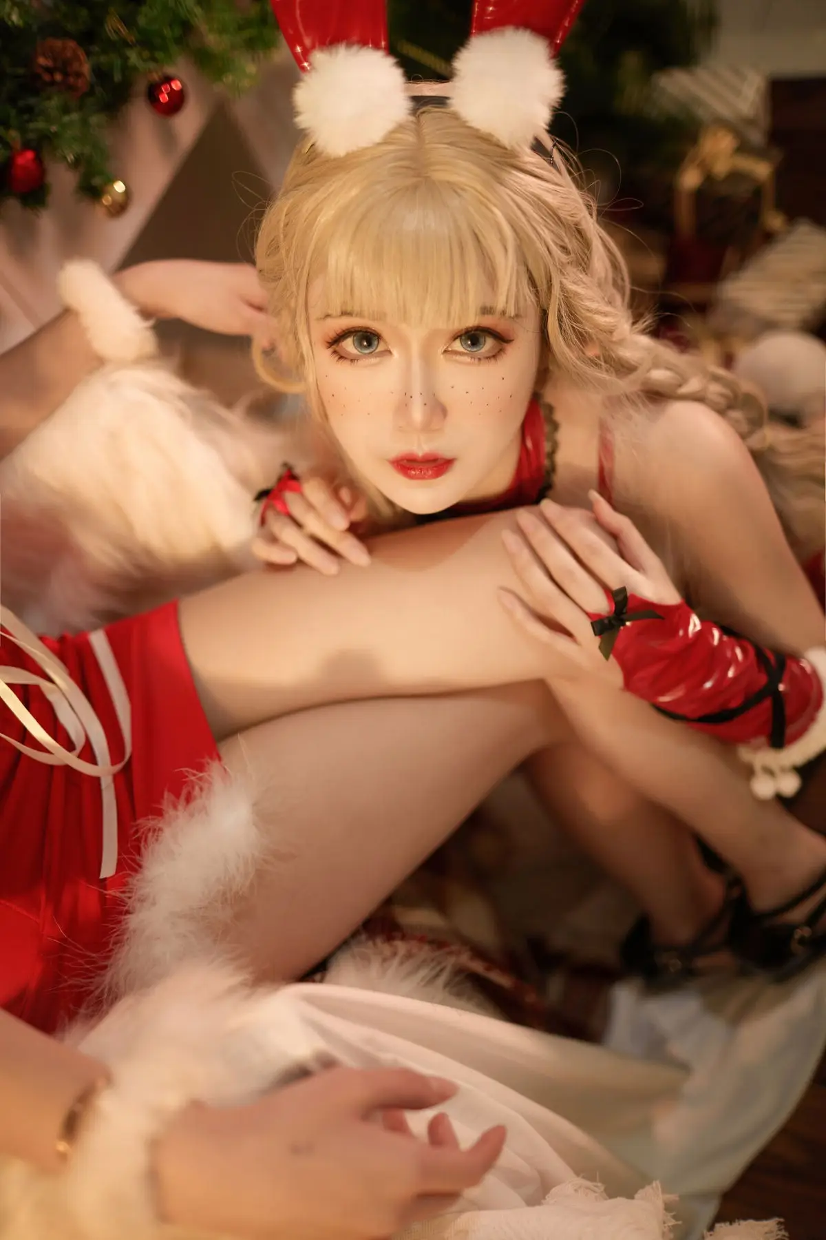 Coser Yi Mi Ba De Da Li Zi brings a unique festive spirit to Christmas 2021 with her captivating cosplay photoshoot She embodies an alluring Santa bunny girl seamlessly blending the playful charm of vibrant red bunny ears with the classic elegance of a red and white Santa outfit Every detail from the black bow with a tiny golden bell to the long red gloves enhances her enchanting appearance Her compelling gaze and golden braided hair set against a twinkling Christmas tree backdrop create a mesmerizing holiday scene This collection not only showcases creative cosplay but also radiates a warm and inviting Christmas cheer making it a truly memorable holiday visual