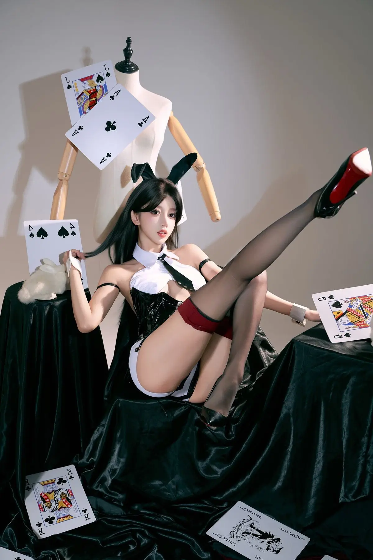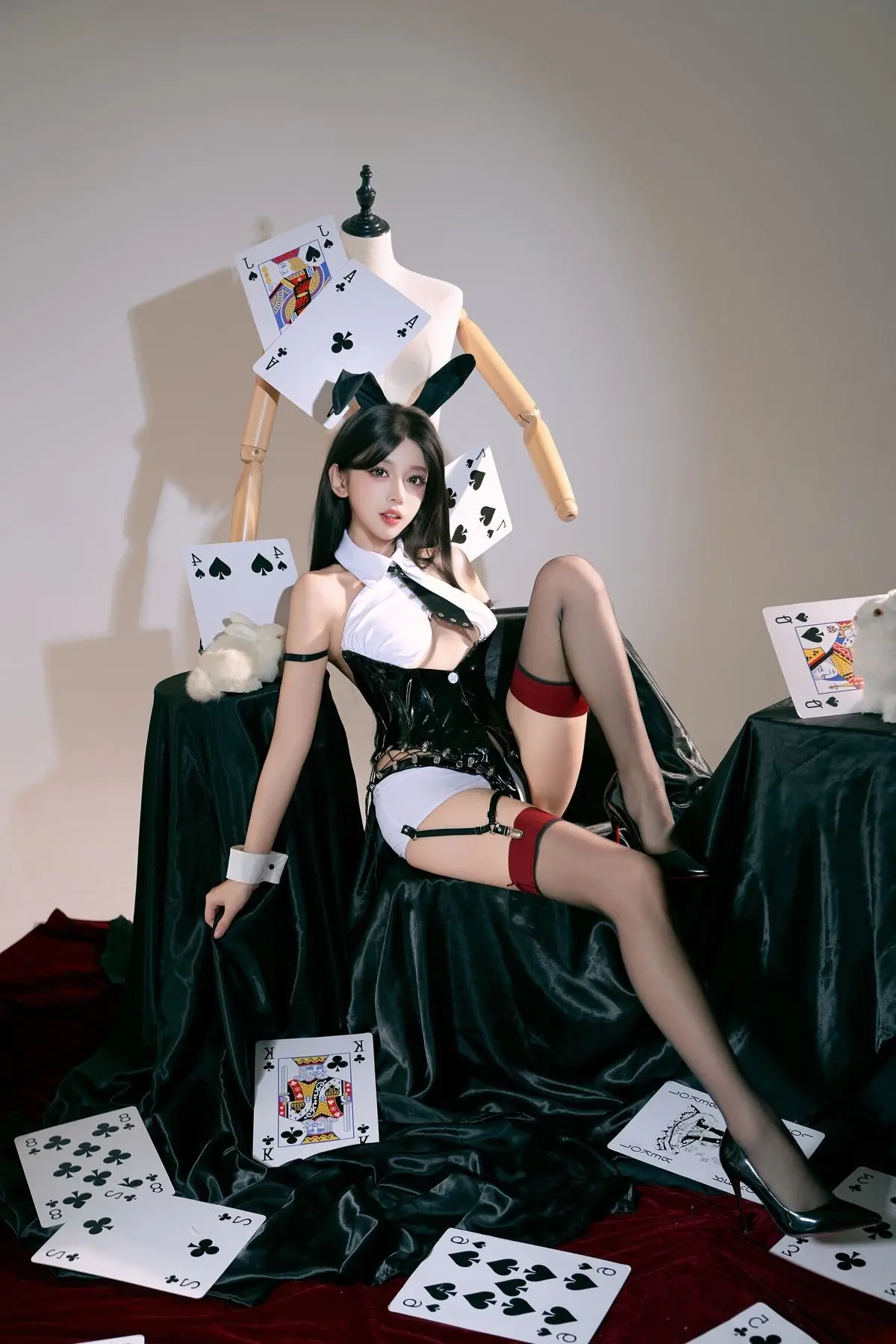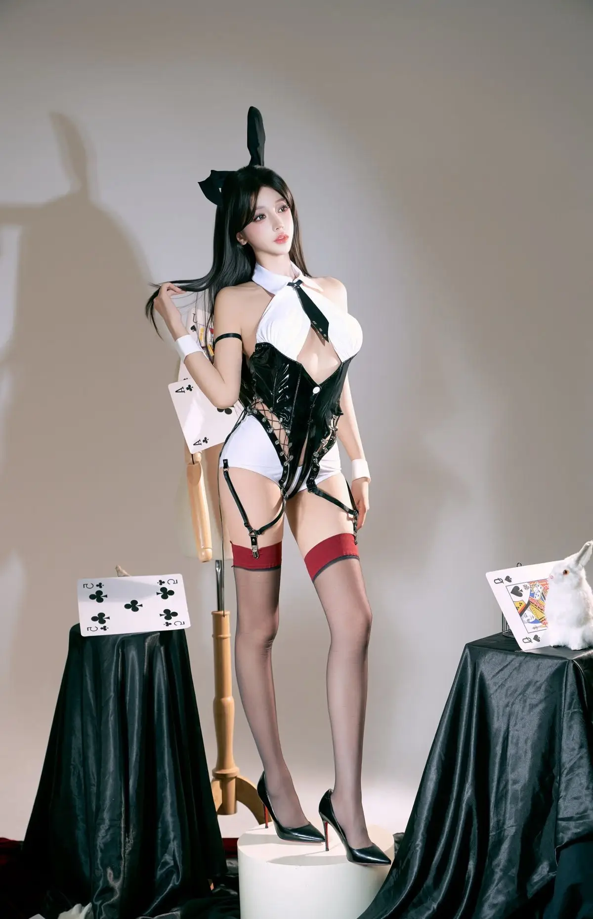 In this captivating photo set, Coser XueqiSAMA shines as the alluring Card Bunny Girl, exuding confidence and charm. She wears a sophisticated black and white bunny outfit, gracefully combining playful bunny ears with elegant card-themed details, from a stylish tie to striking red-accented thigh-high stockings. Every element is meticulously crafted, enhancing her slender figure and captivating presence. The minimalist yet effective backdrop, featuring oversized playing cards and white bunny figures as props, perfectly complements the enchanting Card Bunny Girl theme. This exceptional cosplay showcases XueqiSAMA's professionalism and alluring charisma, promising to delight cosplay enthusiasts.#Coser #Xueqi #SAMA #CardBunnyGirl #BunnyGirlCosplay #CosplayFashion
