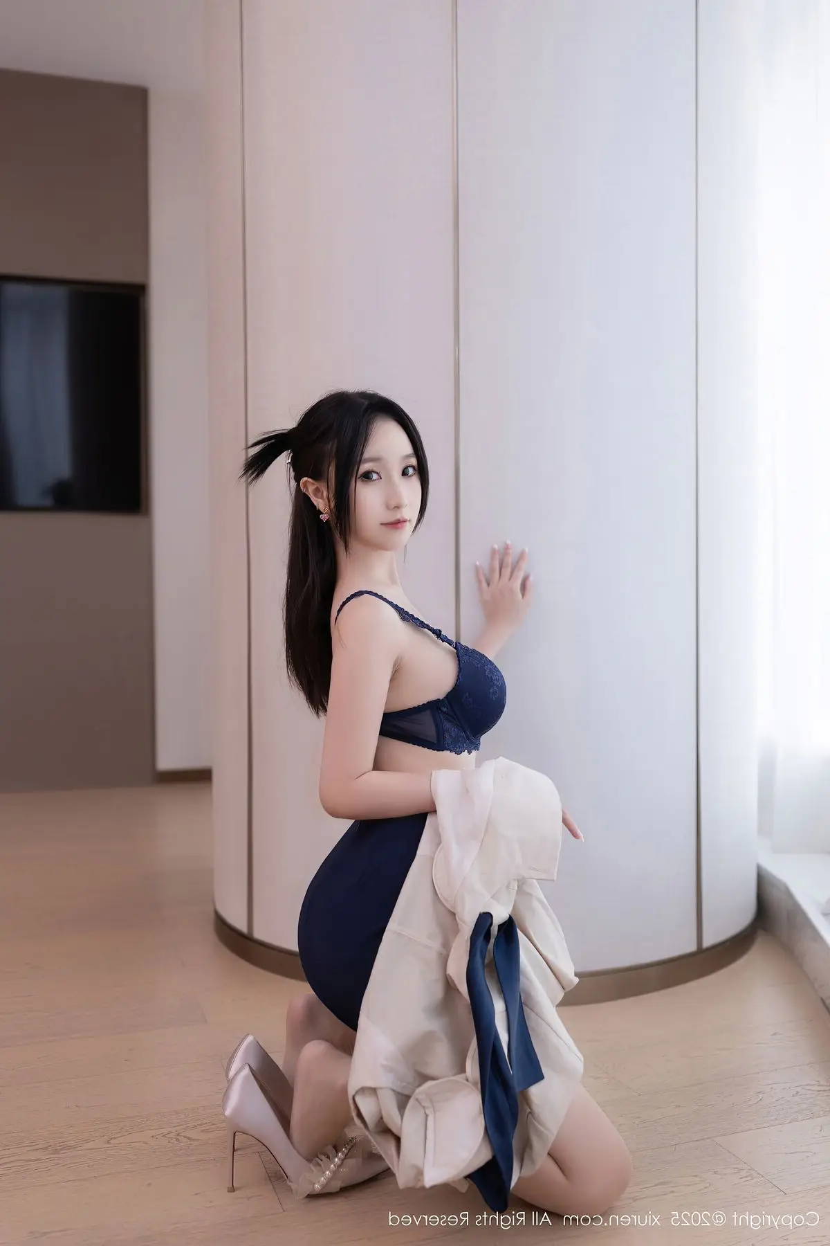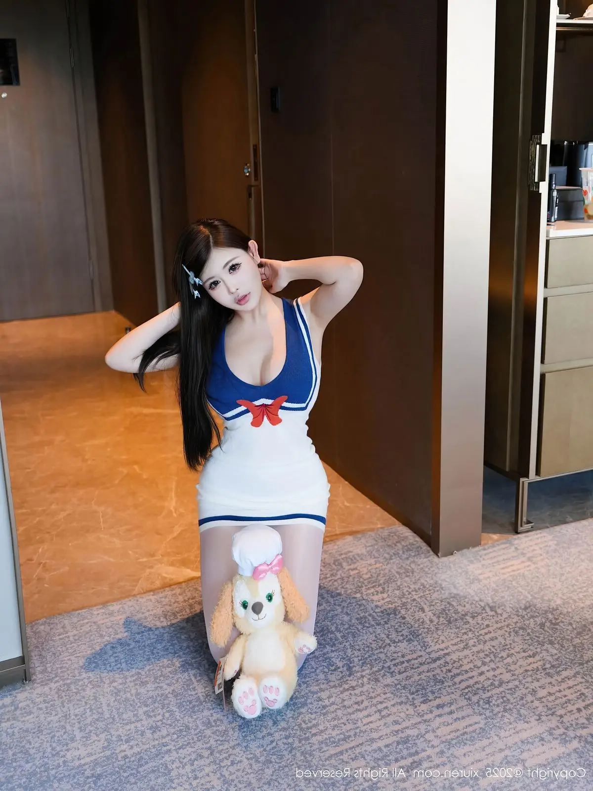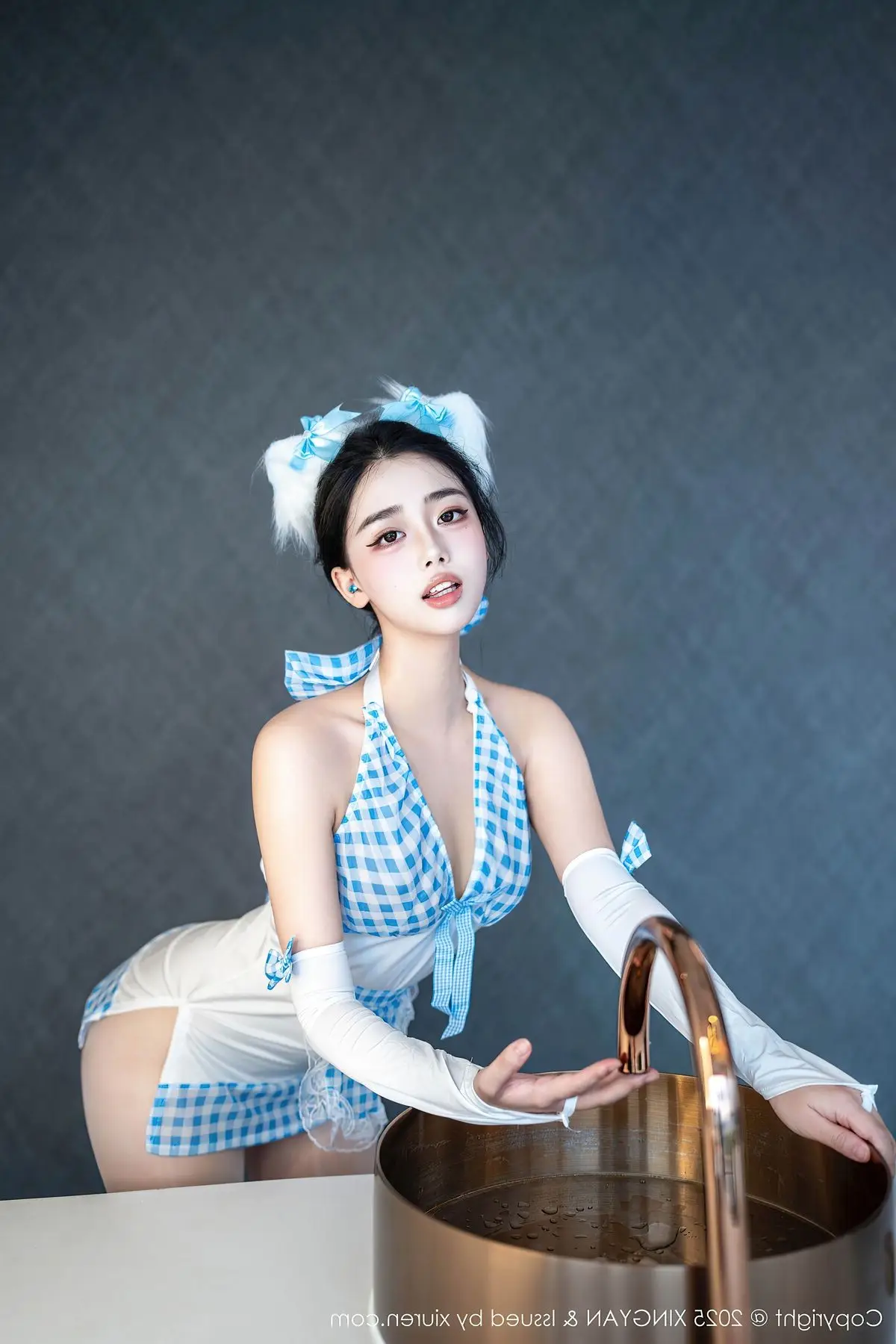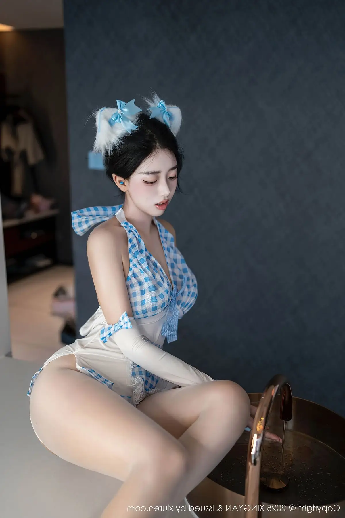 This captivating image features Ruan Fu Fu from XingYan Vol399 exuding a sweet and alluring charm The model is elegantly dressed in a stylized blue and white maid outfit blending playfulness with subtle sensuality Every contour of her figure is gracefully highlighted from her slender long legs to her inviting captivating gaze Her elegant pose beside a bronze sink creates a unique artistic scene Ruan Fu Fu a rising star embodies freshness and style delivering fashion-forward and emotionally rich photographs This collection is sure to mesmerize viewers reaffirming the irresistible appeal of this beautiful model and her distinctive presence in the world of fashion photography#RuanFuFu #XingYan #AsianModel #MaidOutfit #CaptivatingBeauty #FashionPhotography