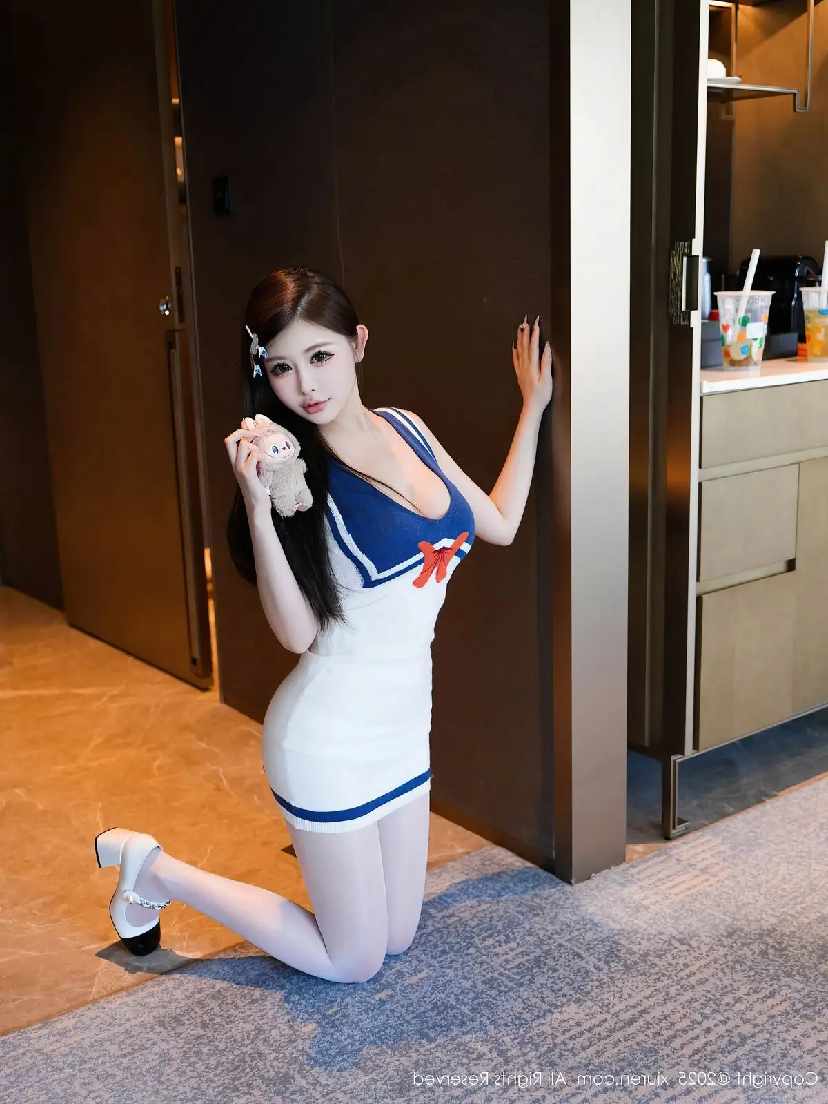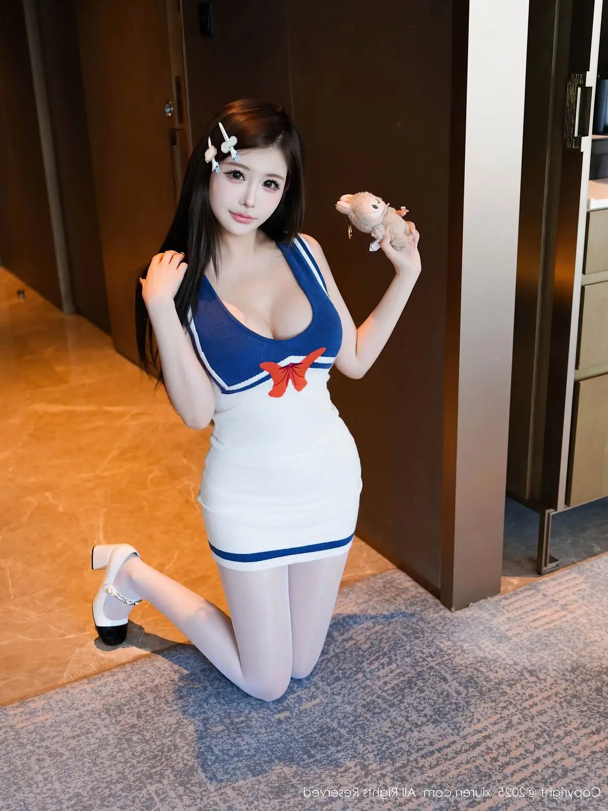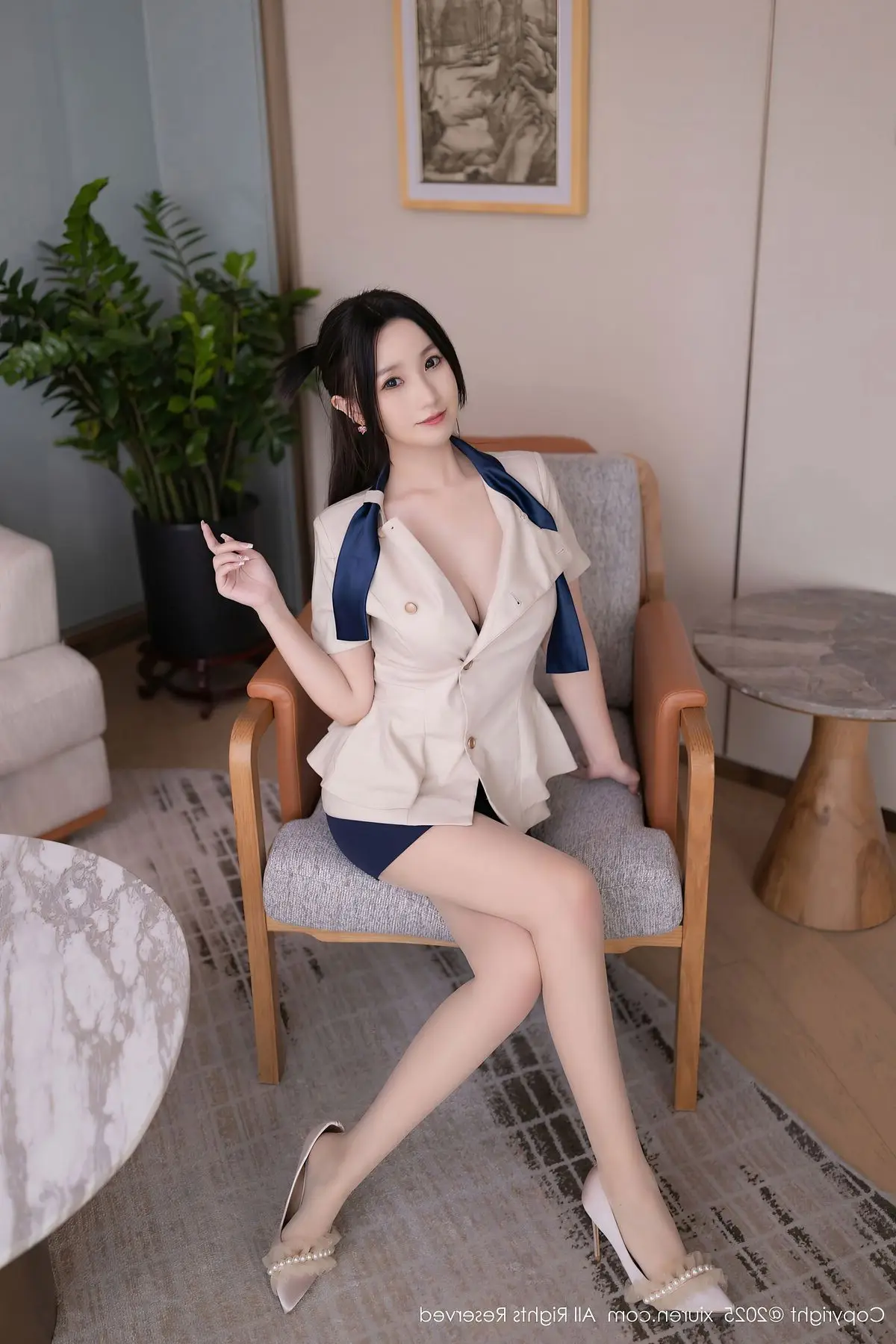 In this impressive XiuRen No.10628 photo collection Tian Ni shines with captivating beauty and unique style. She wears a stylized blue and white sailor outfit with a sophisticated form-fitting design that gracefully highlights her slender figure and alluring curves. With a graceful seated pose combined with white stockings and high heels Tian Ni exudes confident charisma her direct gaze utterly captivating. The sailor outfit offers a harmonious blend of youthful dynamism and subtle sensuality. This photo collection not only captures beautiful moments but also vividly portrays Tian Ni's professionalism and irresistible charm promising a mesmerizing visual experience for viewers.#TianNi #XiuRen #SailorOutfit #AsianModel #CaptivatingBeauty