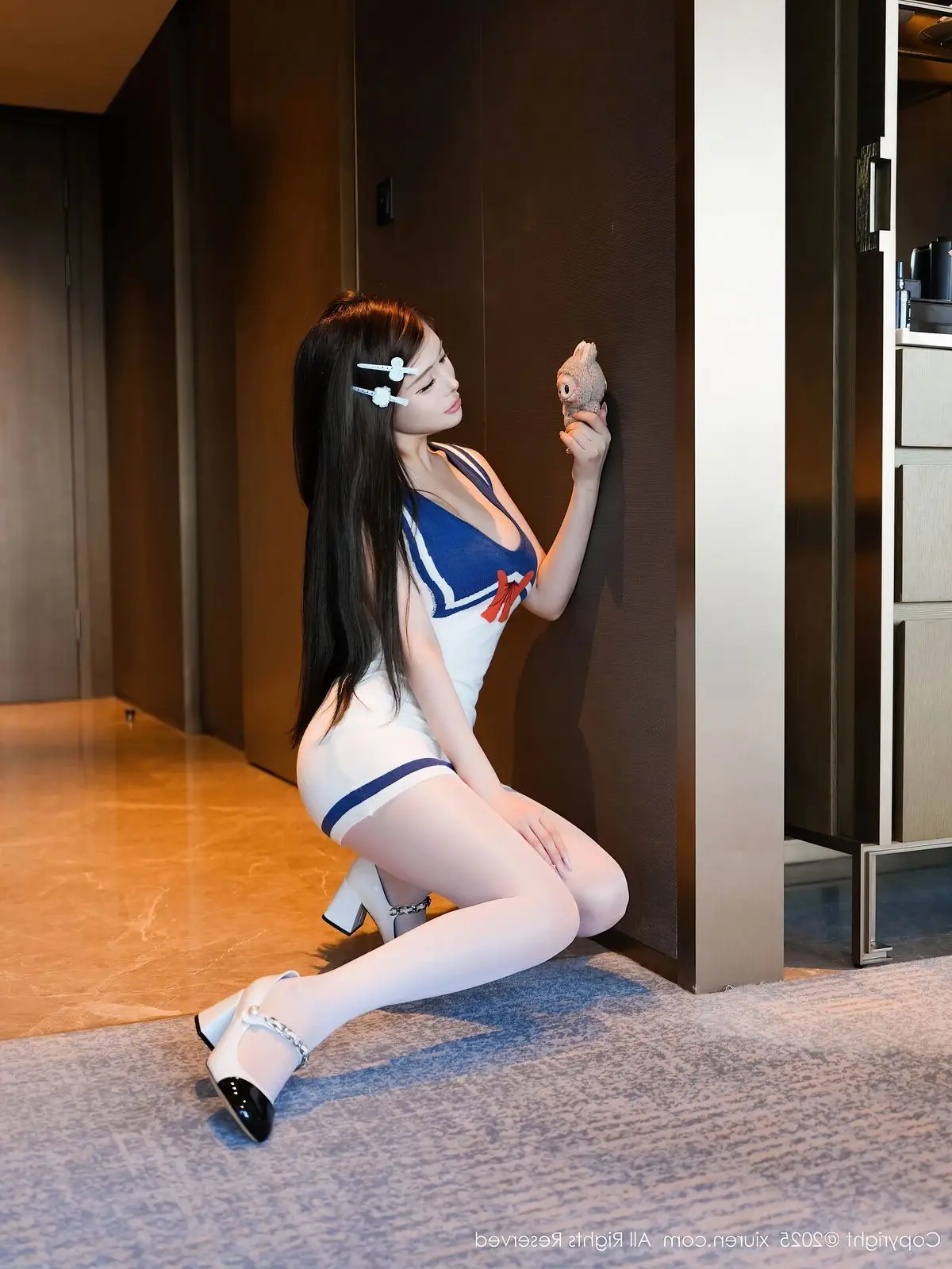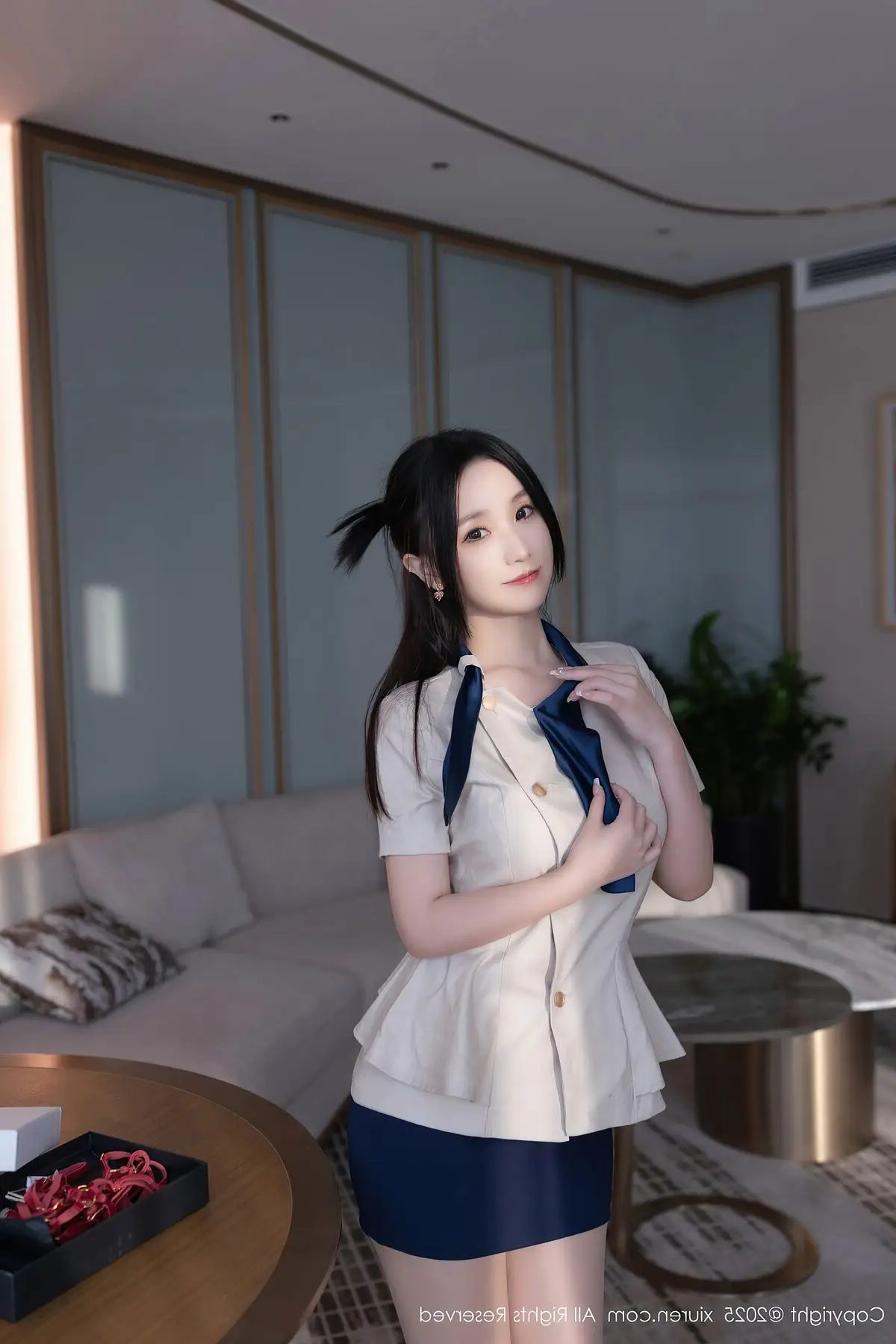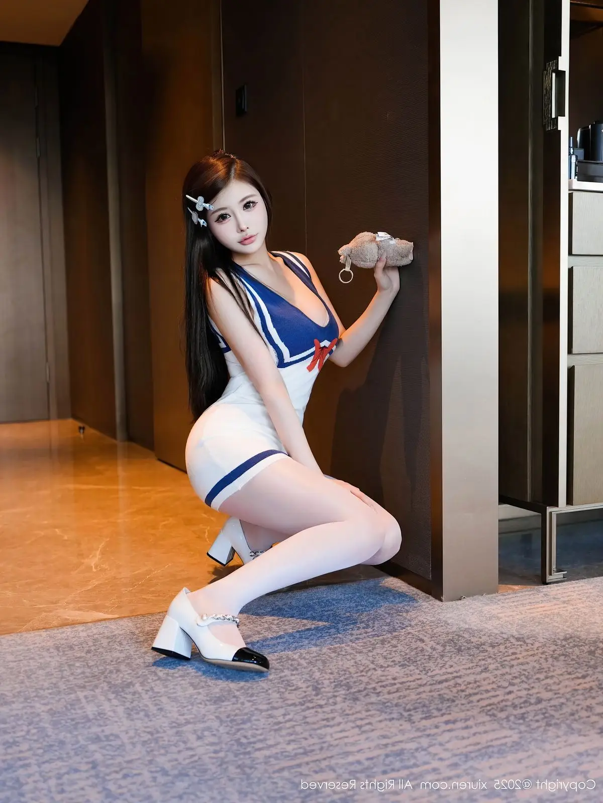 In this impressive XiuRen No.10628 photo collection Tian Ni shines with captivating beauty and unique style. She wears a stylized blue and white sailor outfit with a sophisticated form-fitting design that gracefully highlights her slender figure and alluring curves. With a graceful seated pose combined with white stockings and high heels Tian Ni exudes confident charisma her direct gaze utterly captivating. The sailor outfit offers a harmonious blend of youthful dynamism and subtle sensuality. This photo collection not only captures beautiful moments but also vividly portrays Tian Ni's professionalism and irresistible charm promising a mesmerizing visual experience for viewers.#TianNi #XiuRen #SailorOutfit #AsianModel #CaptivatingBeauty