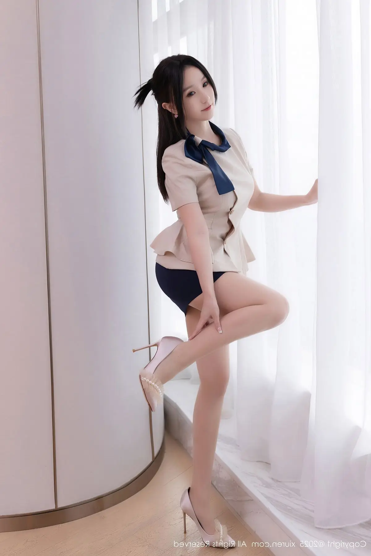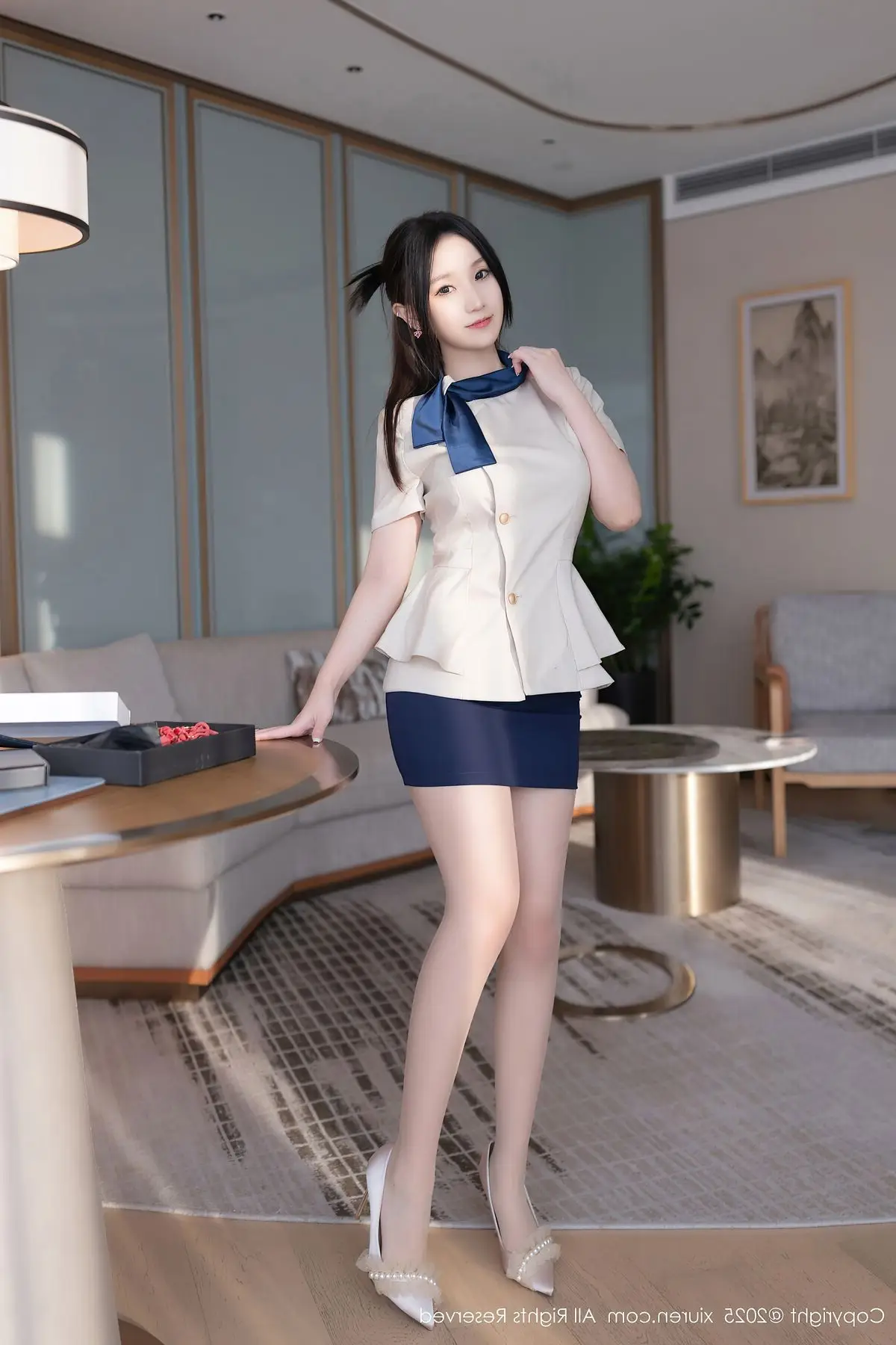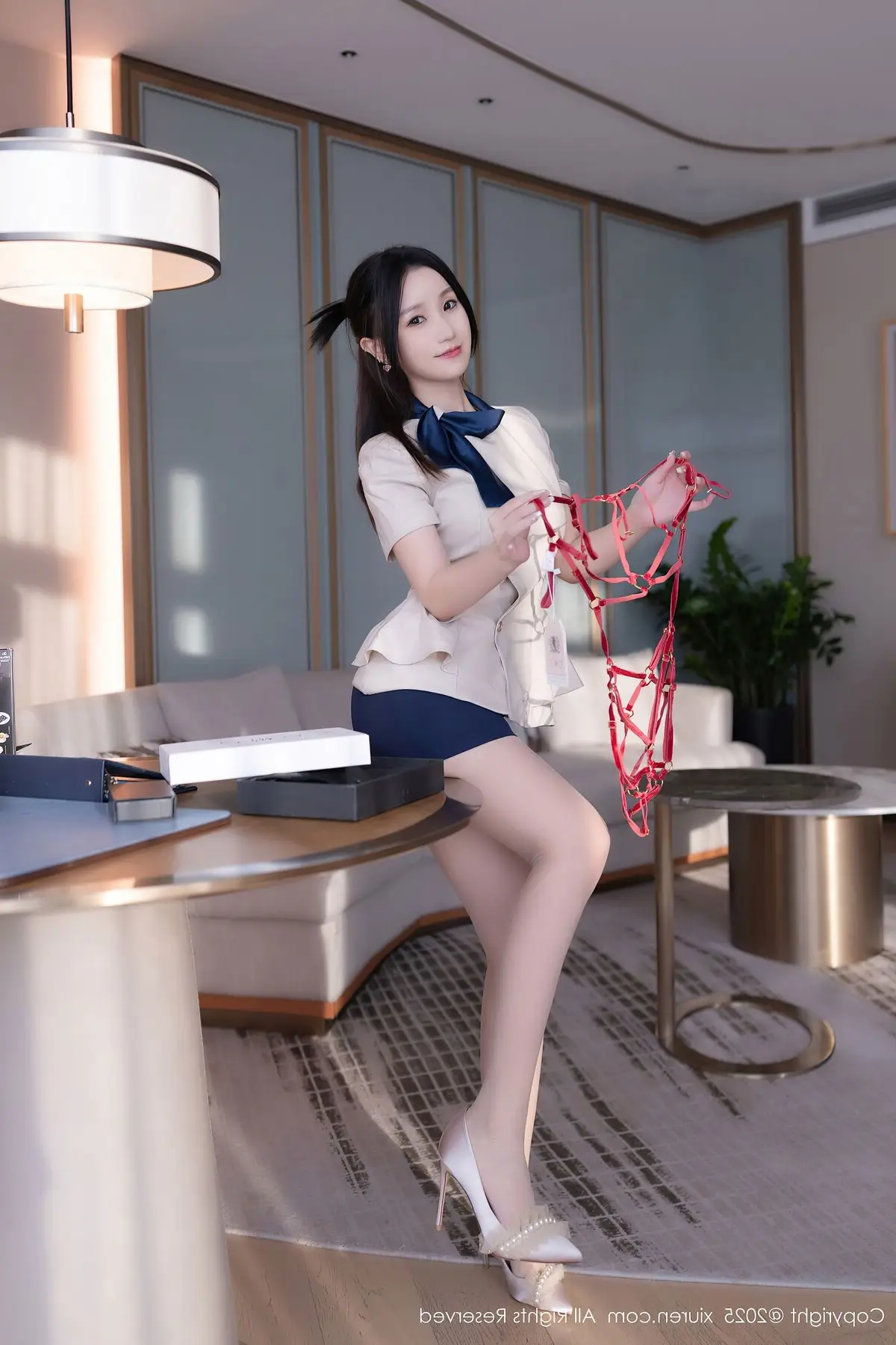 Su Yi Nuo in the XiuRen No.10727 collection presents an enchanting and professional image. Dressed in a stylized office outfit featuring an elegant white blazer and a modern short skirt, she gracefully showcases her alluring figure and slender long legs in black stockings. Her confident gaze, subtle smile, and graceful pose on the desk create an irresistible charm. The luxurious and modern interior setting further accentuates Su Yi Nuo's refined beauty and captivating demeanor. This photoshoot not only highlights her impressive fashion sense but also radiates the confidence and power of a modern woman, undoubtedly captivating every gaze.#SuYiNuo #XiuRen #OfficeFashion #CaptivatingBeauty #ModernStyle #OL #Secretary #OfficeLady