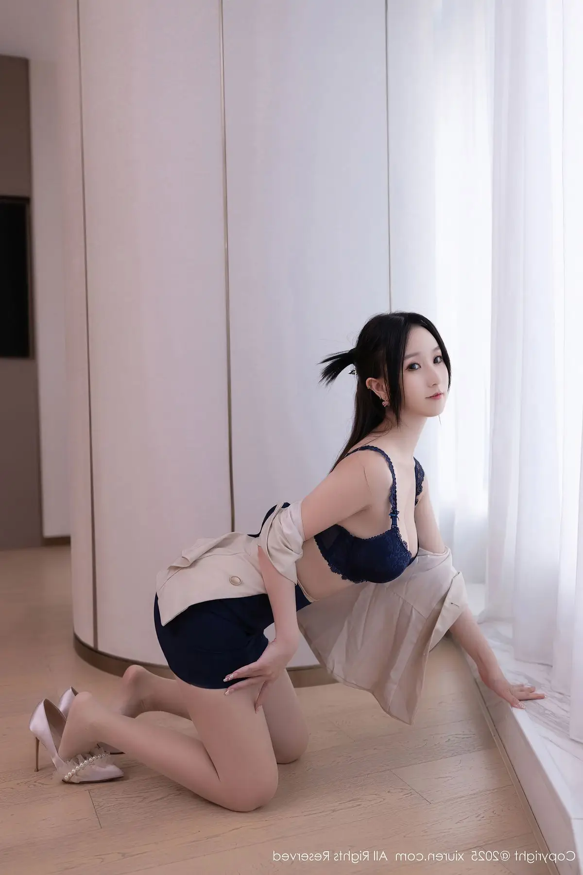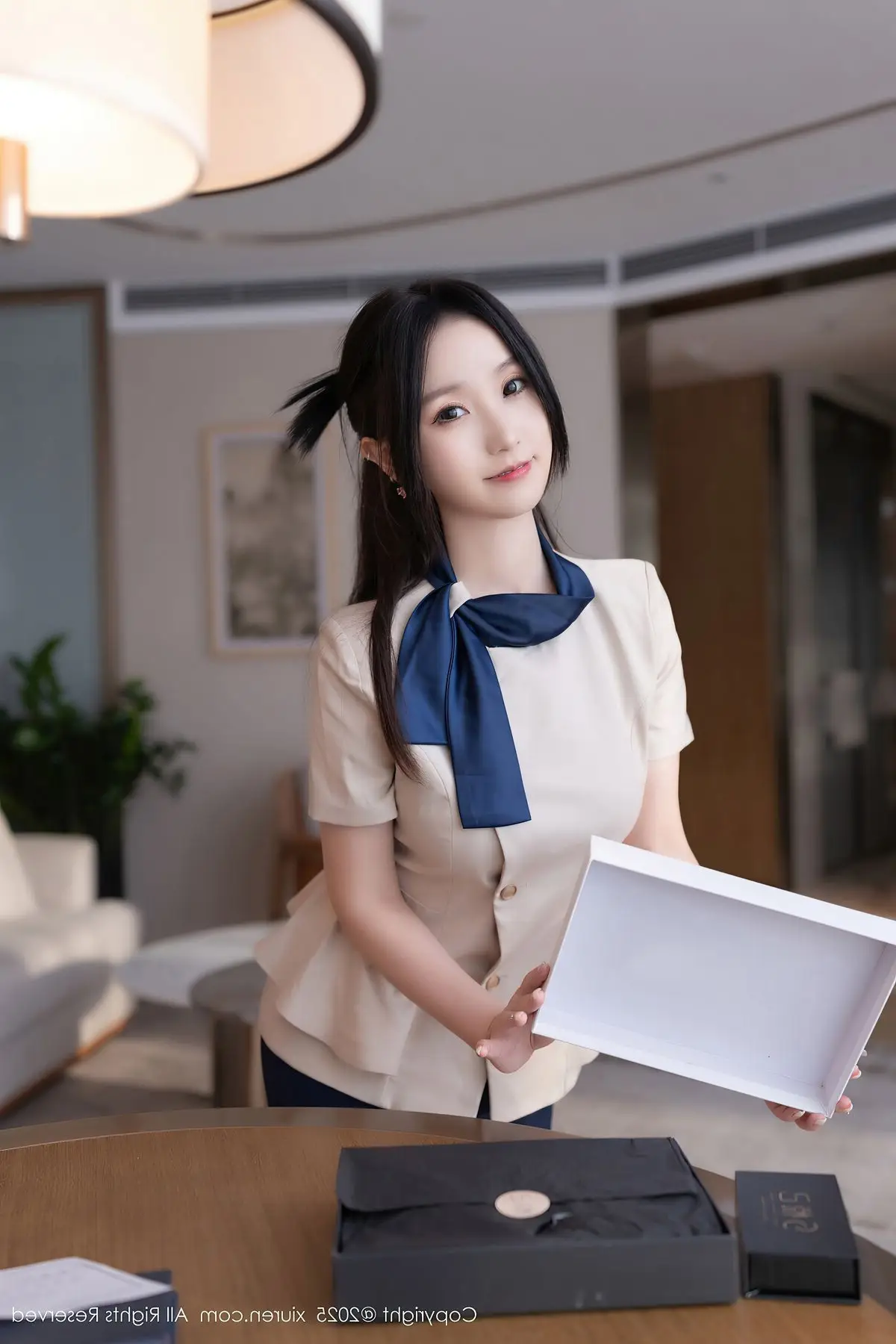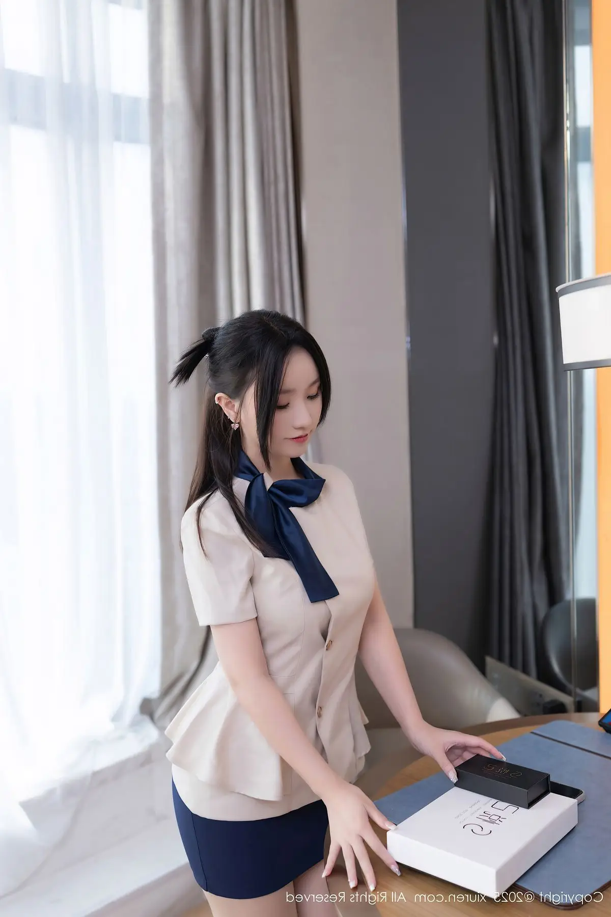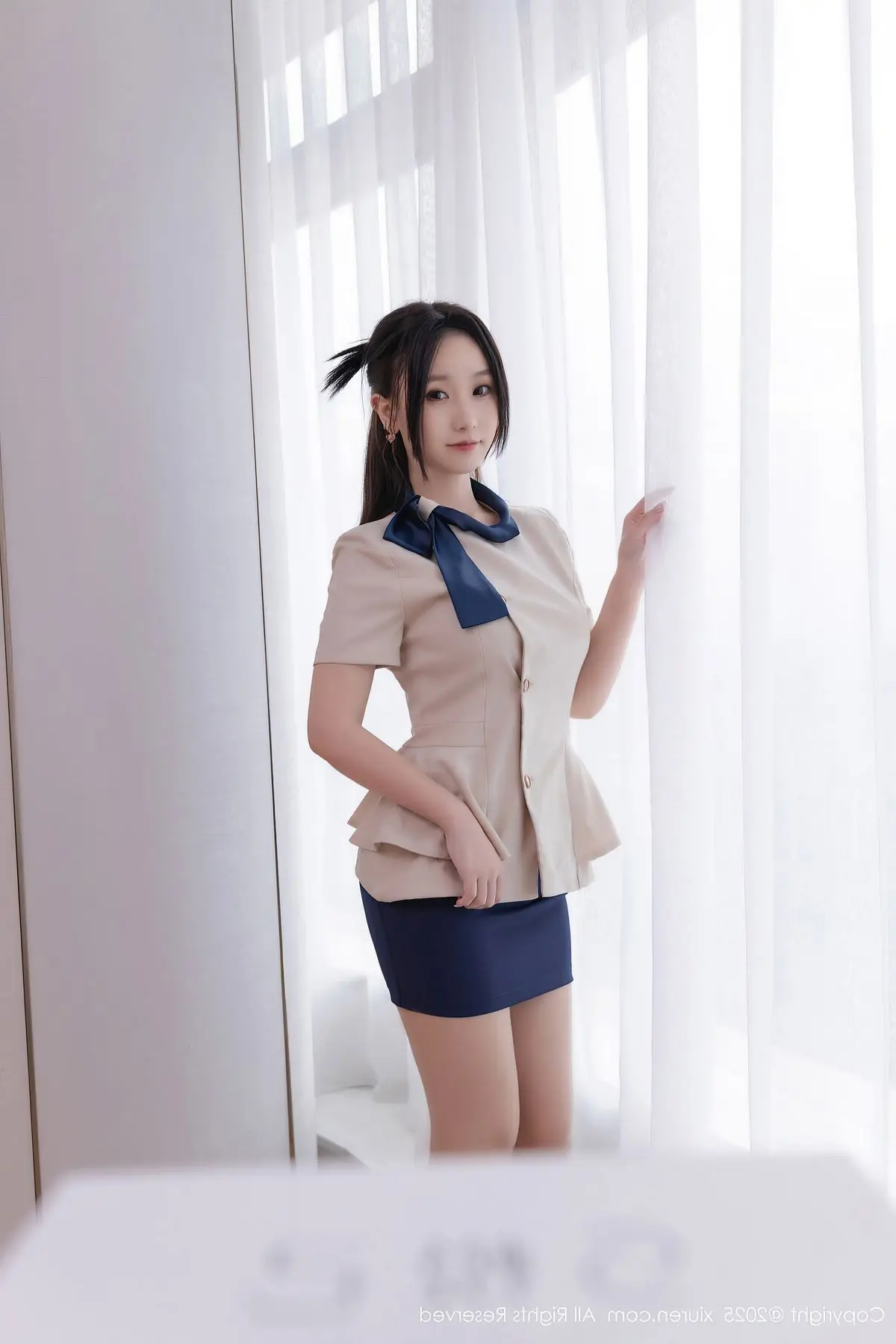 Su Yi Nuo in the XiuRen No.10727 collection presents an enchanting and professional image. Dressed in a stylized office outfit featuring an elegant white blazer and a modern short skirt, she gracefully showcases her alluring figure and slender long legs in black stockings. Her confident gaze, subtle smile, and graceful pose on the desk create an irresistible charm. The luxurious and modern interior setting further accentuates Su Yi Nuo's refined beauty and captivating demeanor. This photoshoot not only highlights her impressive fashion sense but also radiates the confidence and power of a modern woman, undoubtedly captivating every gaze.#SuYiNuo #XiuRen #OfficeFashion #CaptivatingBeauty #ModernStyle #OL #Secretary #OfficeLady