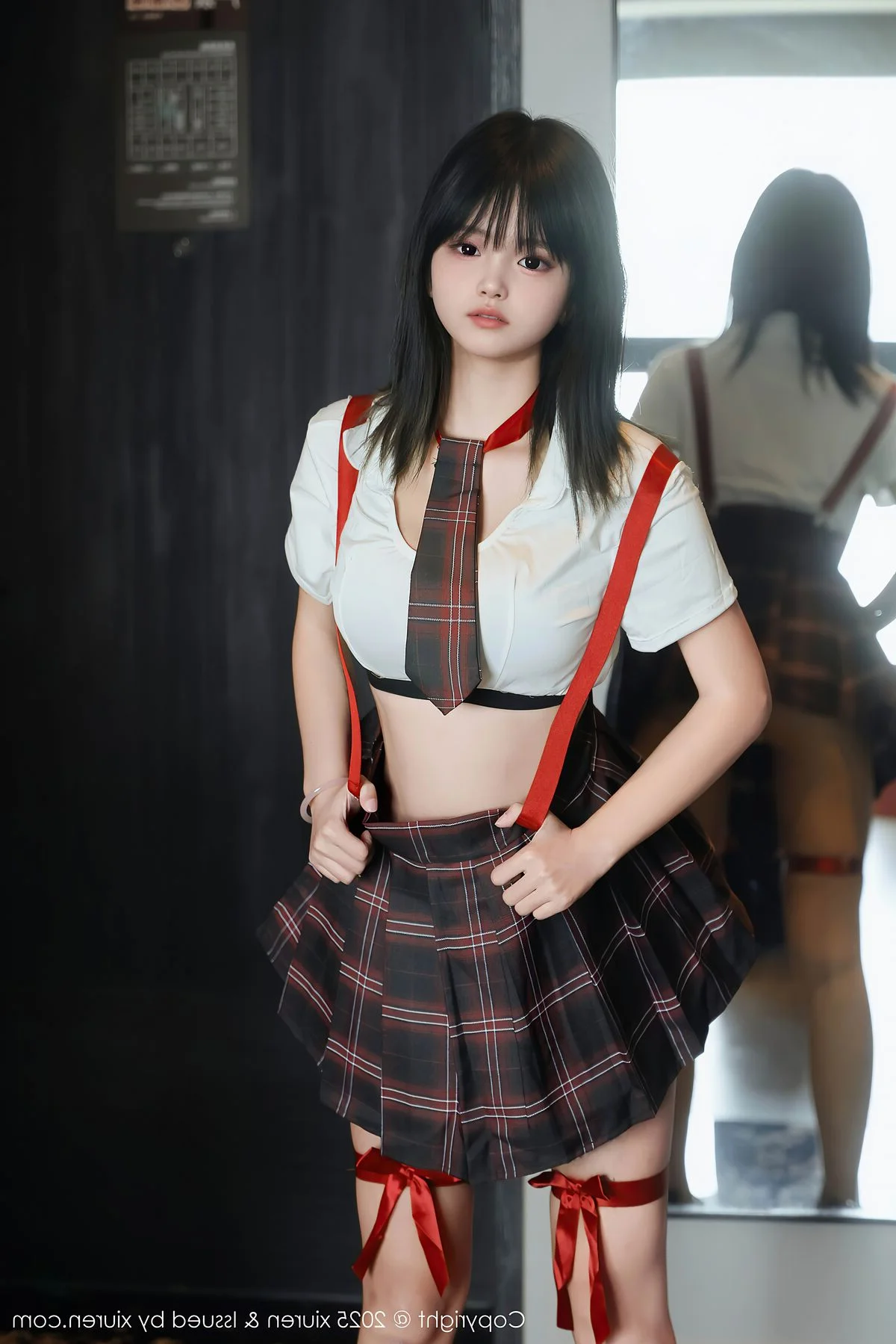 The XiuRen No.10774 collection showcases model Xiao Ling in captivating moments. In this image Xiao Ling exudes a sweet and alluring charm in a stylized schoolgirl outfit. She poses gracefully on a soft bed her enchanting gaze directed towards the viewer creating an intimate and inviting atmosphere. Her plaid skirt and pristine white shirt accentuate her fresh youthful beauty. Every gesture and look highlights the confidence and professional demeanor of a model. This photograph is not just a fashion piece but a narrative of grace and natural beauty offering a mesmerizing visual experience for fans of Xiao Ling and XiuRen.#XiuRen #XiaoLing #SchoolgirlFashion #AsianModel #CaptivatingBeauty