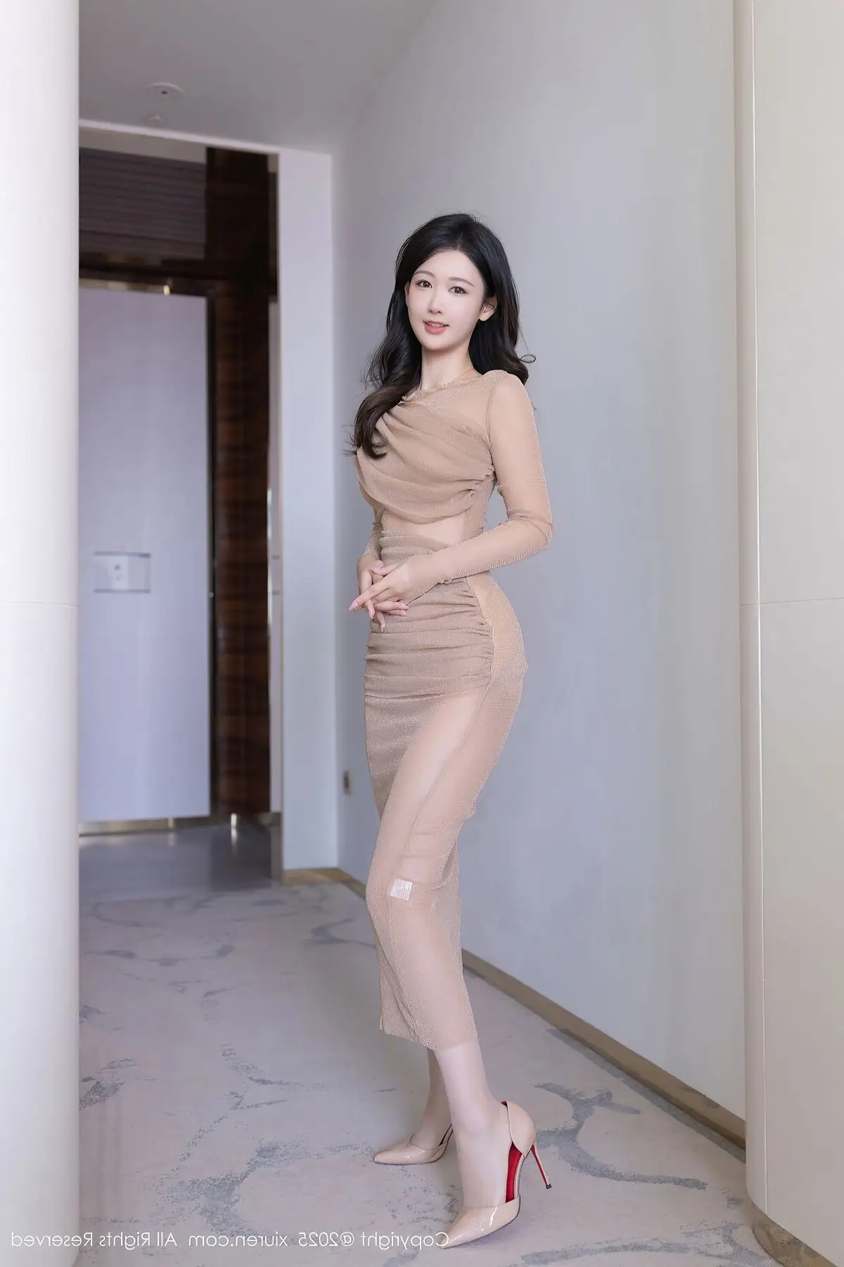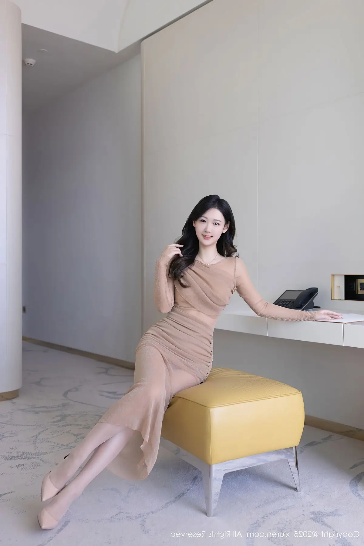 Explore the exclusive XiuRen No.10486 collection featuring model Tang An Qi. In this captivating image Tang An Qi exudes an irresistible blend of elegance and allure. She is adorned in a sophisticated nude colored dress that gracefully accentuates her slender figure and soft curves. The delicate fabric and clever design create a subtly sensual yet refined aesthetic. Her poised sitting posture and engaging gaze further highlight Tang An Qi's confident demeanor. This photo perfectly embodies modern fashion infused with classic charm offering a visually enchanting experience. The XiuRen No.10486 series is sure to delight admirers of refined and captivating beauty.#TangAnQi #XiuRen #NudeDress #ElegantStyle #CaptivatingBeauty