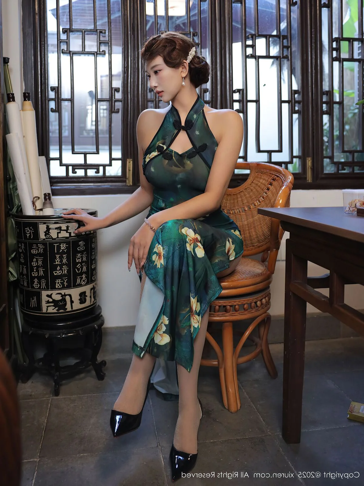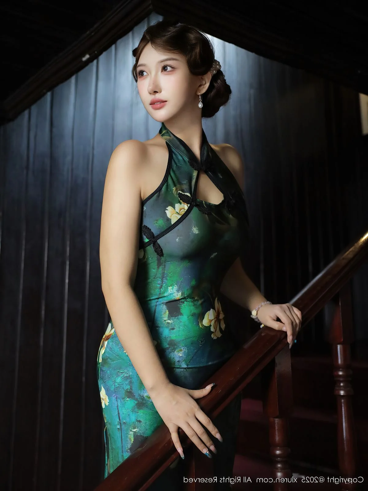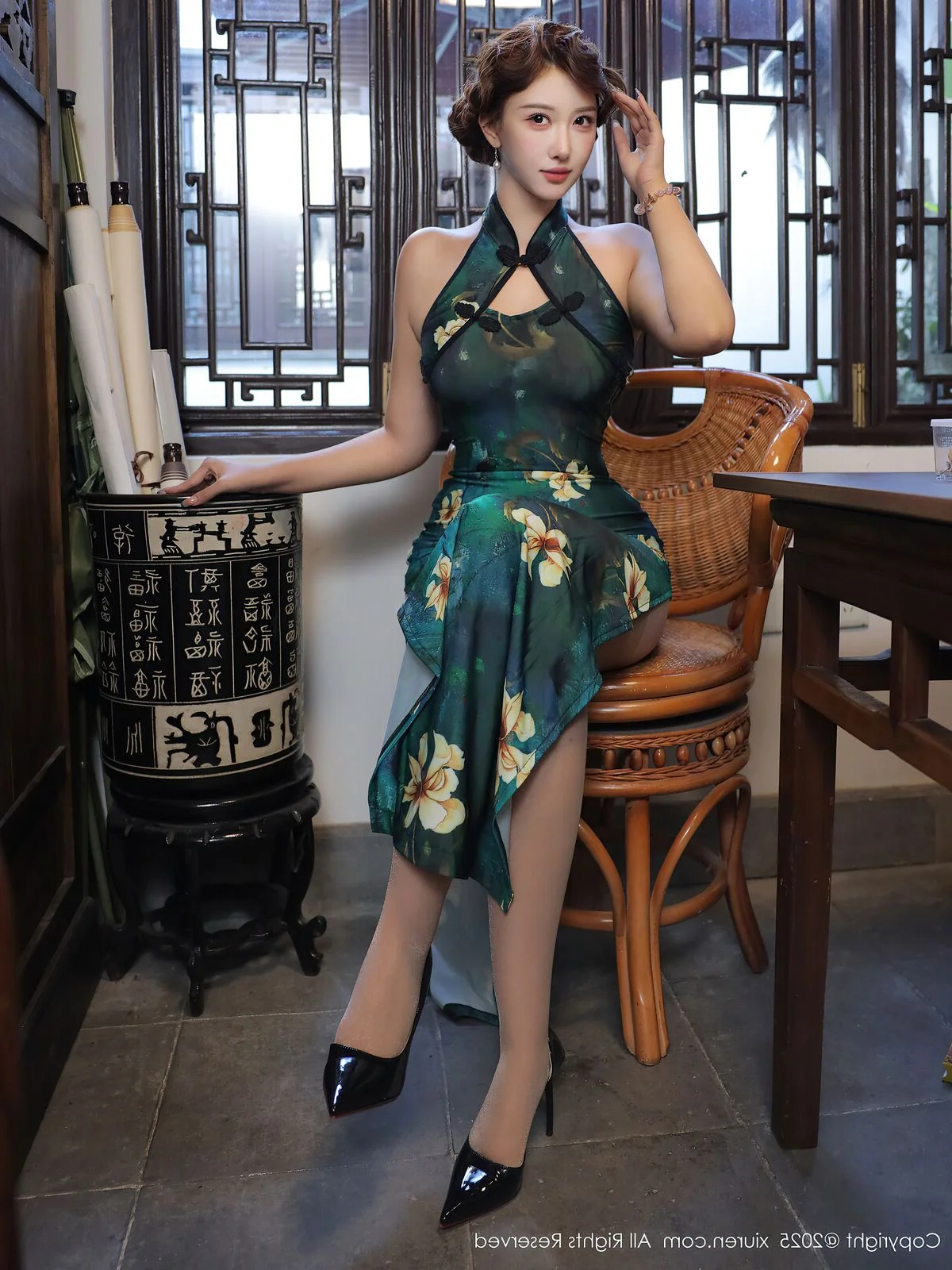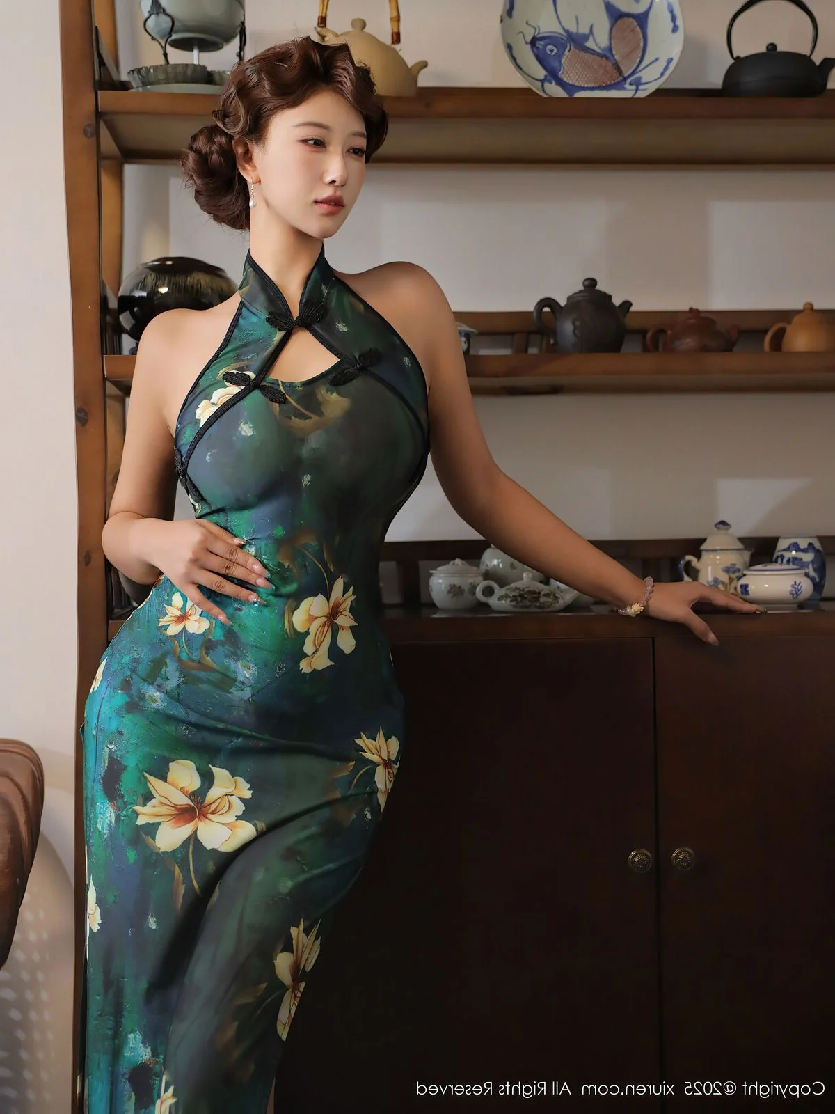 Stepping into a world where time seems to stand still, Jin Yun Xi Yuki embodies the ultimate fusion of tradition and modernity in this captivating No.10815 series. Dressed in a stunning emerald green modern Cheongsam, the deep teal silk is beautifully contrasted by delicate white floral patterns that seem to bloom under the soft ambient light. The silhouette is a masterclass in fashion, featuring a sophisticated halter-neck design that highlights her graceful posture and radiant skin. Yuki’s expression is one of quiet confidence and poetic stillness, especially as she holds a traditional scroll, adding an intellectual depth to her visual allure. The wooden lattice background and vintage props create a nostalgic atmosphere, reminiscent of classic cinema. Every detail, from the intricate fabric texture to the gentle curve of her smile, evokes a sense of refined beauty and artistic elegance. This collection is a beautiful tribute to heritage, reimagined for the contemporary eye with effortless style and soul.#ClassicBeauty #QipaoStyle #JinYunXiYuki #NostalgicVibe #FashionPhotography