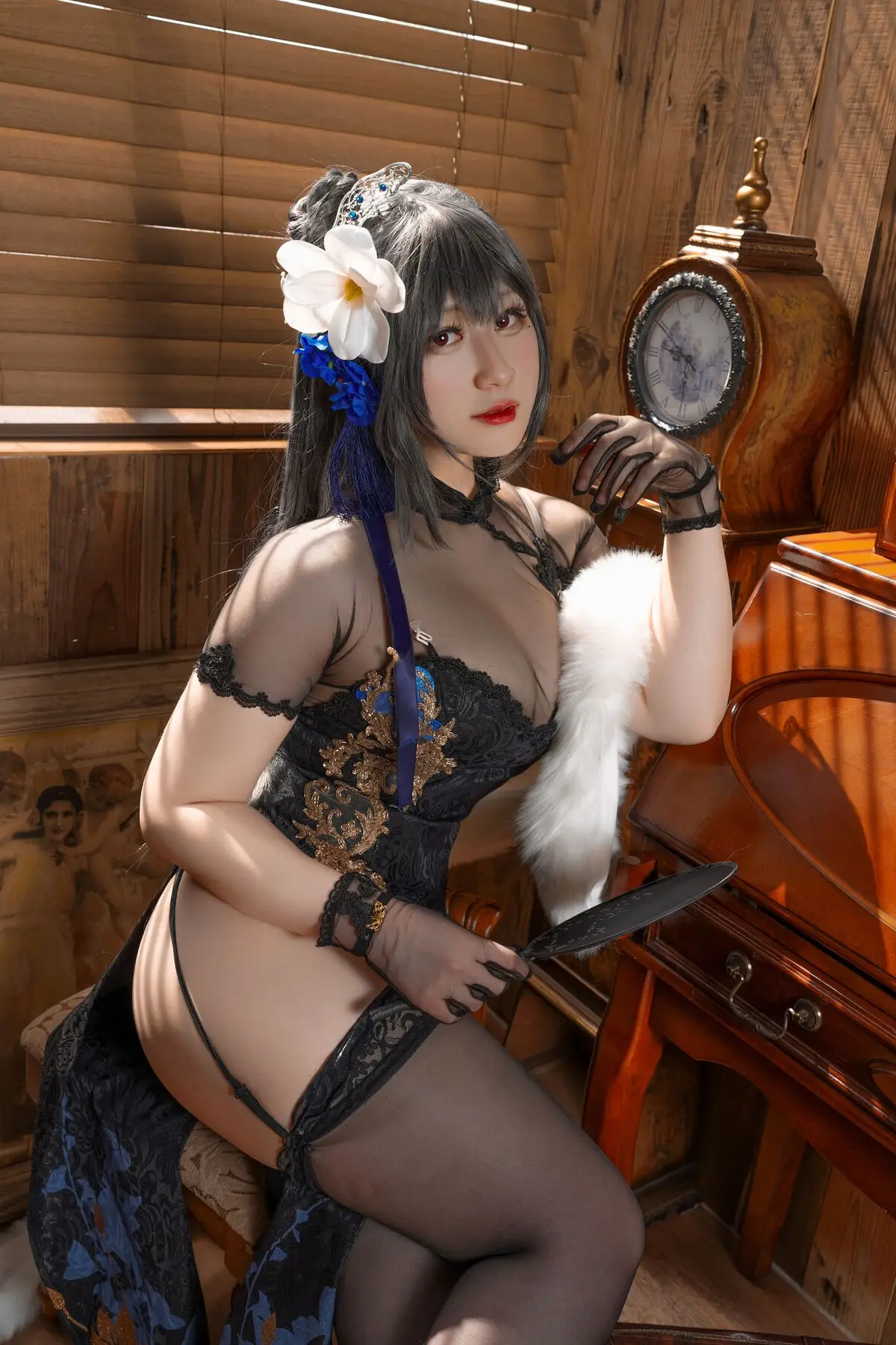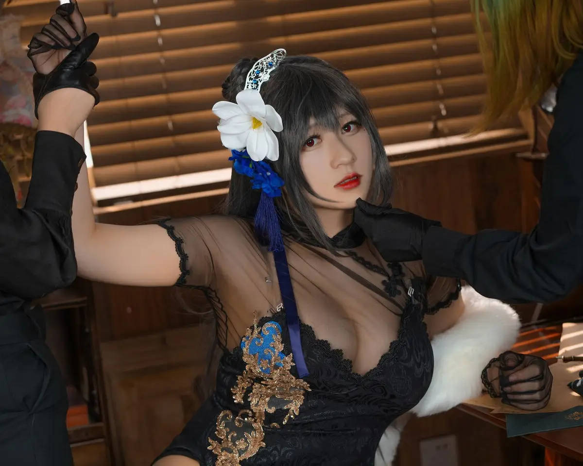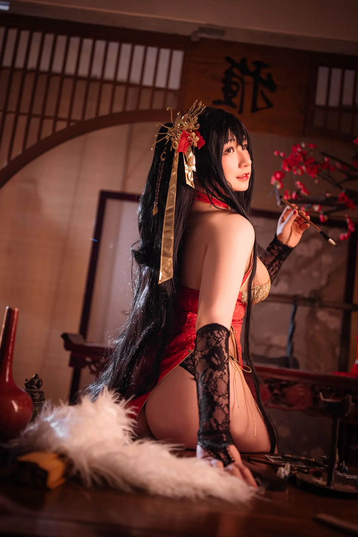 Immerse yourself in the captivating allure of Coser Zyra Aki as the stunning Taihou. Dressed in a vibrant red cheongsam adorned with intricate details and soft feather accents Zyra Aki perfectly embodies the regal and seductive charisma of the character. Her graceful reclining pose on a classic wooden table set against a backdrop of rich Eastern architecture creates a vivid artistic tableau. The subtle lighting further accentuates her elegant silhouette and mysterious gaze sparking intrigue. This is more than just a cosplay session it is a sophisticated blend of performance art and traditional beauty offering an unforgettable visual experience for viewers.