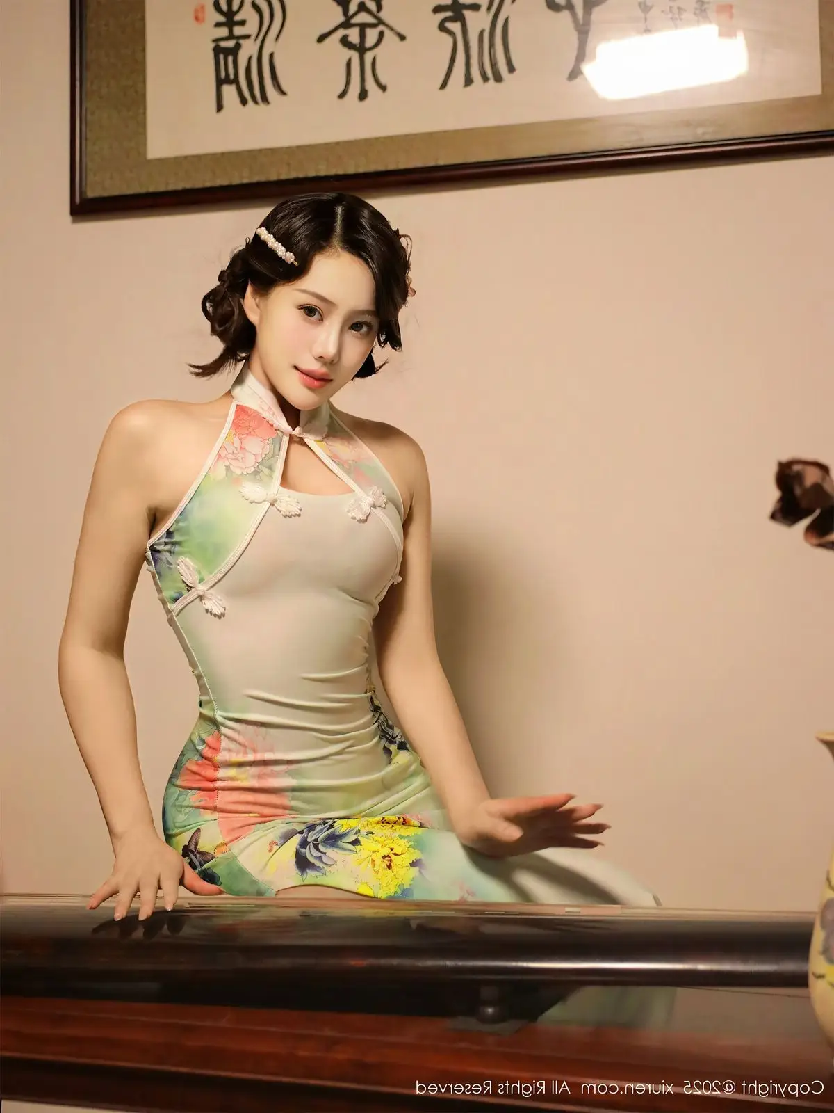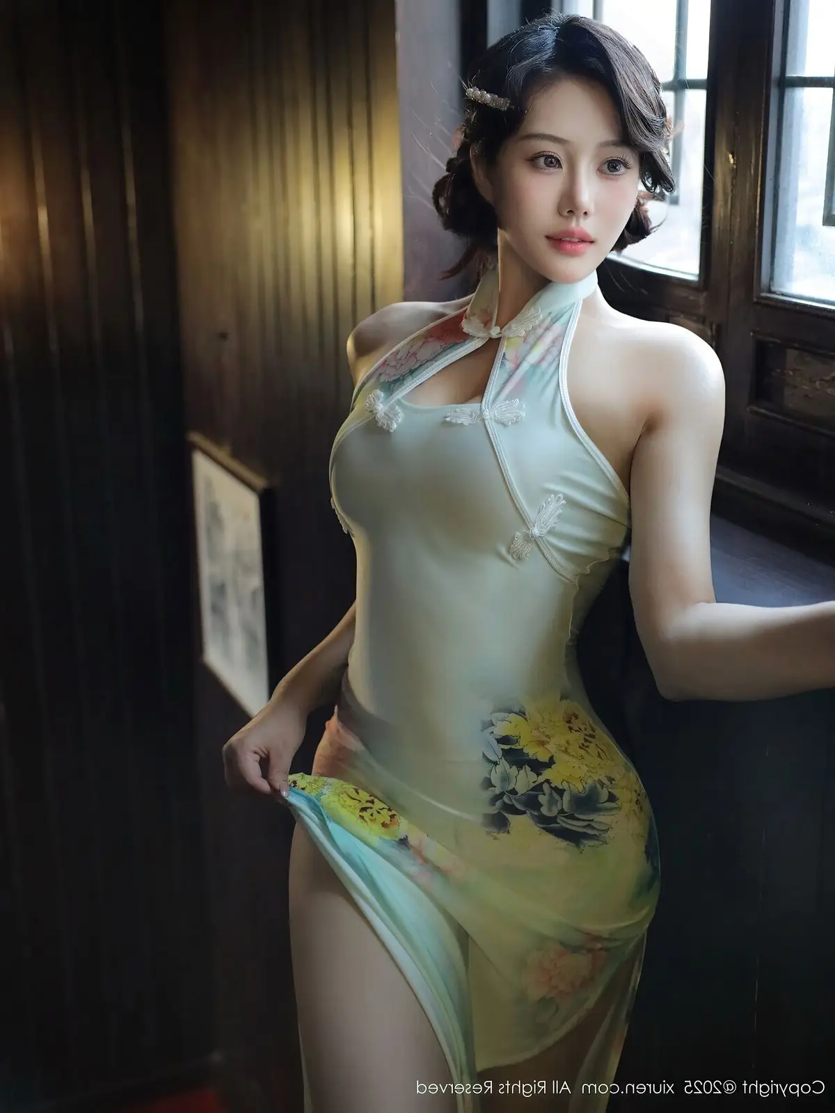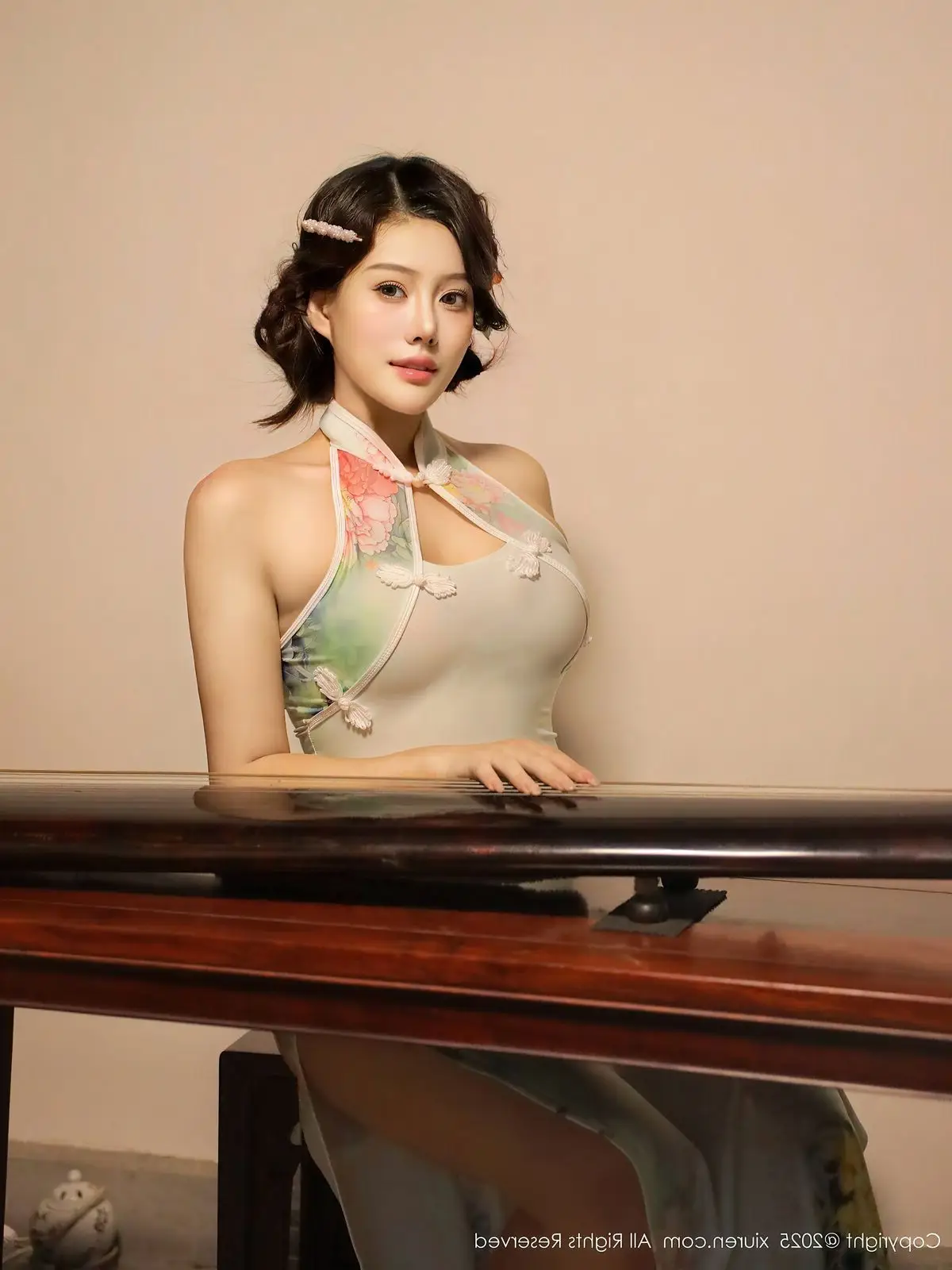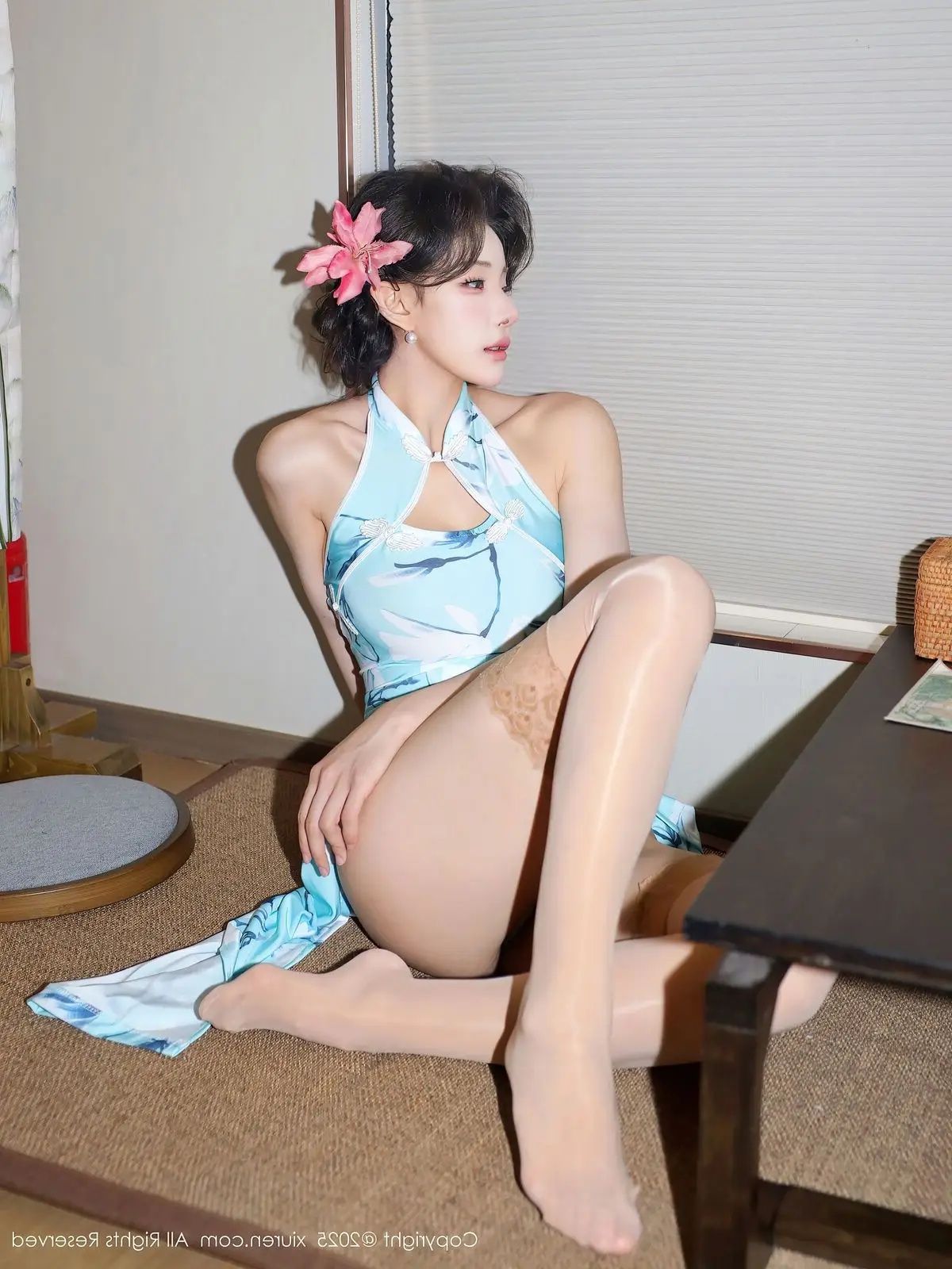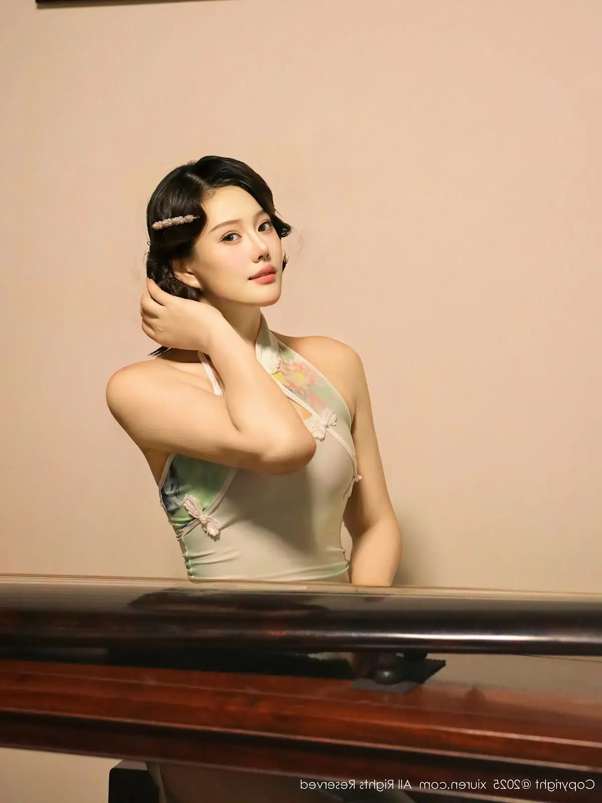 The XiuRen No.10594 collection features model Li Shuang Er, exuding a refined and captivating beauty. She poses gracefully in a light aqua cheongsam adorned with delicate bamboo or lotus patterns, accentuating her soft figure. The modern halter-neck design, combined with smooth silk fabric, elevates her sophisticated aura while preserving the traditional essence of the attire. Li Shuang Er's gaze conveys confidence and allure, complemented by her softly curled hair and floral hairpins, creating a harmonious blend of classic elegance and contemporary flair. The simple yet cozy indoor setting further highlights her pure and vibrant beauty, inviting viewers to explore this unique style.