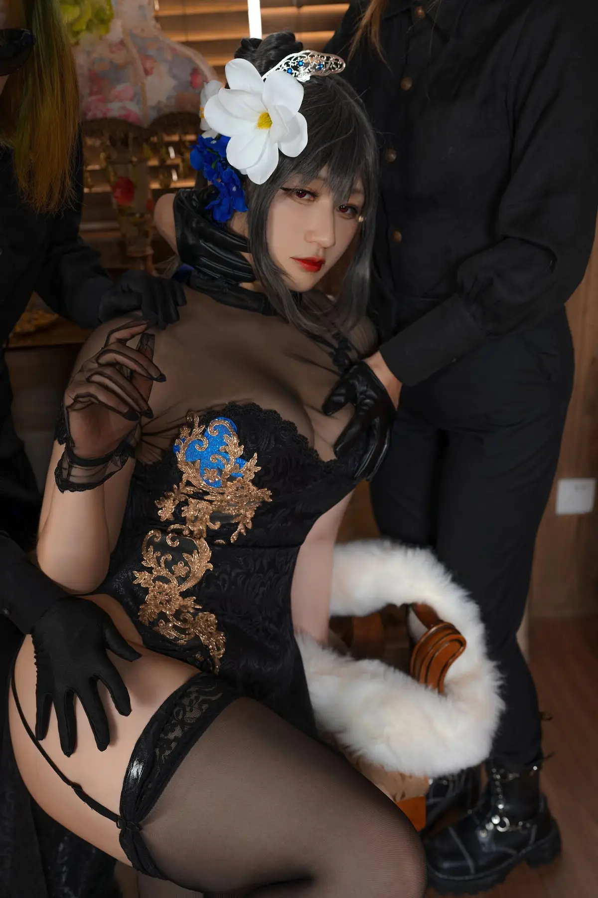In this captivating image Coser Zyra Aki delivers a striking portrayal in the unique Louis IX Qipao exuding both allure and mystery. The exquisite design of the black cheongsam adorned with shimmering gold embroidery gracefully accentuates her elegant figure. Her dark hair complemented by a white floral and blue ribbon accessory frames a sharp expressive face. Zyra Aki's compelling expression coupled with the dramatic setting where she appears to be restrained weaves a fascinating and thought-provoking narrative. This is a masterful cosplay performance showcasing meticulous attention to costume detail and exceptional character embodiment destined to captivate all who behold it.