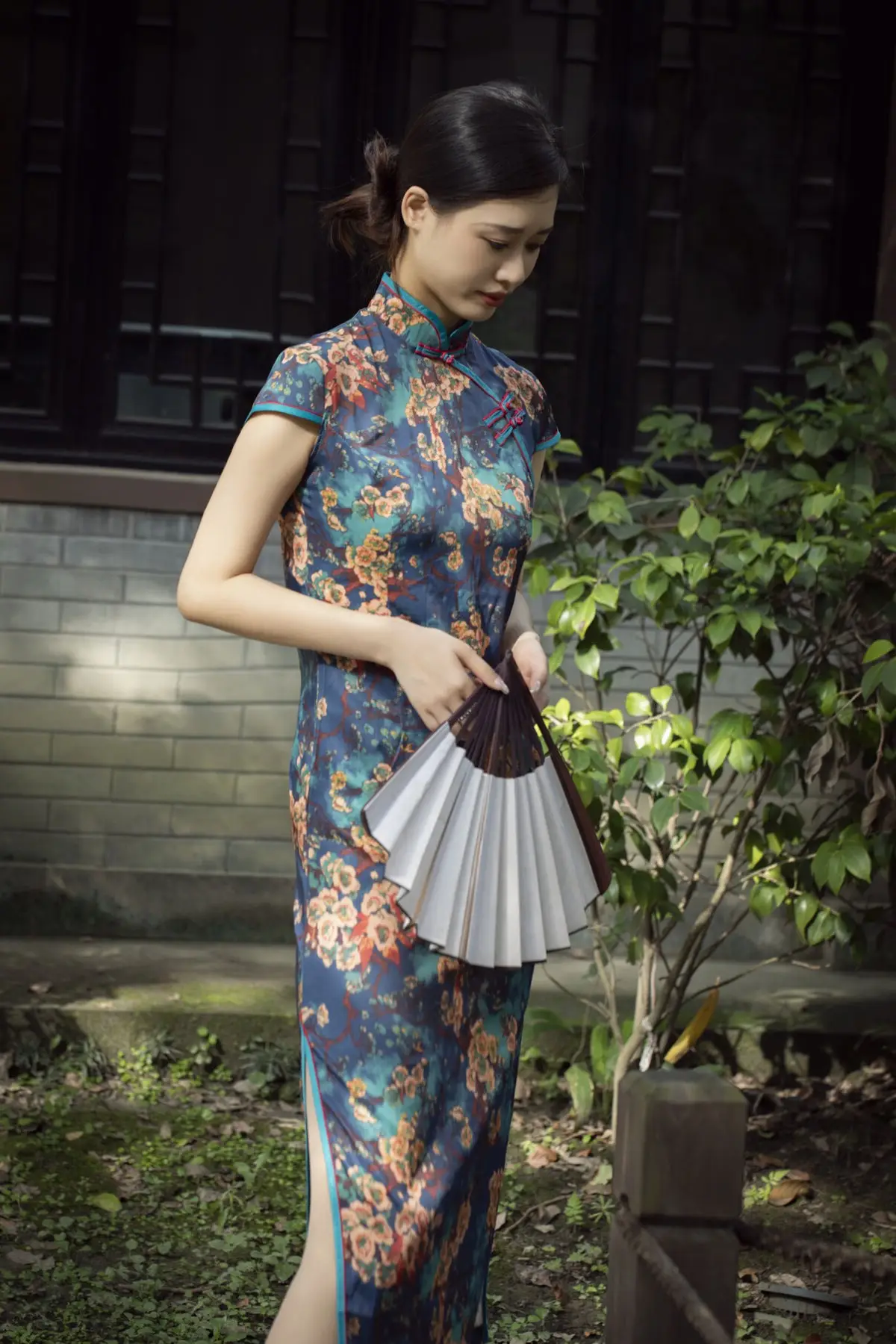 This photo captures the serene and graceful beauty of an Asian woman in a dark blue cheongsam. The exquisitely designed cheongsam features subtle patterns perfectly accentuating her slender figure and alluring curves. A traditional hand fan held casually and a delicate blue flower adorning her hair complete a harmonious and poetic ensemble. With a confident demeanor and captivating gaze the woman exudes a noble aura evoking classic beauty yet with a modern touch. The ancient architectural background further highlights the timeless elegance of both the attire and the individual. This image is a perfect blend of traditional charm and contemporary style.