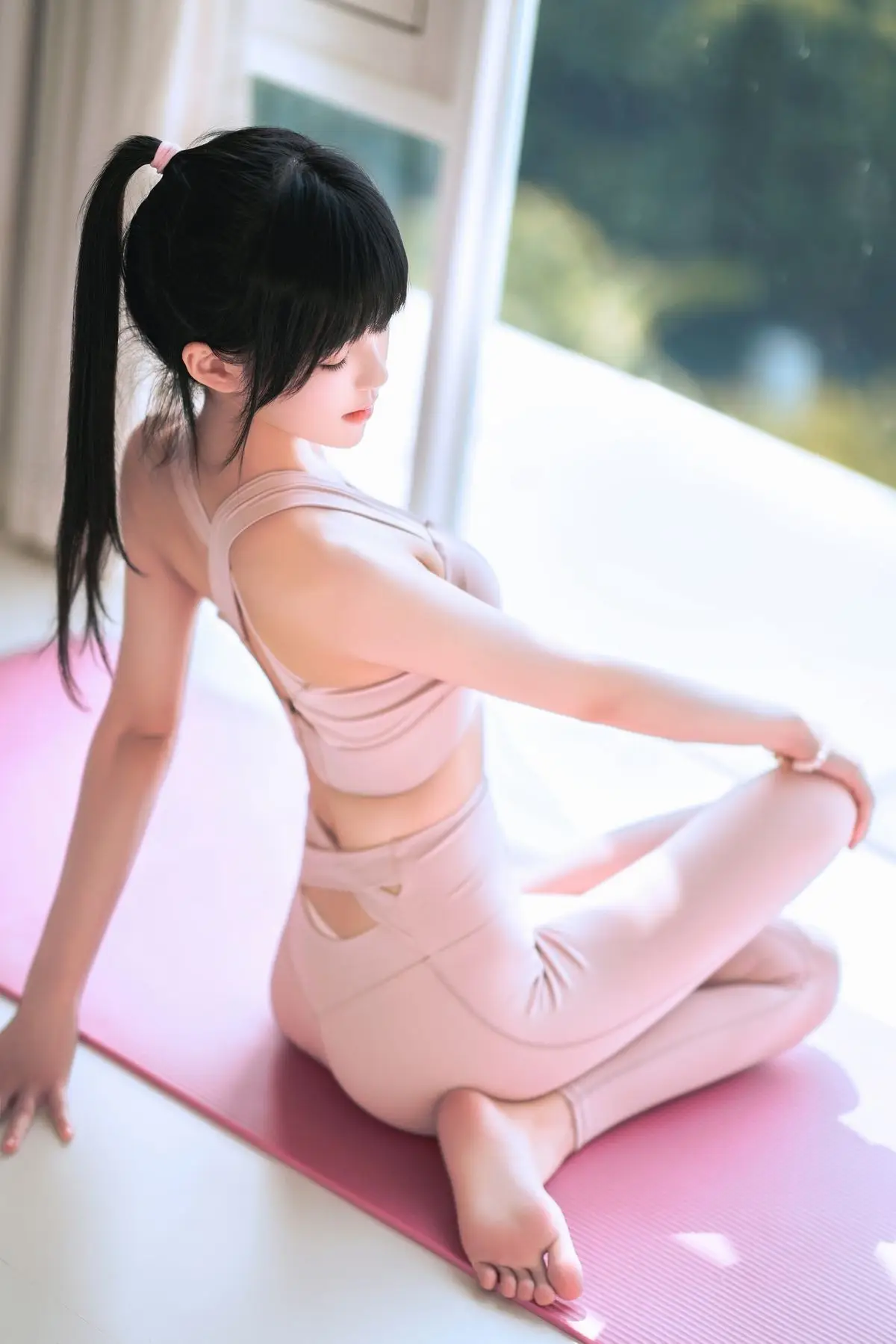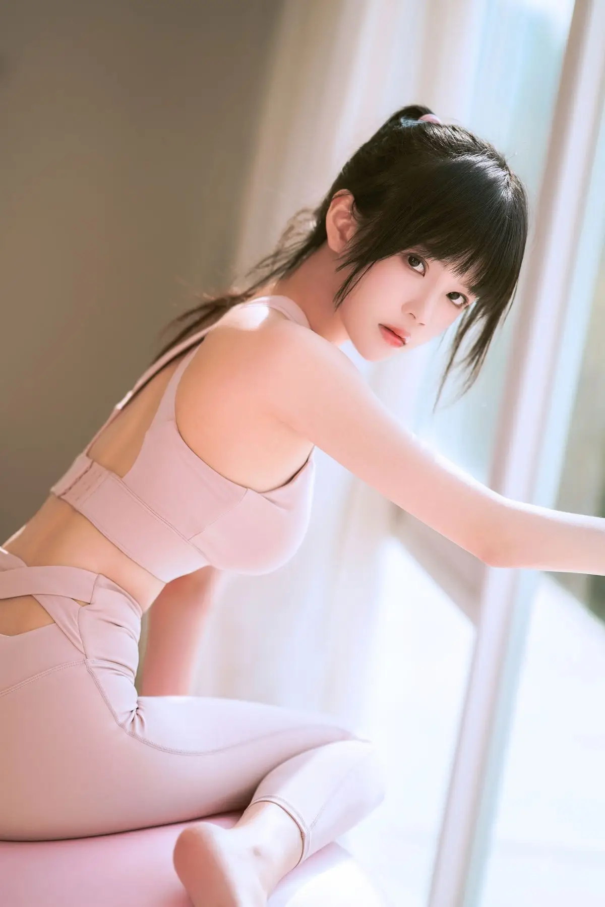 This captivating image features Coser@Cherry Meow (桜桃喵) in a delicate pastel pink yoga outfit. She gracefully poses on a matching pink exercise ball, radiating an ethereal beauty and healthy glow. Soft natural light from the window highlights her fair skin and silky dark hair. With a direct and expressive gaze, Coser@Cherry Meow conveys a sense of serene confidence. The form-fitting yoga wear accentuates her balanced physique, hinting at an active and vibrant lifestyle. This portrayal is not just about fashion; it's an inspiring glimpse into balance, natural elegance, and the allure of a fit persona.#CoserCherryMeow #YogaWear #FitnessFashion #HealthyBeauty #YogaLife