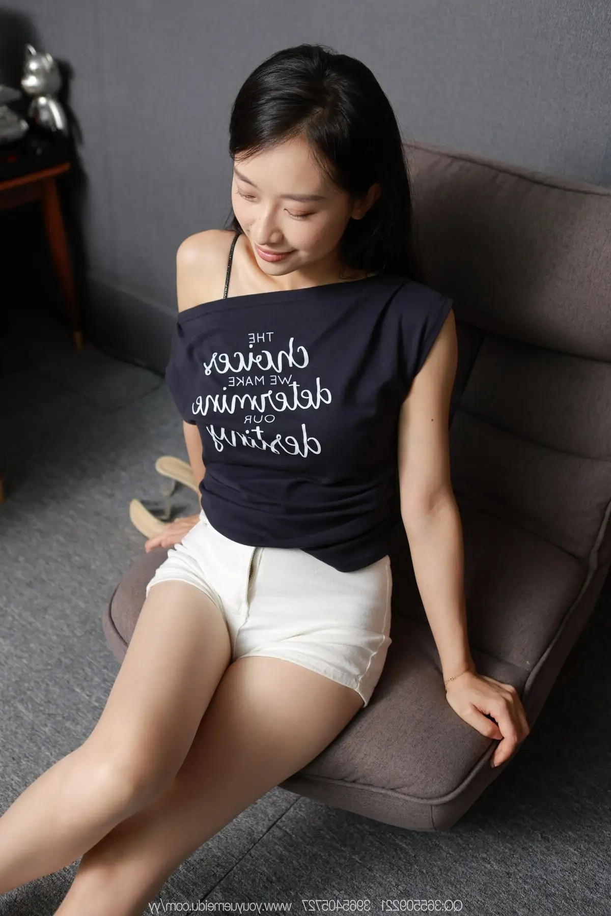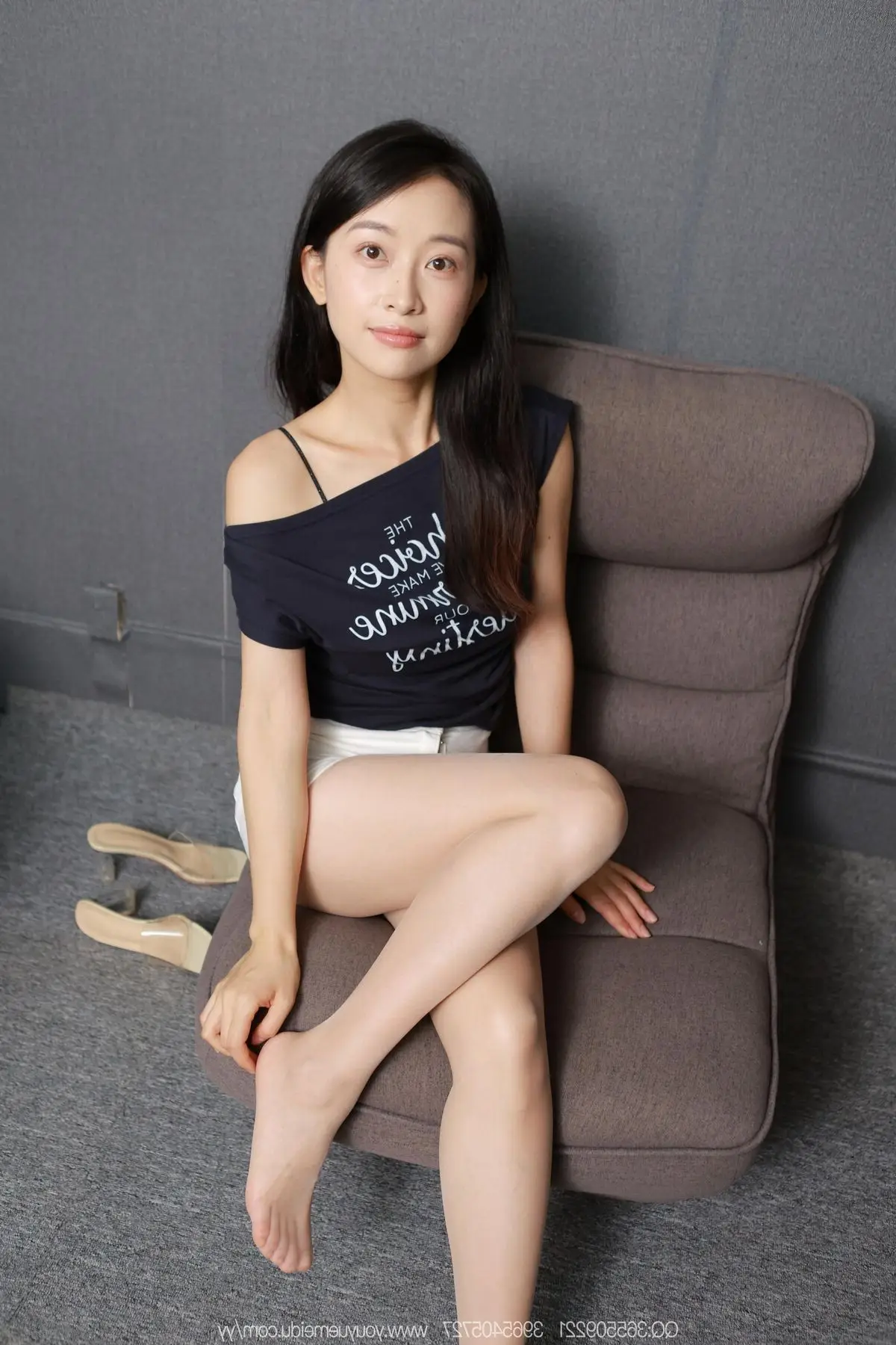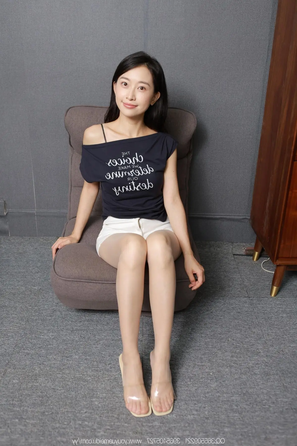 The IESS SXJ No.2142 photo collection proudly features model Mei Ko, an embodiment of elegant and professional beauty. Dressed in a pristine white shirt paired with a chic charcoal grey mini skirt, Mei Ko exudes confidence and modern sophistication. Her sheer black stockings and sleek flats add a touch of subtle allure, perfecting an captivating office-chic aesthetic. Every gesture, from her gentle lean against the armchair to her direct gaze, conveys grace and highlights a harmonious blend of traditional East Asian charm with contemporary fashion. This is a truly evocative and artistic photoshoot.