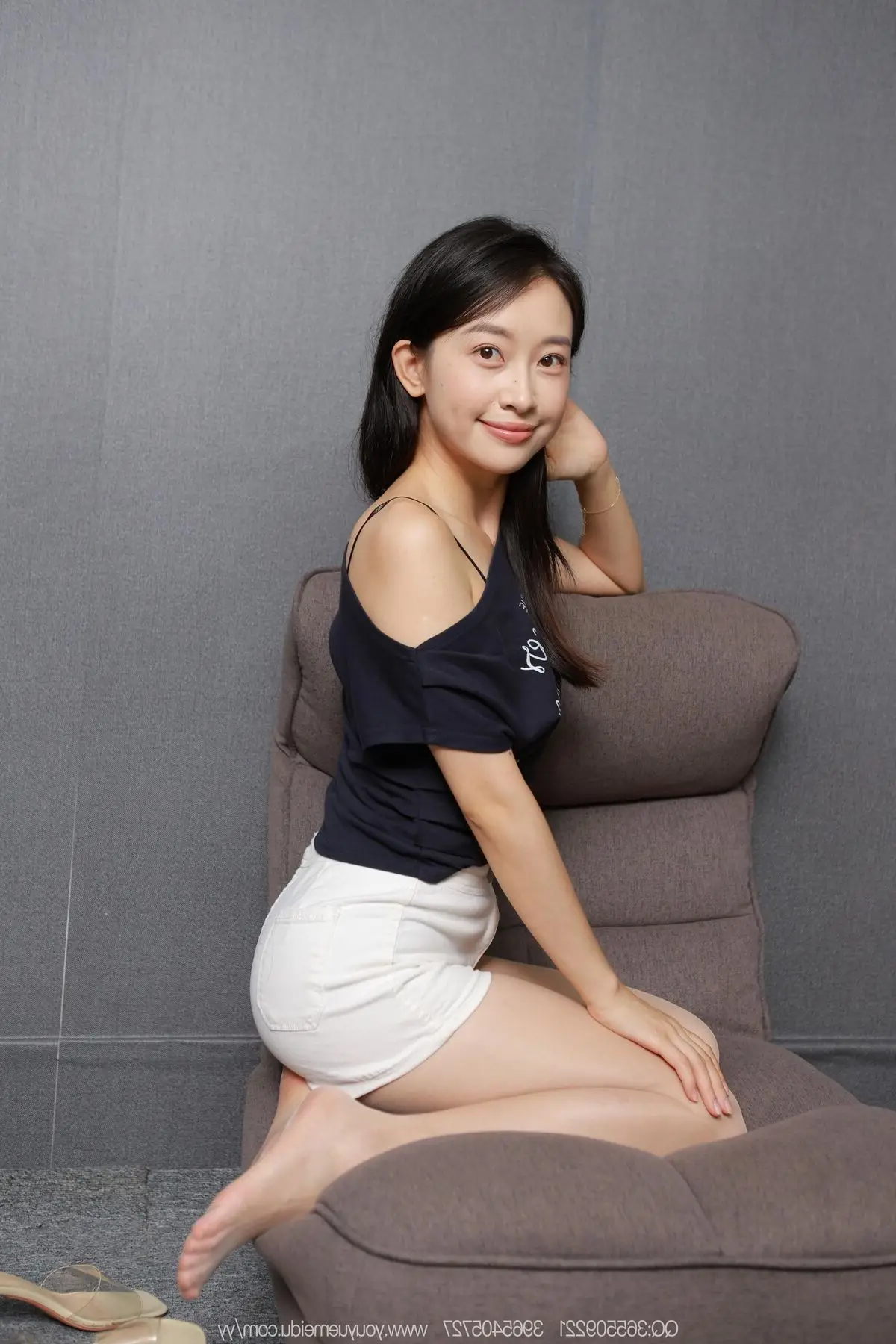 In this captivating IESS SXJ No.2124 Part02 feature, model Tuan Tuan radiates an elegant and alluring charm. She is adorned in a sophisticated navy blue lace mini-dress, featuring an off-shoulder design and long, form-fitting sleeves that beautifully accentuate her slender figure. Posing gracefully on a chair, Tuan Tuan subtly highlights her long, shapely legs, with one bare foot delicately resting beside a striking blue high heel, creating an intriguing visual contrast. Her direct gaze and gentle expression further enhance her mysterious appeal. This image not only showcases high-end fashion aesthetics but also perfectly captures the confident and graceful demeanor of a professional model, leaving a lasting impression of refined allure.